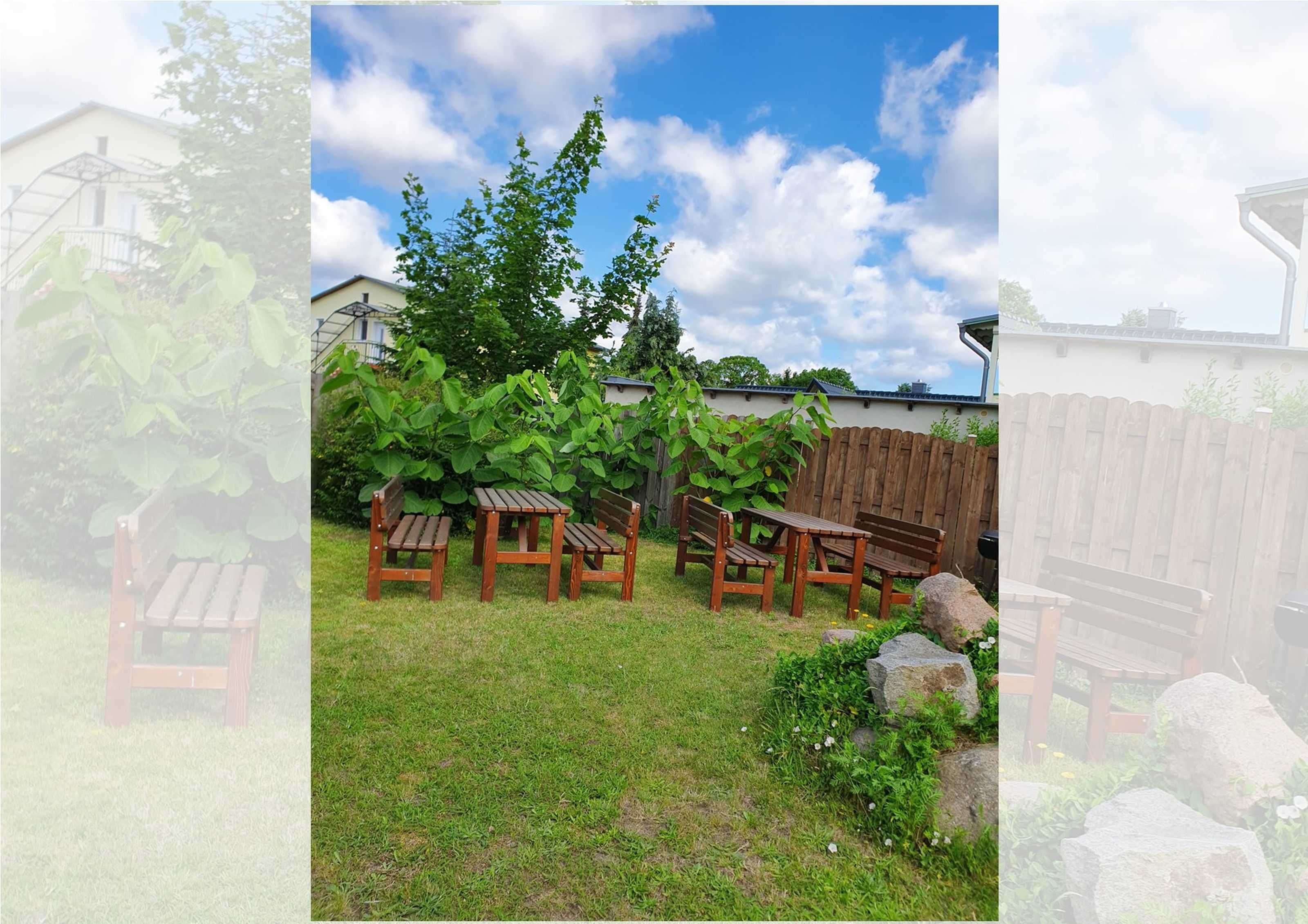 Freibereich im Garten, Grillecke mit Tischen und Bänken vorhanden