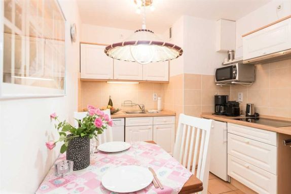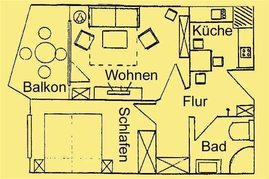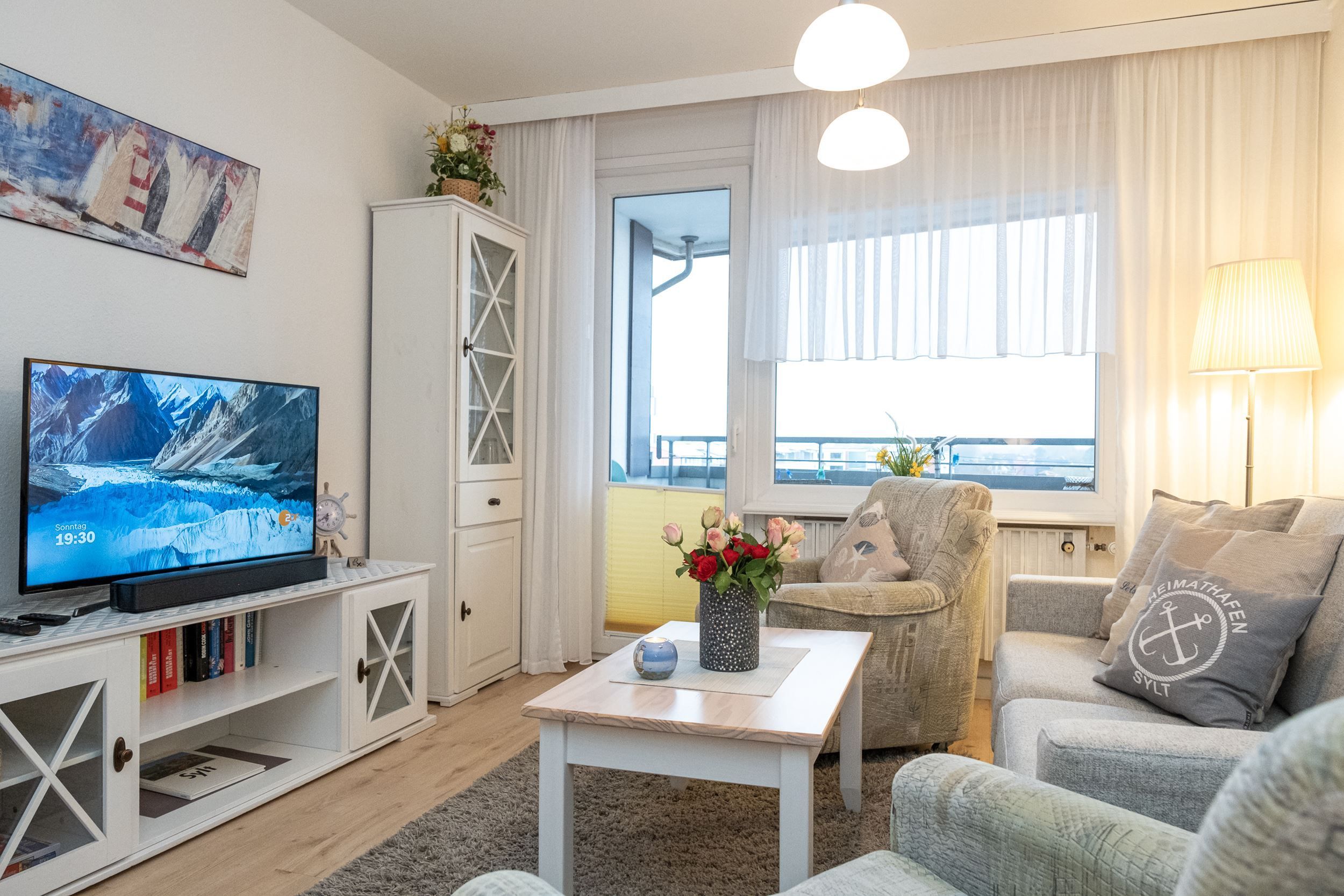 Das lichtdurchflutete Wohnzimmer verfügt über eine neue, moderne Bettcouch, die sich mit wenigen Handgriffen in ein komfortables Bett verwandeln lässt. Sie schlafen auf einer hochwertigen Kaltschaummatratze ( 1,40 x 2,00 m), die auf einem Lattenrost aufliegt. Weiterhin ist das Wohnzimmer mit 2 Sesseln und einem großen Flachbildfernseher ausgestattet. Sowie einem großzügigen Balkon nach Osten mit Balkonmöbel.