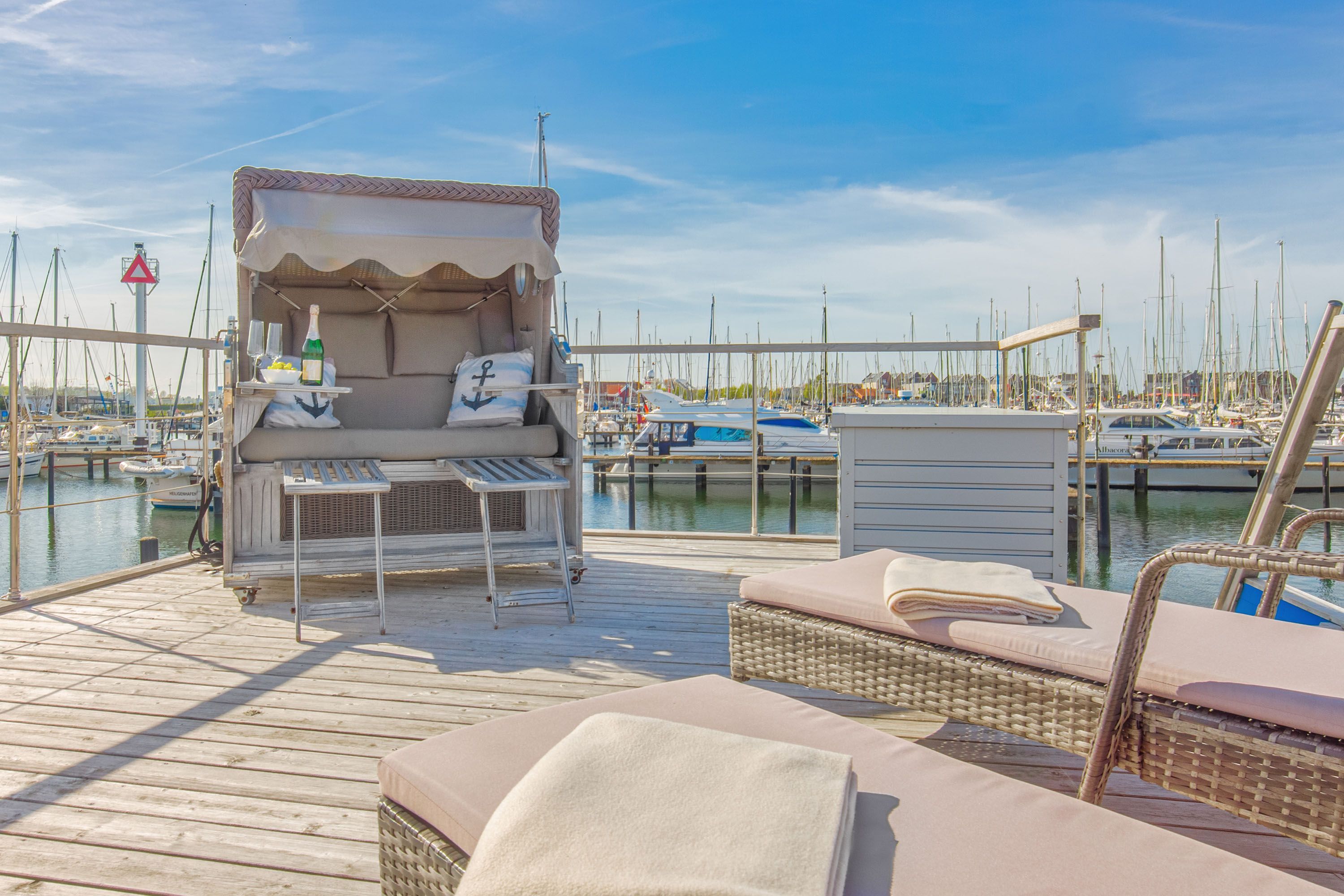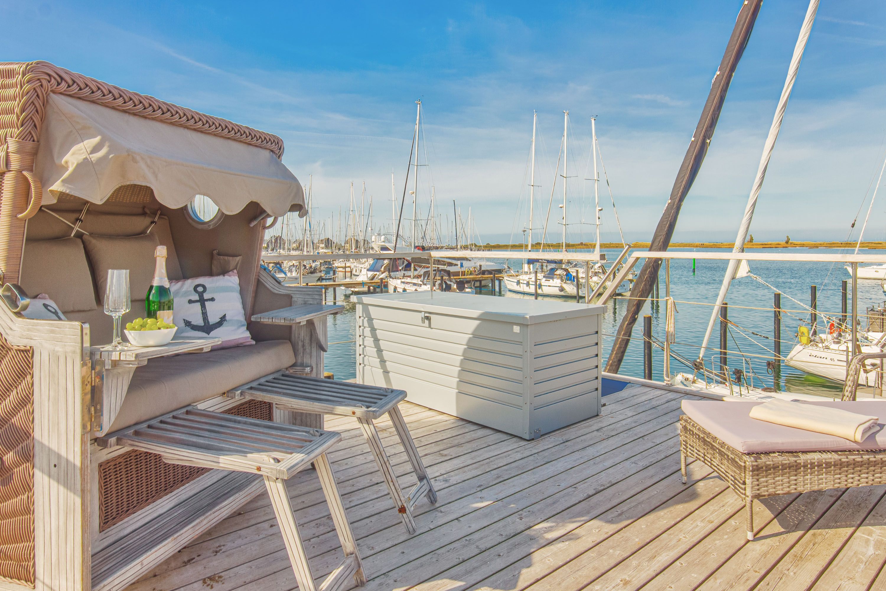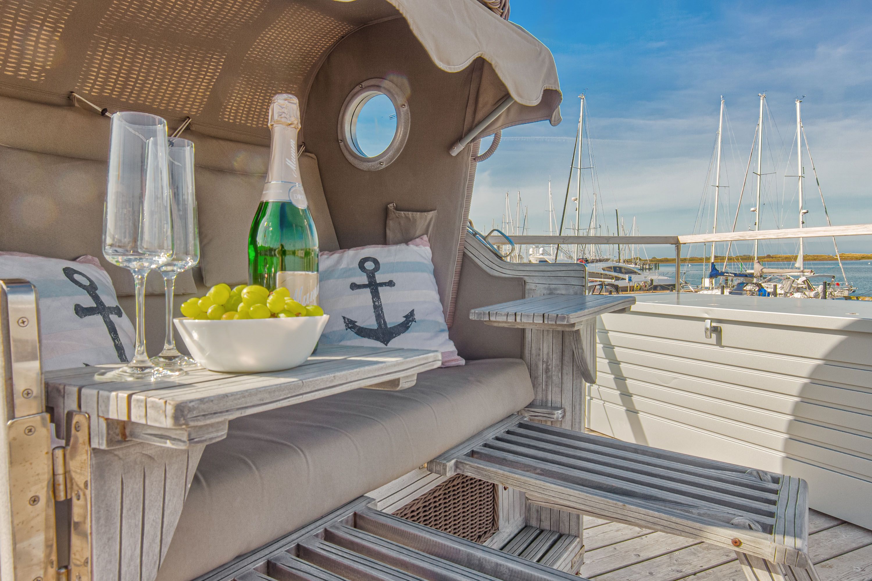 Der offene Wohn und Essbereich lädt zu gemeinsamen Spieleabenden und gemütlichen Stunden ein, mit toller Aussicht auf den Hafen. Erleben Sie einzigartige Sonnenuntergänge in gemütlichen Loungemöbeln oder im Strandkorb vom großen Sonnendeck aus.