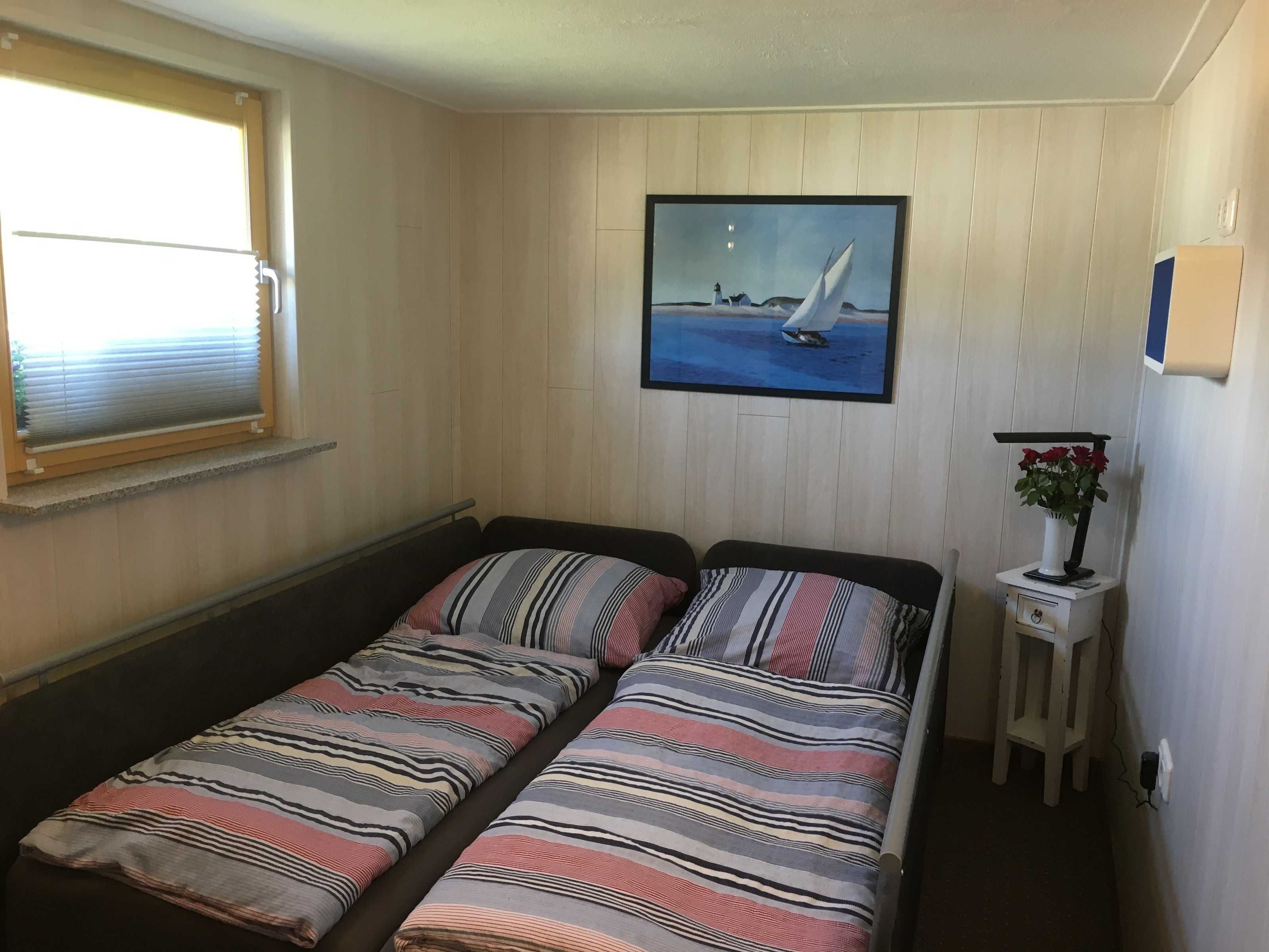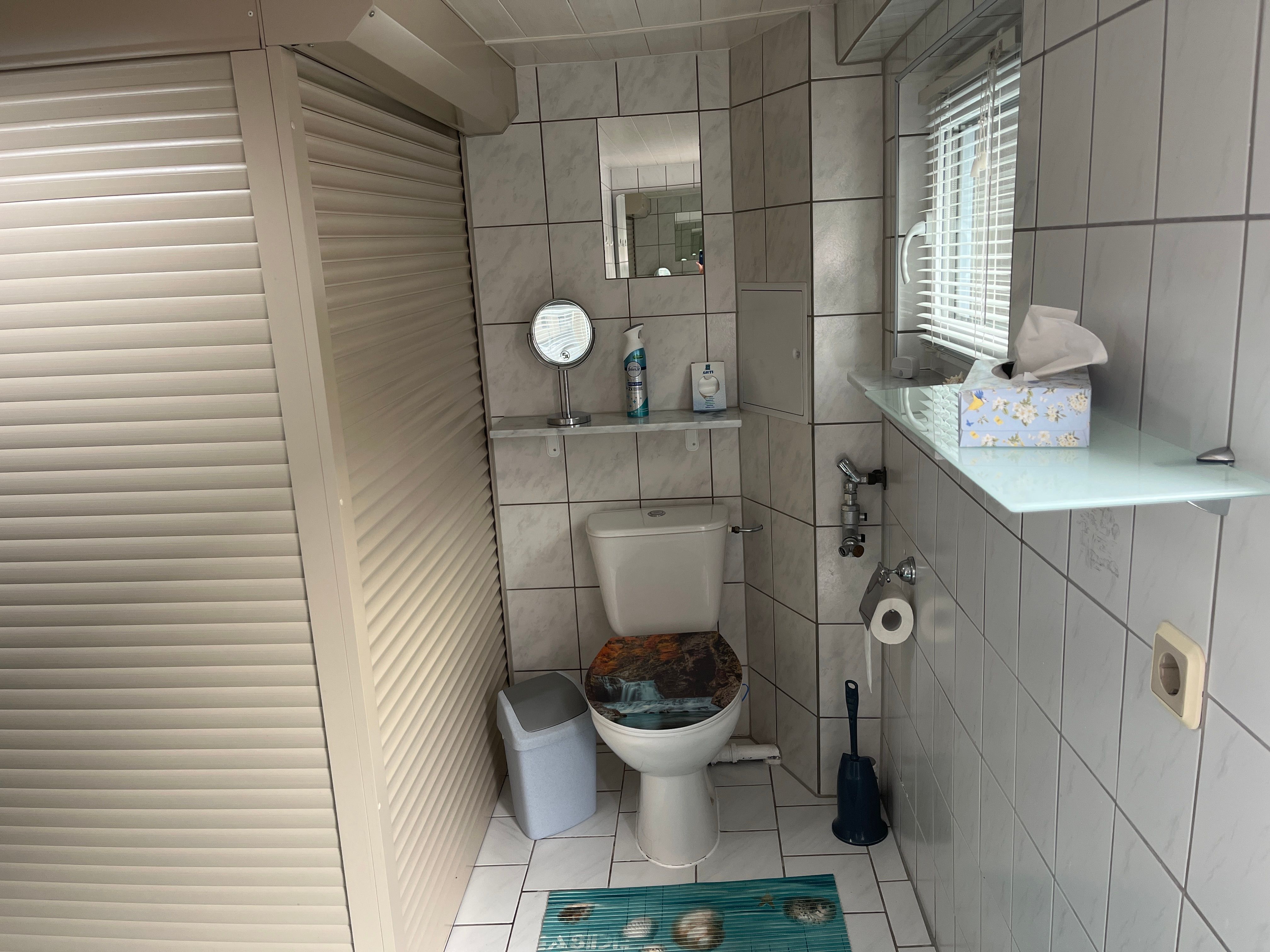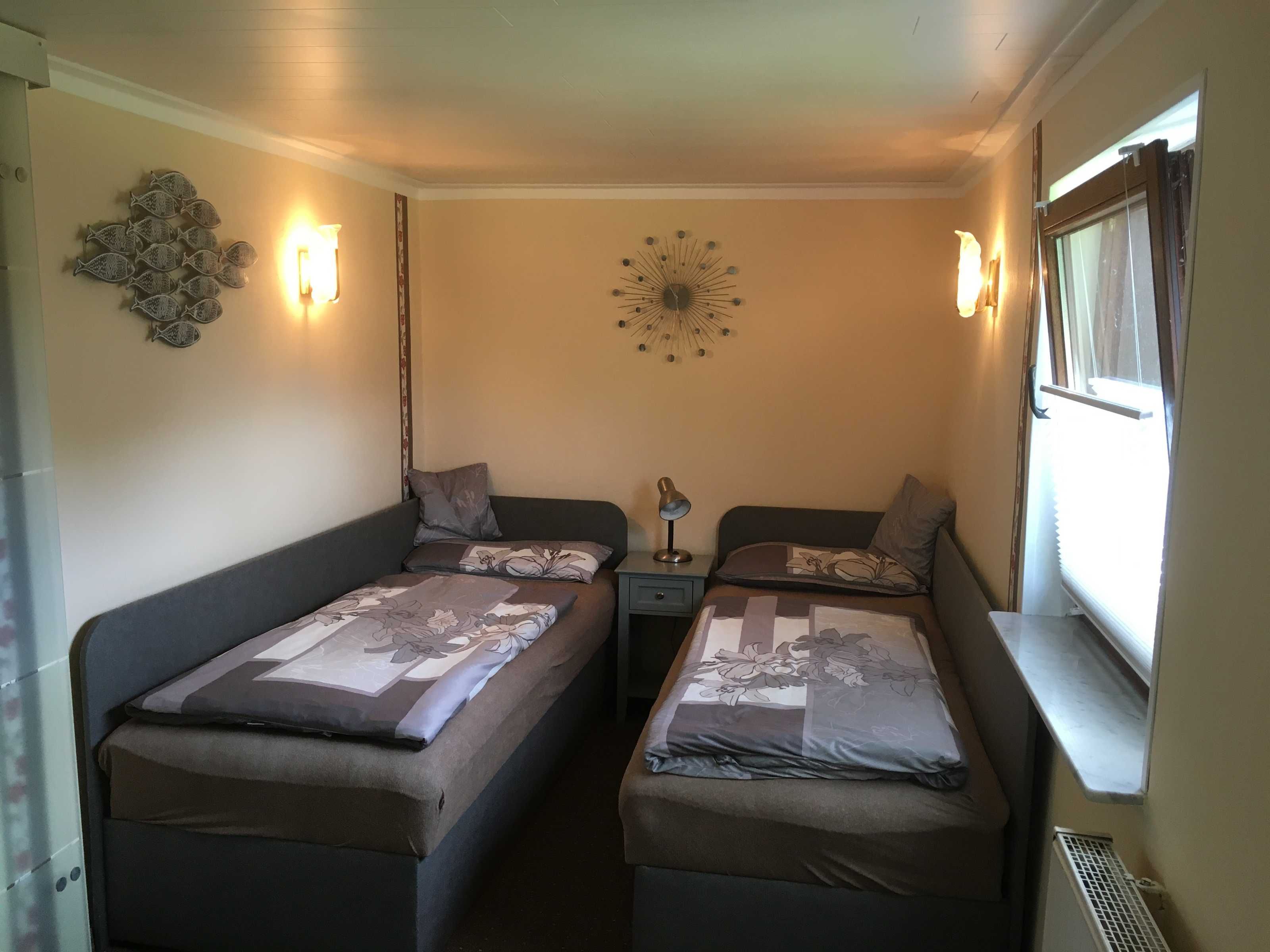 Der Bungalow ist ausgestattet mit 2 Schlafzimmern (2 Einzelbetten und einem Doppelbett auch als Einzelbetten stellbar) verbunden durch eine Schiebetür und einem Wohnraum mit Sat-TV, einem Bad mit Dusche/WC (Fön und Kosmetikspiegel vorhanden) und einer kleinen Küche ausgestattet mit einem 2 Platten-Induktionsfeld, Mikrowelle, Kühl- Gefrierkombination und diversen Küchengeräten. Ruhig gelegen, niedrige Raumhöhe, Böden gefliest, Schlafzimmer mit Teppichböden
