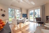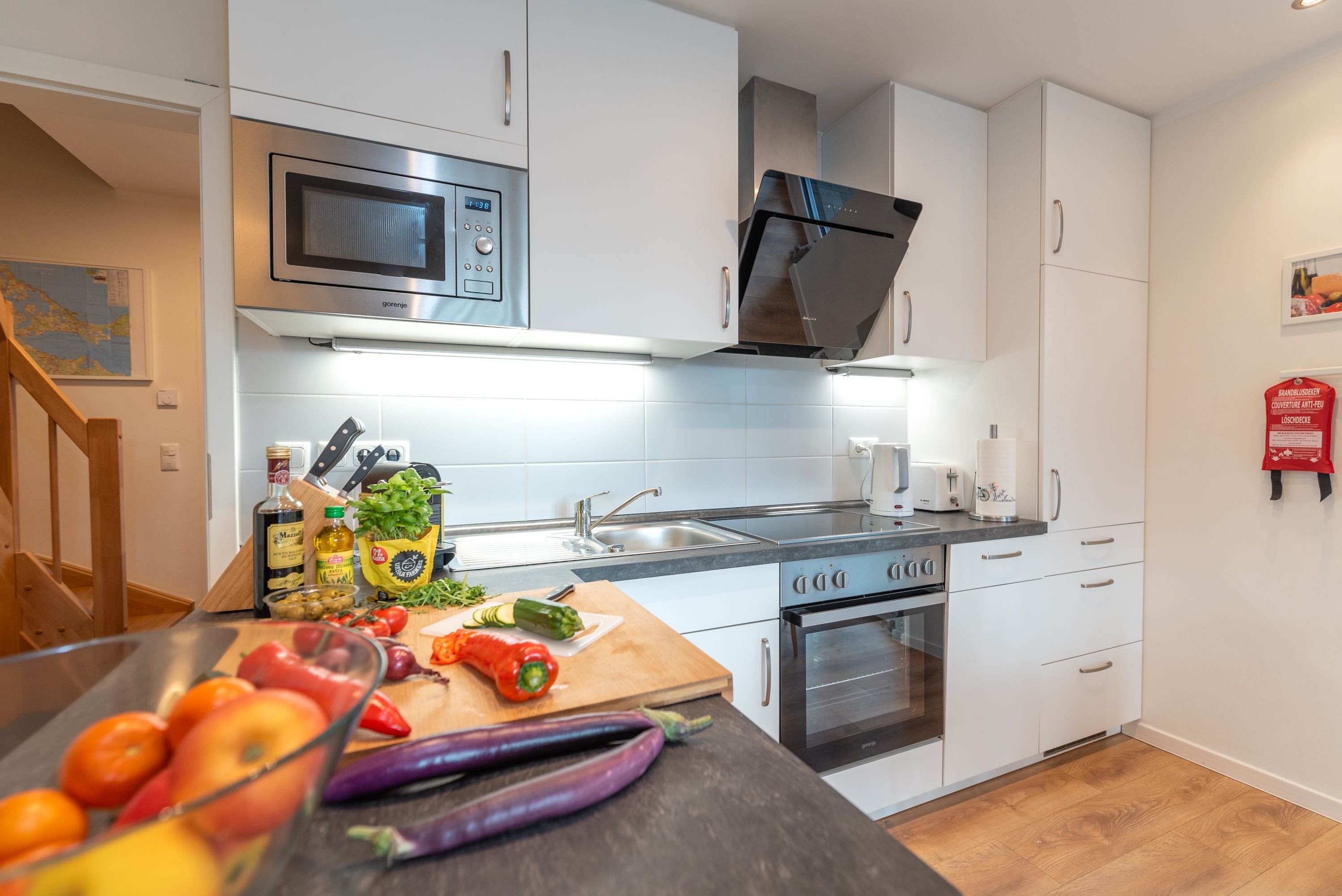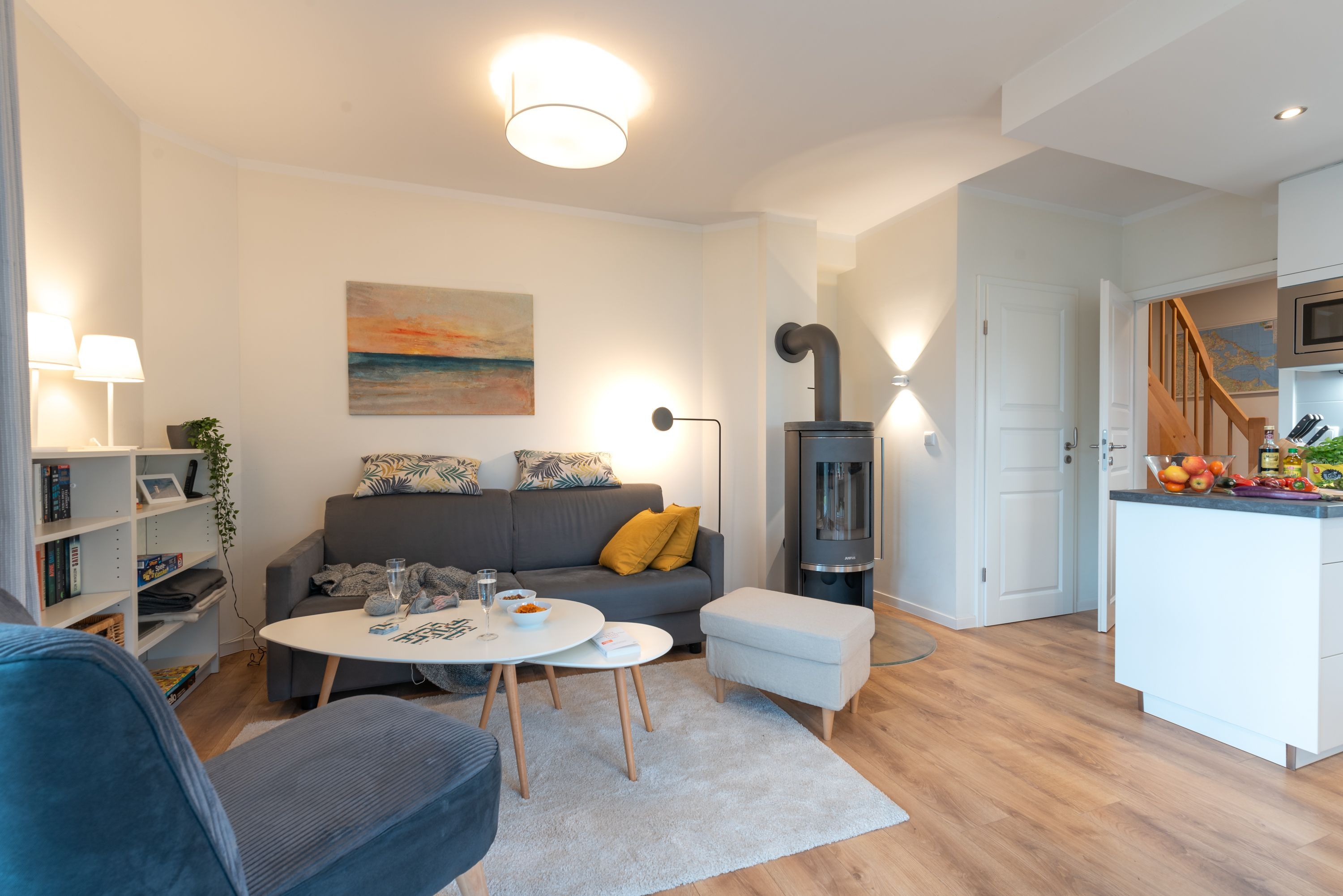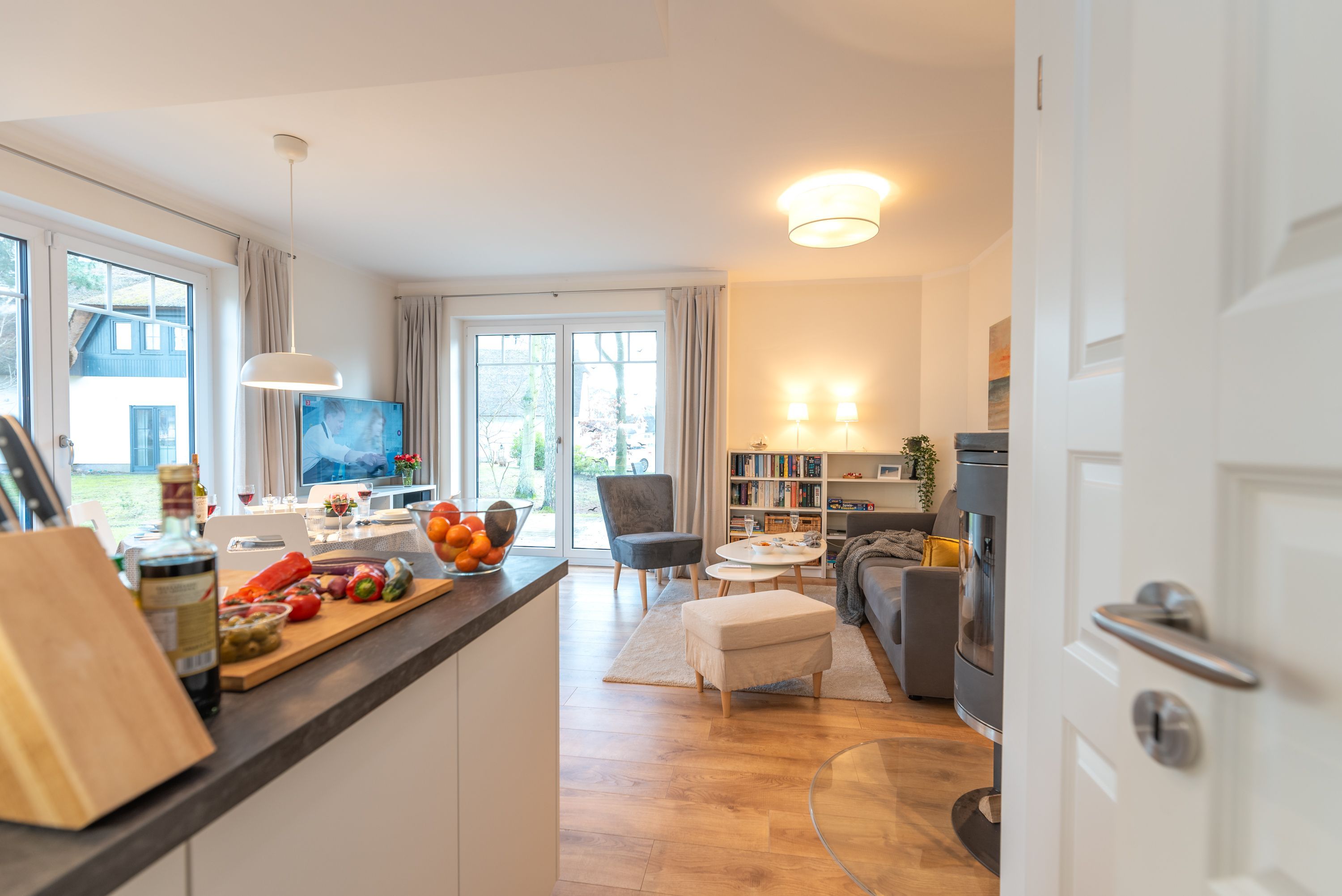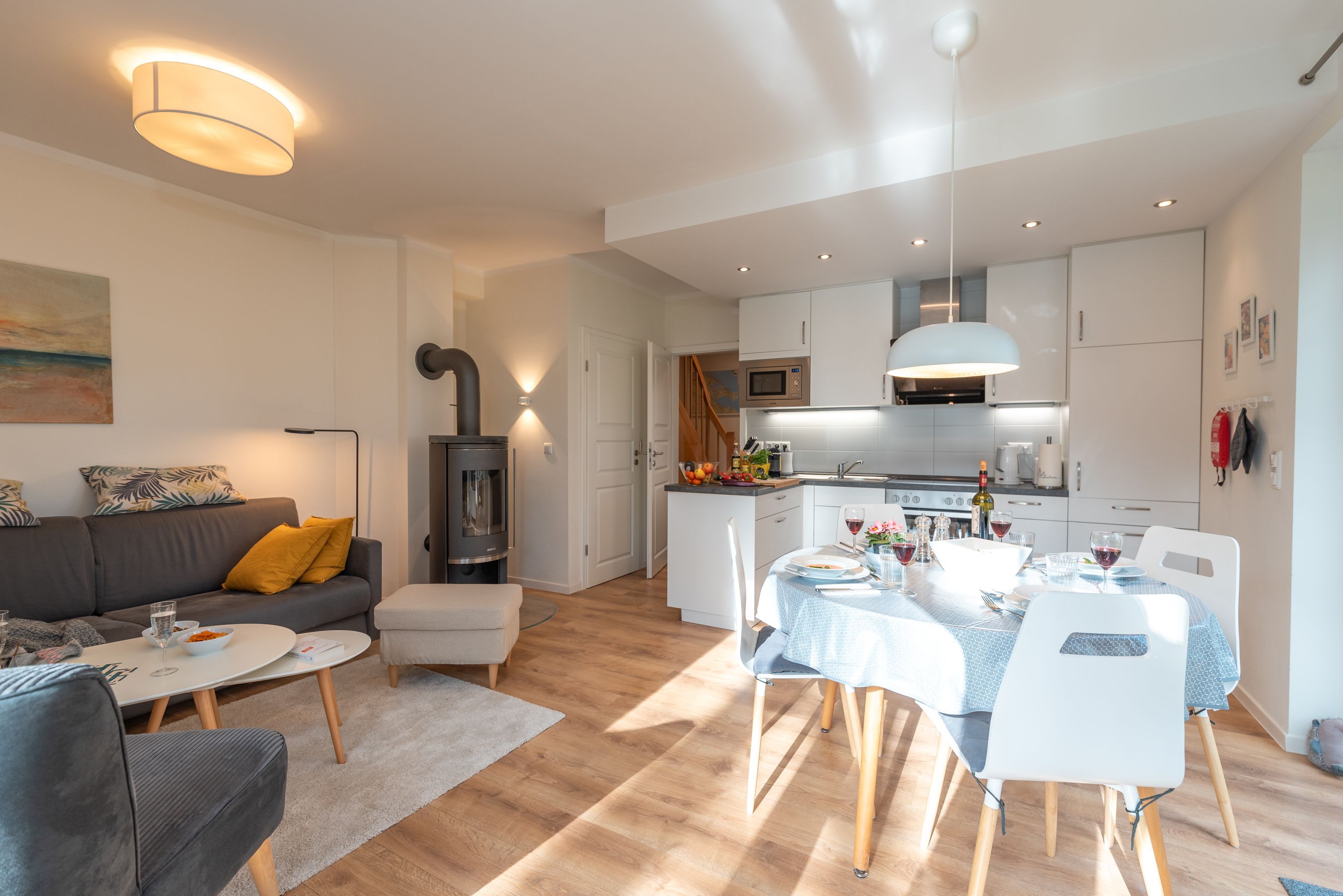 Im Erdgeschoss begru?ßt Sie zunächst ein kleiner Flur mit Garderobe, von dem aus eine Treppe ins Obergeschoss führt sowie ein kleines Bad mit Dusche und Sauna und der großzügige Wohn-Essbereich abgehen. Sofa und Sessel laden zum Entspannen vor dem Kamin oder zu gemütlichen Spieleabenden ein, auch für Leseratten ist gesorgt. Der Fernseher ist mit HDMI ausgestattet. Eine kleine Stereoanlage mit CD Player vervollständigt die Ausstattung. Die Einbauküche enthält alle Gegenstände, die zu einem ausgiebigen Frühstück oder zum Kochen der Mahlzeiten benötigt werden. Mikrowelle und Backofen sorgen fu?r eine schnelle Zubereitung der Gerichte, das kleine Tiefkühlfach für die Vorratshaltung. Die Spülmaschine kümmert sich um den Abwasch. So bleibt mehr Zeit für Muße, den Strand oder Ausflüge in die erlebnisreiche Umgebung.