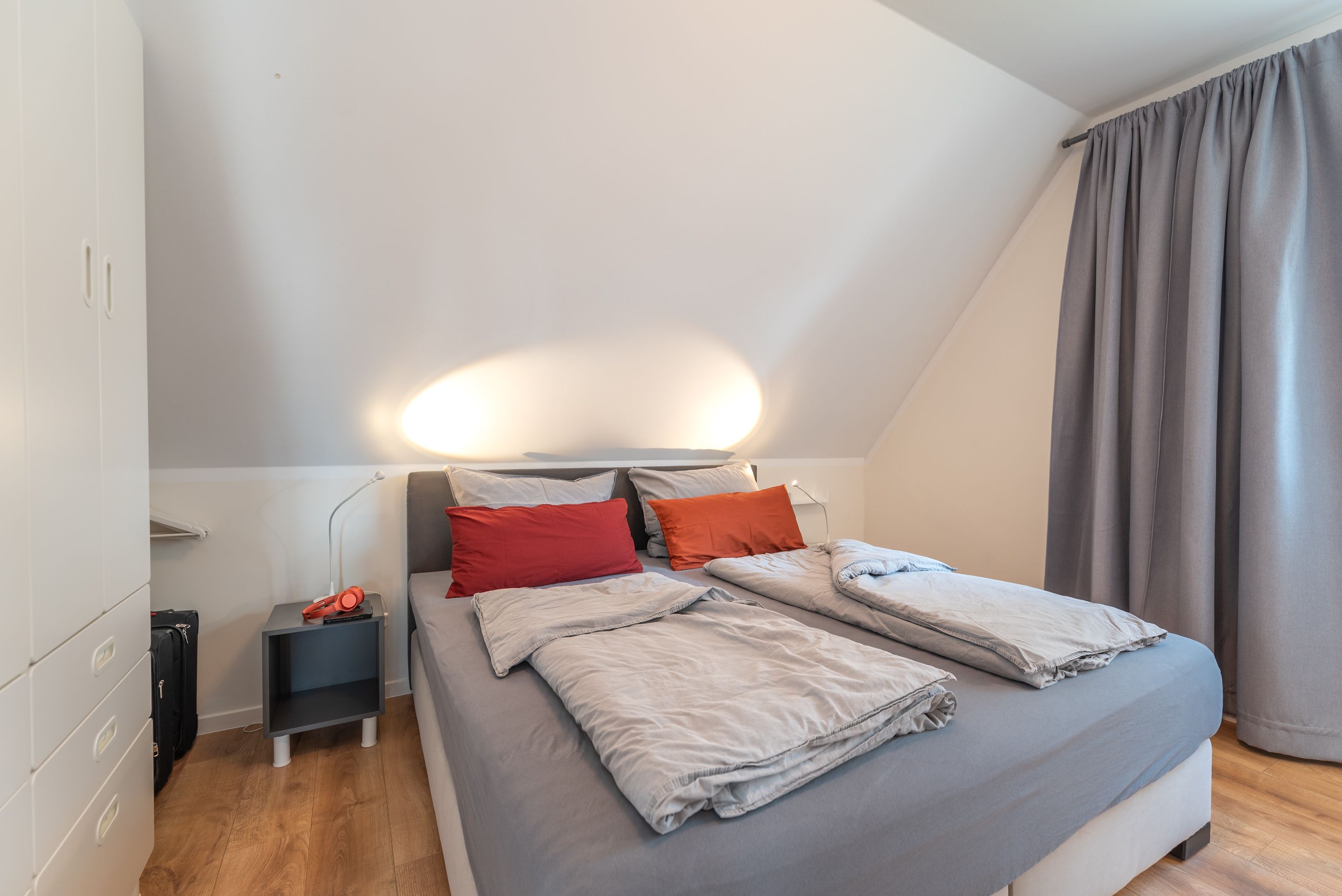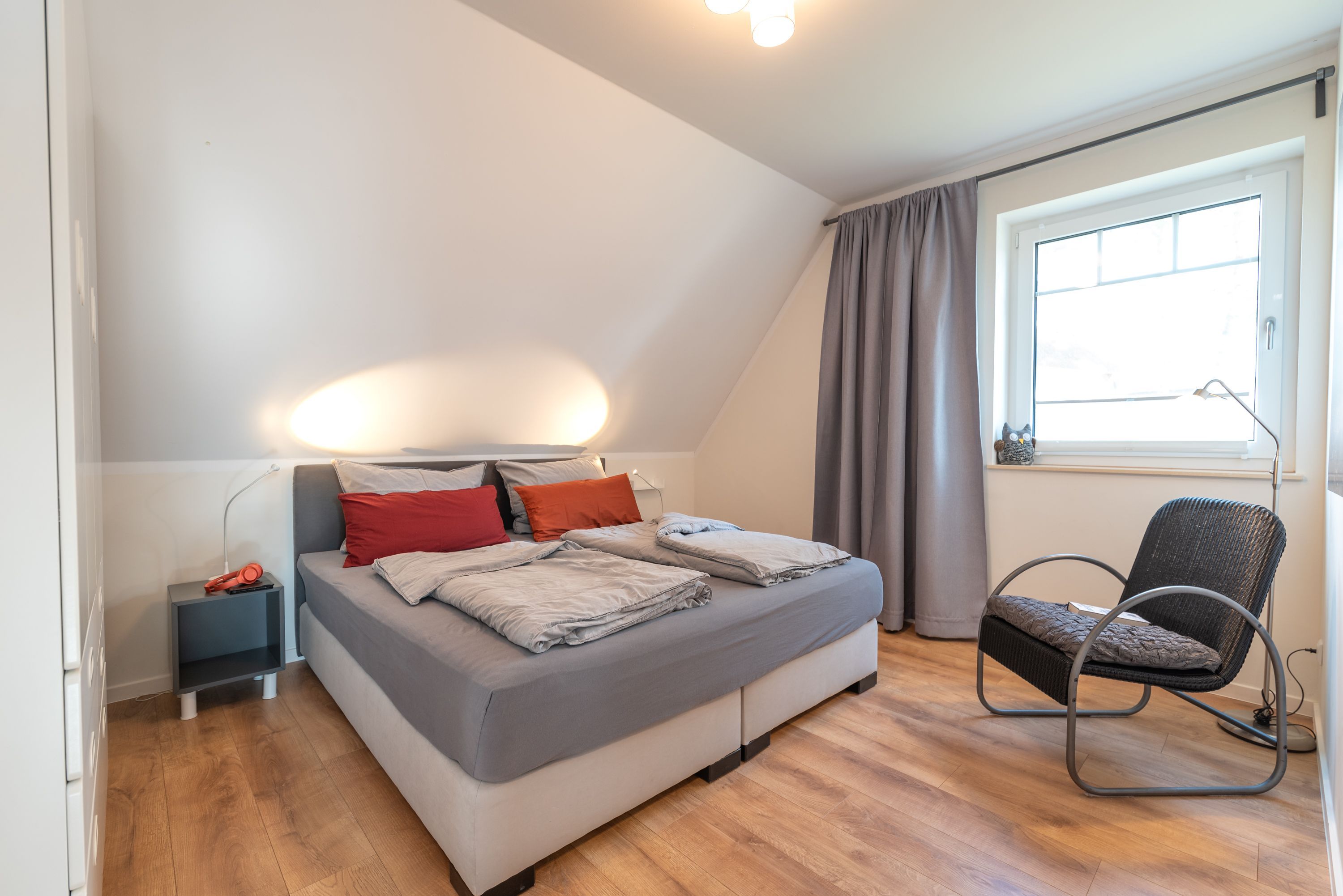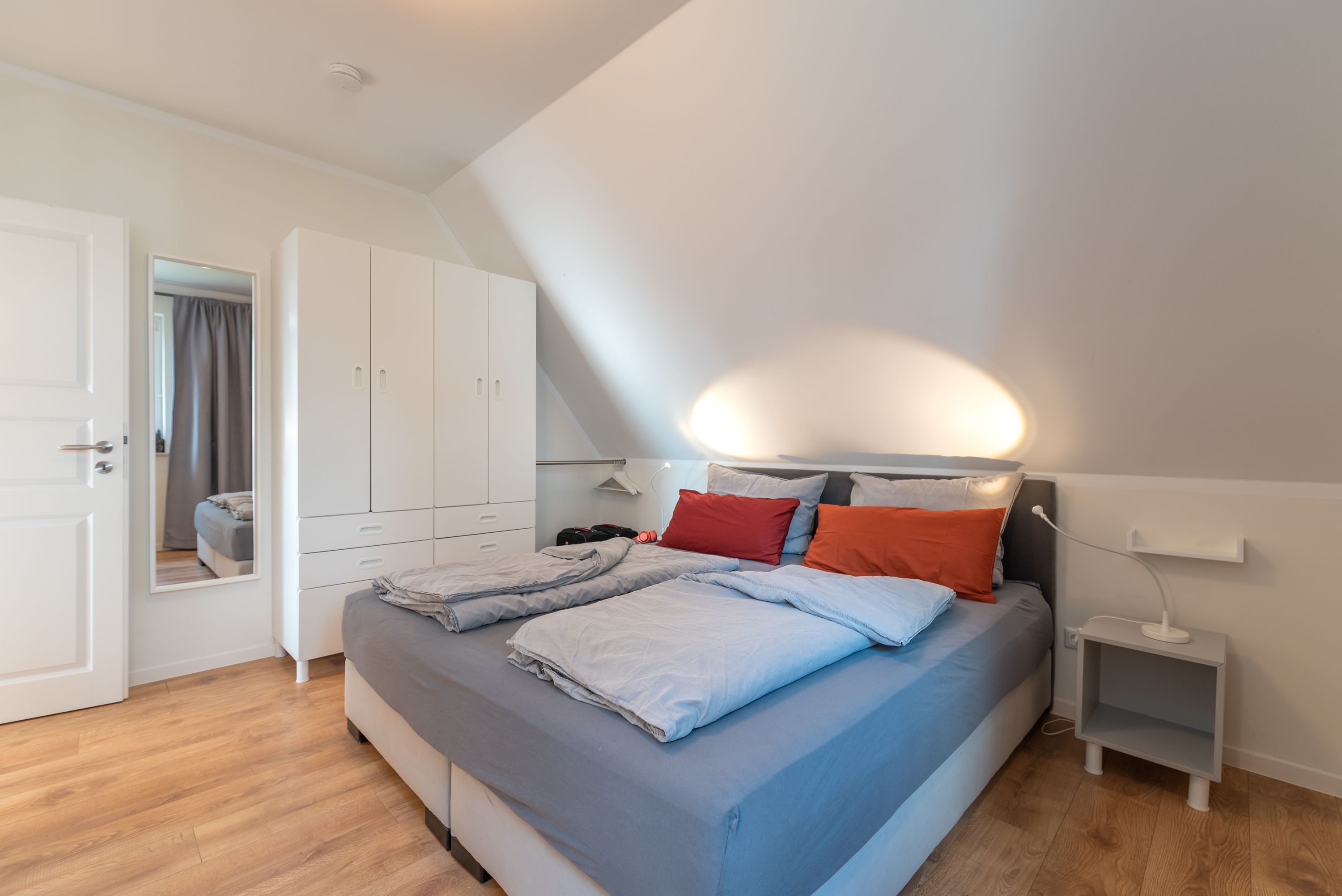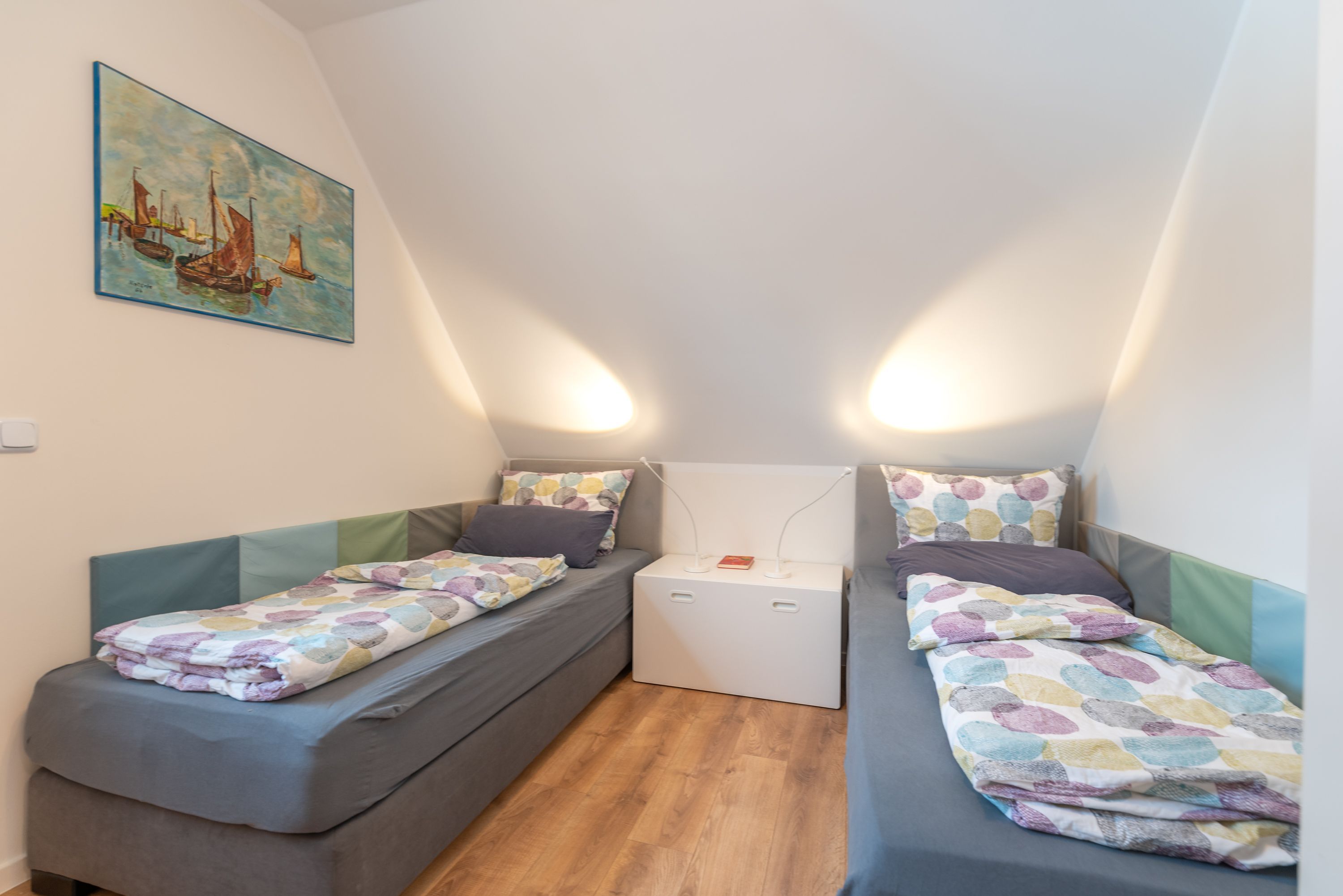 Im Obergeschoss befinden sich ein zweites Bad und zwei Schlafzimmer. Das eine ist mit einem bequemen Boxspringdoppelbett ausgestattet, in dem anderen stehen zwei Einzelboxspringbetten. Fu?r Ordnung sorgen Schränke mit viel Platz fu?r Ihre Urlaubsgarderobe. Kleinkinder bis zu 2 Jahren schlafen kostenfrei im Reisebett. Auch ein Kinderhochstuhl ist vorhanden.