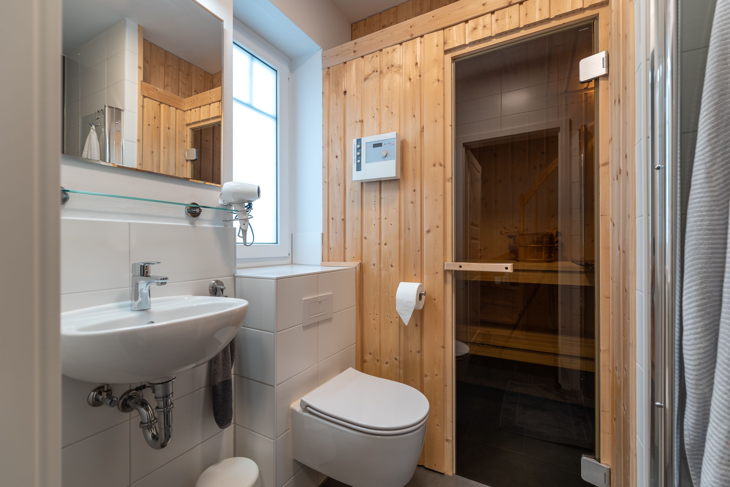 Beide Badezimmer sind mit Duschen ausgestattet, so dass der morgendliche Ansturm sich in Grenzen hält. Die Sauna wärmt nach ausgedehnten Spaziergängen im Winter Körper und Seele und hält Ihr Immunsystem auch im Sommer auf Trab. Zu frischer Wäsche verhilft die Waschmaschine.