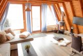 Unsere Familien-Finnhütten sind für 4-5 Personen ausgelegt. Die Möglichkeit zur Aufbettung im Wohnzimmer auf einer Schlafcouch mit einer Liegefläche von 1,30 m x 2,15 m besteht auf Anfrage für bis zu zwei Personen.
