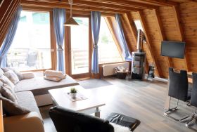 Rustikale Finnhütte mit großzügigem Wohn-/Esszimmer mit offener Küche und Terrassenzugang.