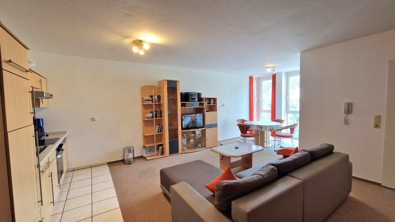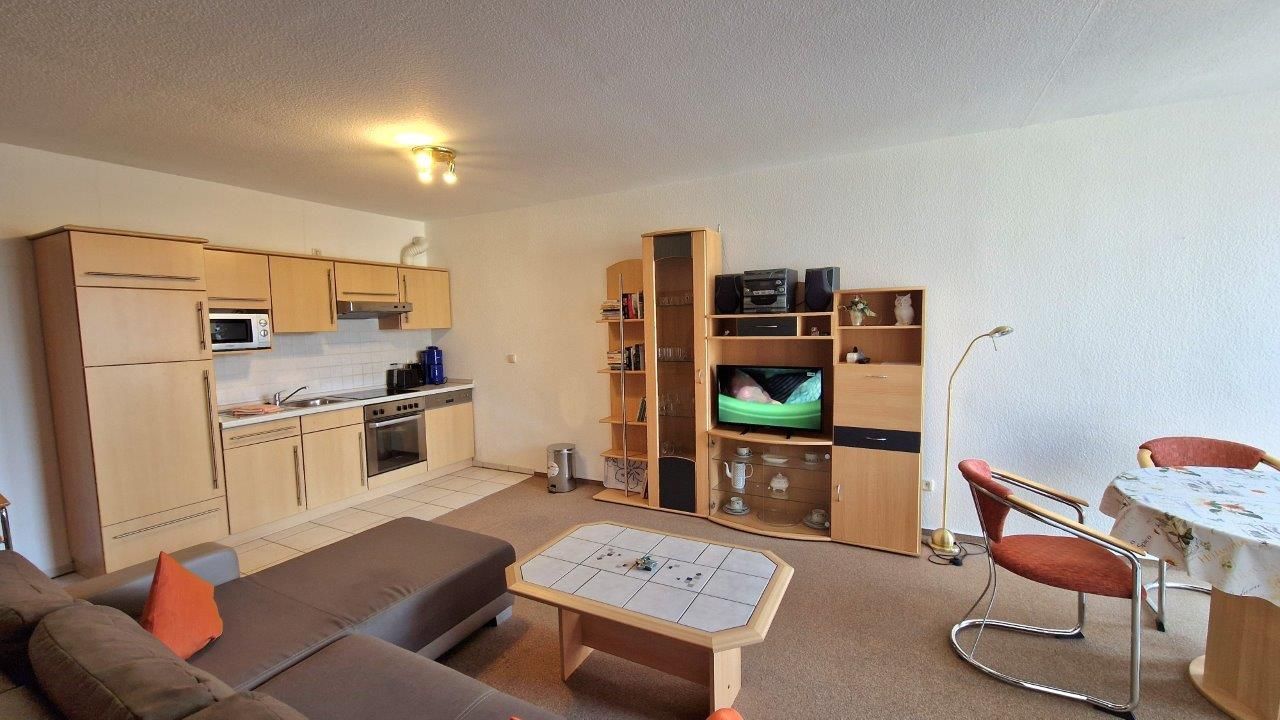 - Wohn/Schlafbereich mit Schlafcouch, integrierter Küche und Essplatz