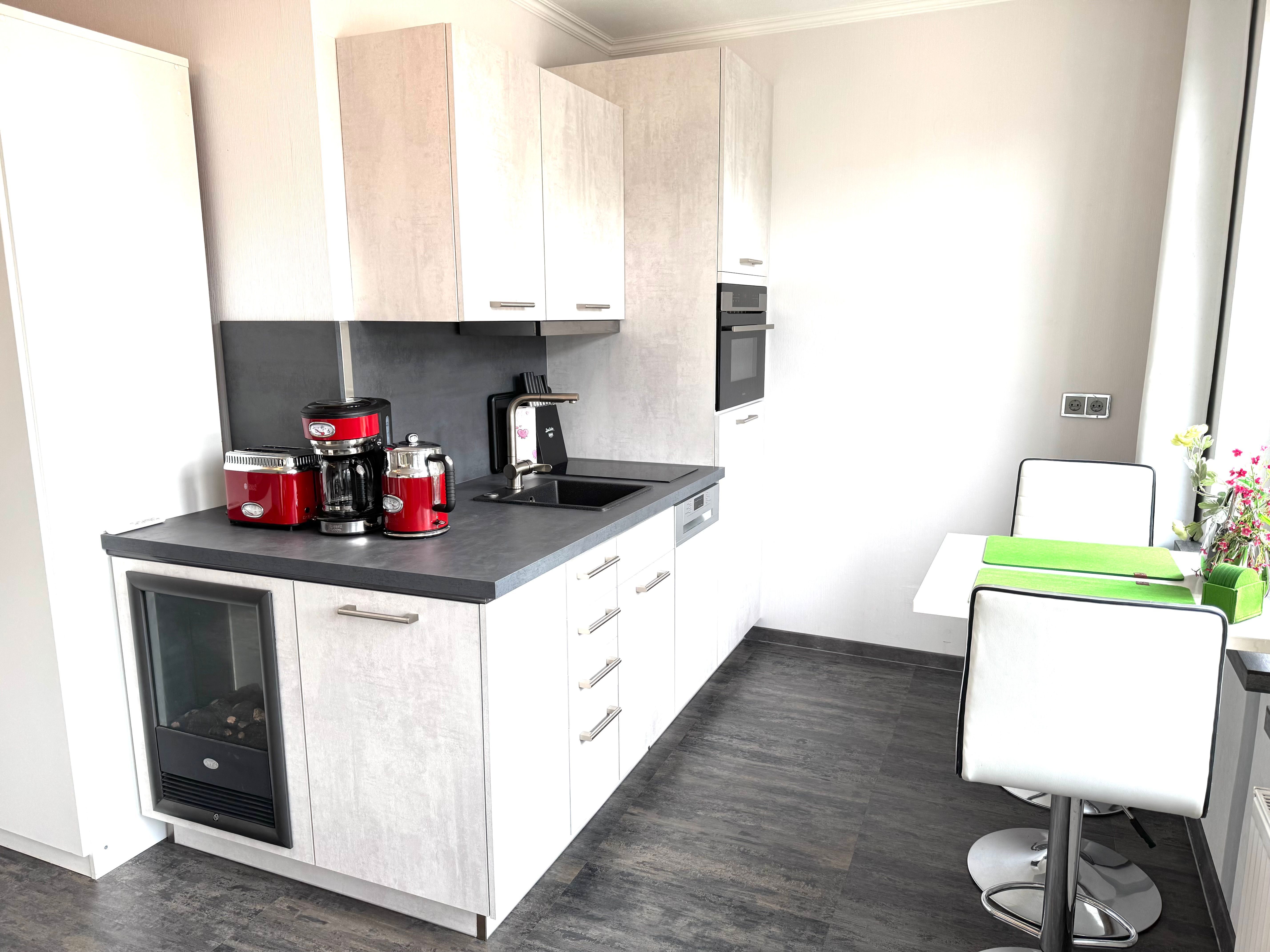 • Küche mit Herd und Ceranfeld, Kühlschrank, Geschirrspüler, Toaster, Wasserkocher, Kaffeemaschiene