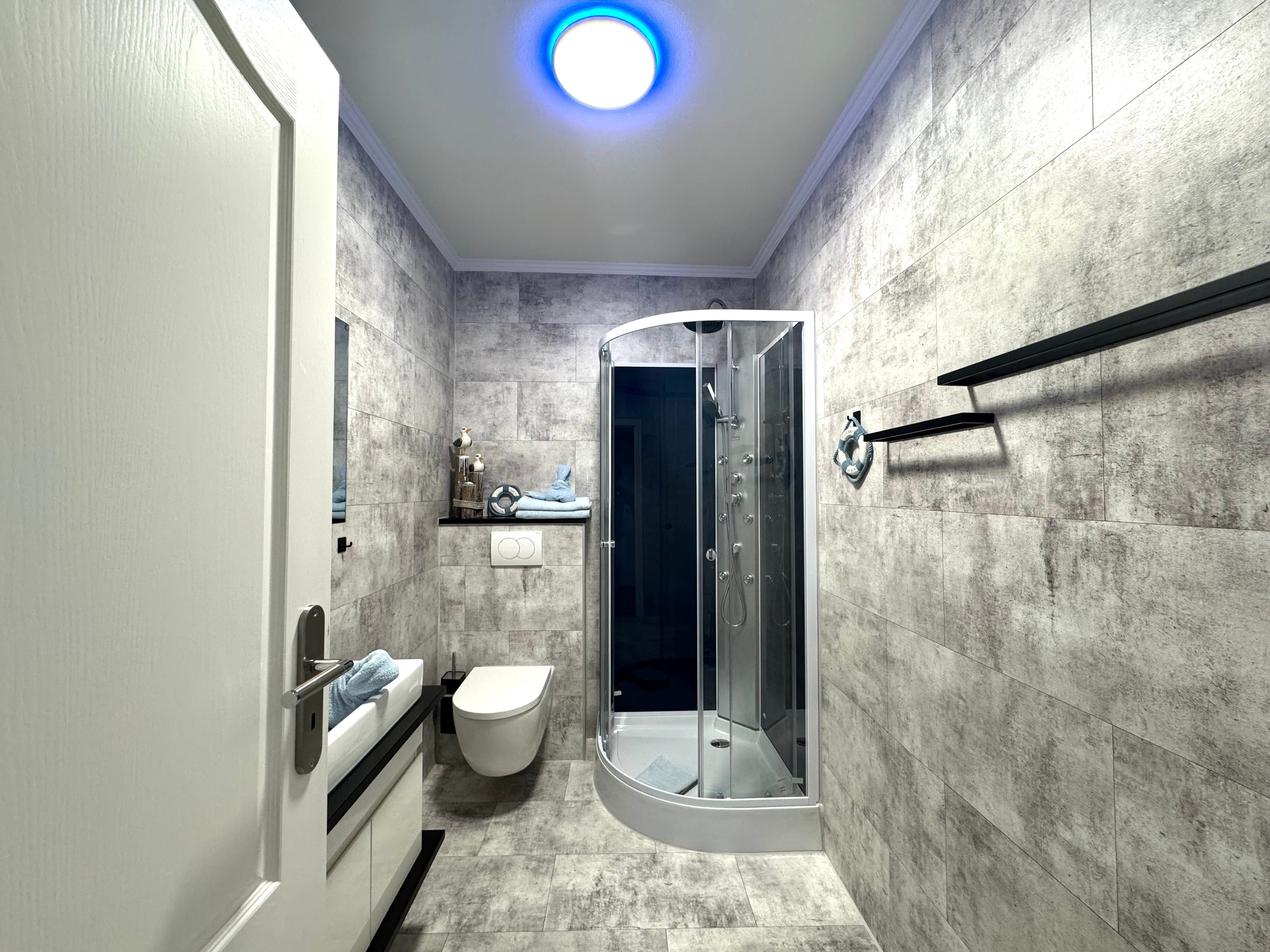 • Bad mit Dusche und WC, Spiegelheizung, LED- Farbbeleuchtung