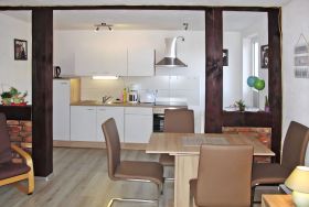 Unsere rustikal-gemütliche Erdgeschosswohnung ist 60 m² groß und eignet sich ideal für bis zu 4 Personen zzgl. 1 Kleinkind bis 2 Jahre. Der offene Wohnraum gliedert sich in den Wohnbereich mit Schlafcouch und eine vollwertig ausgestattete offene Küche mit Essplatz. Als Raumteiler dienen dunkle Holzbalken, die den Charakter des Dorfes Bannemin, lange Zeit durch traditionelle Architektur und Landwirtschaft geprägt, unterstreichen. In der Küchenzeile sind vom Kühlschrank über Herd mit Ceranfeld, Backofen, Mikrowelle, Geschirrspüler und Kleingeräte alle wichtigen Hilfsmittel vorhanden, mit denen Sie im Handumdrehen Ihre Lieblingsgerichte zaubern können. Im Schlafzimmer finden Sie ein bequemes Doppelbett - beste Voraussetzungen für eine erholsame Nachtruhe. Weiterhin gehört zur Wohnung ein Badezimmer mit Dusche und WC. Alle Räume sind komplett mit Fliesen- bzw. Laminatboden ausgelegt.