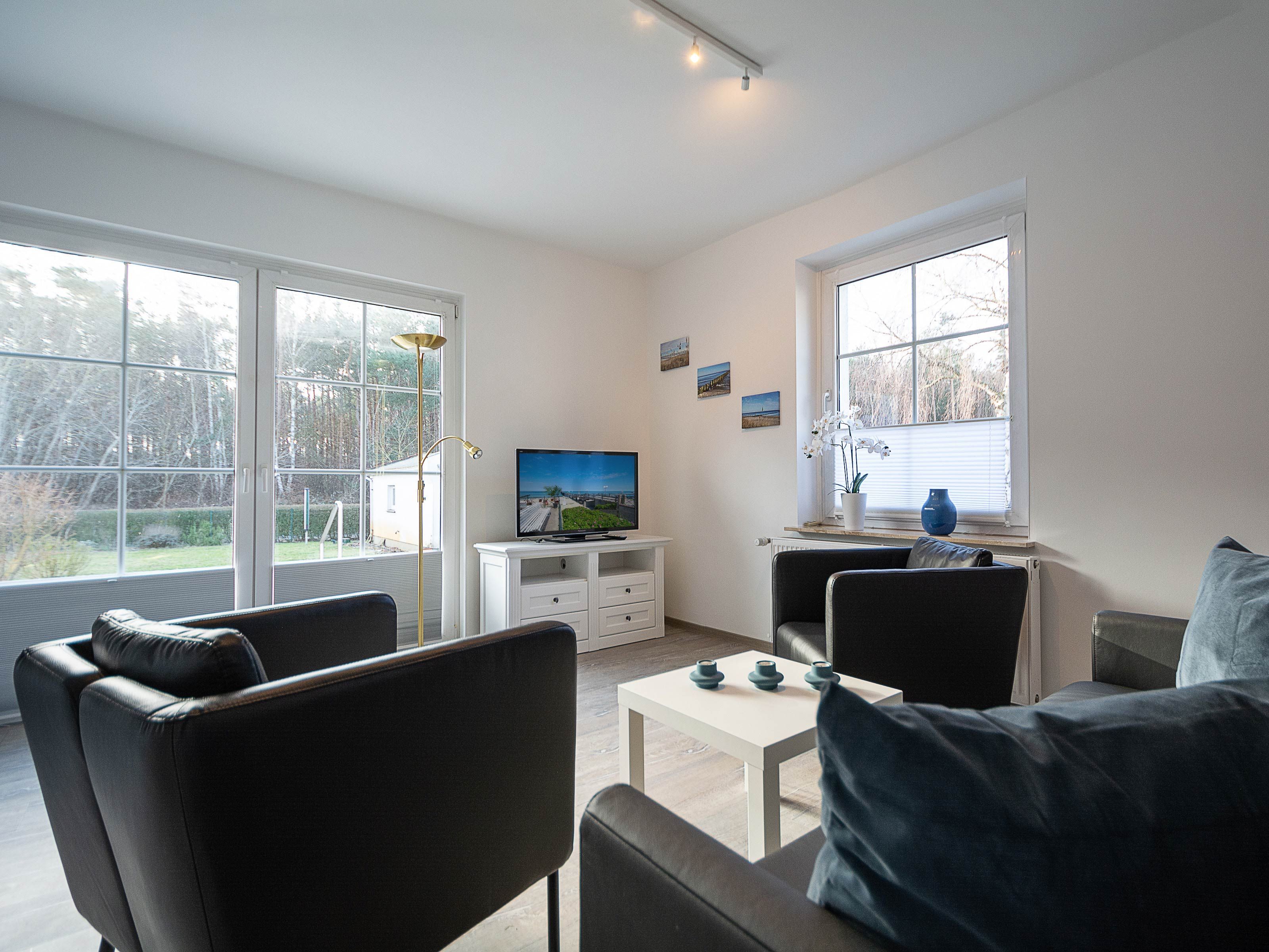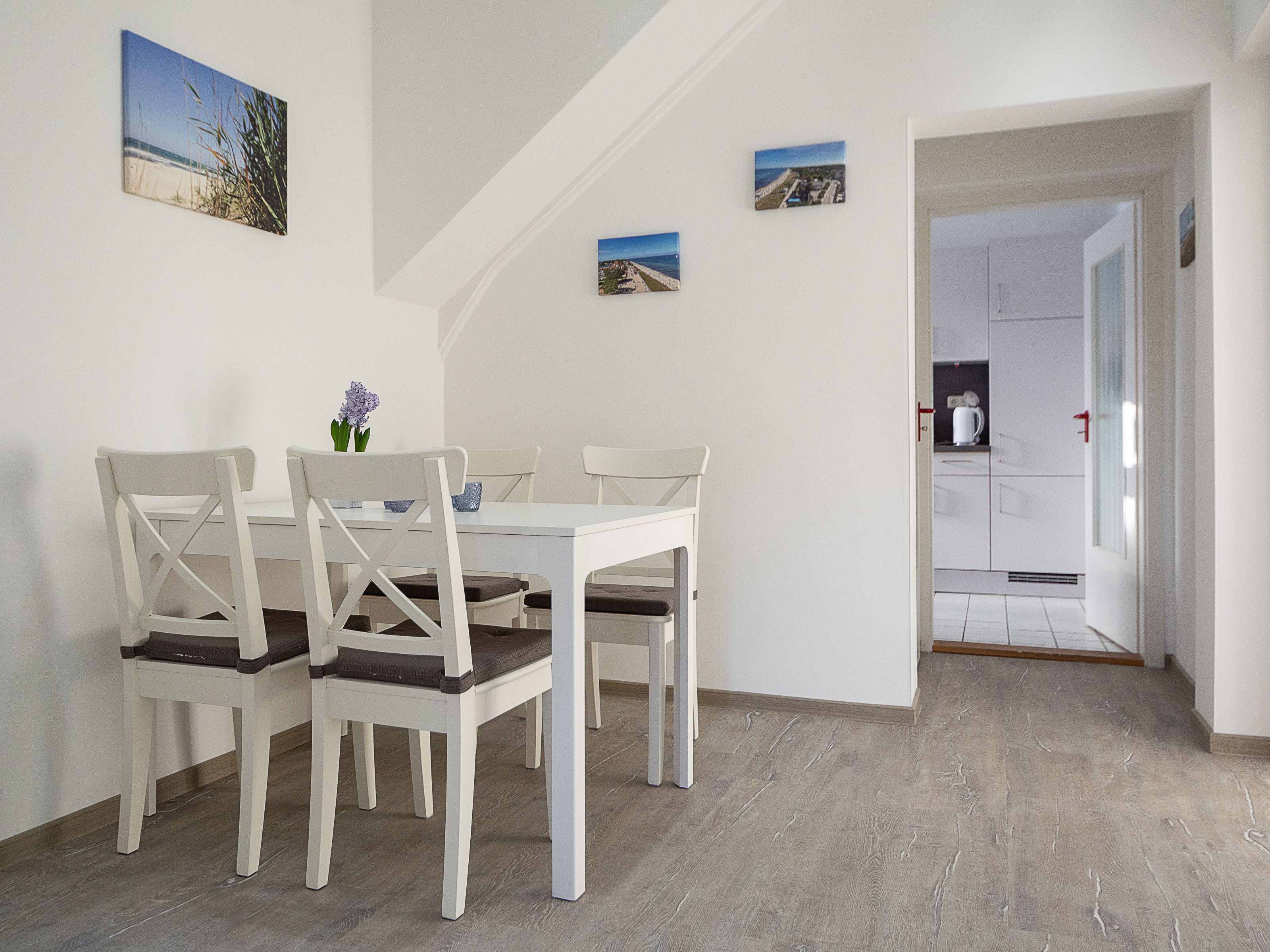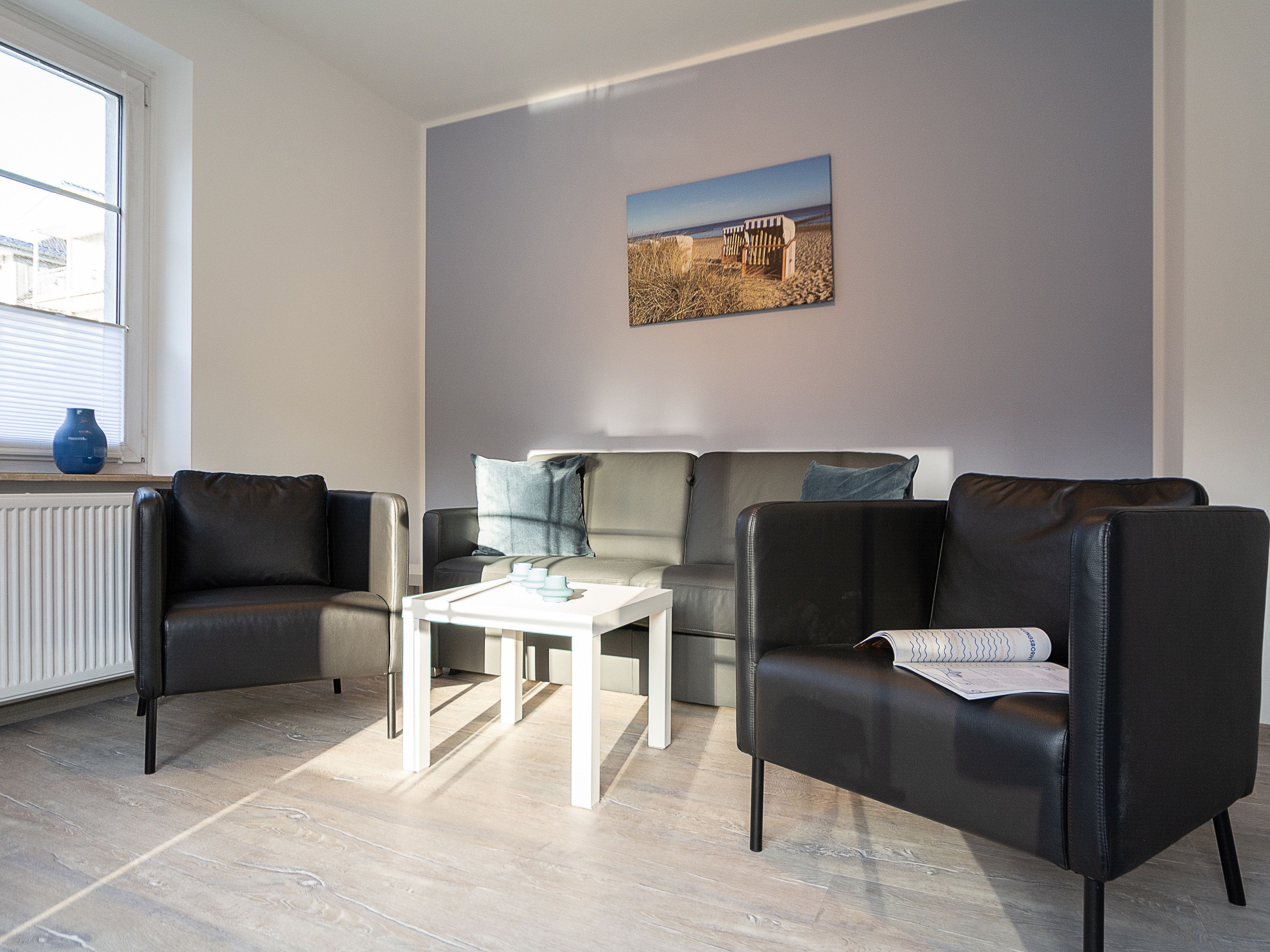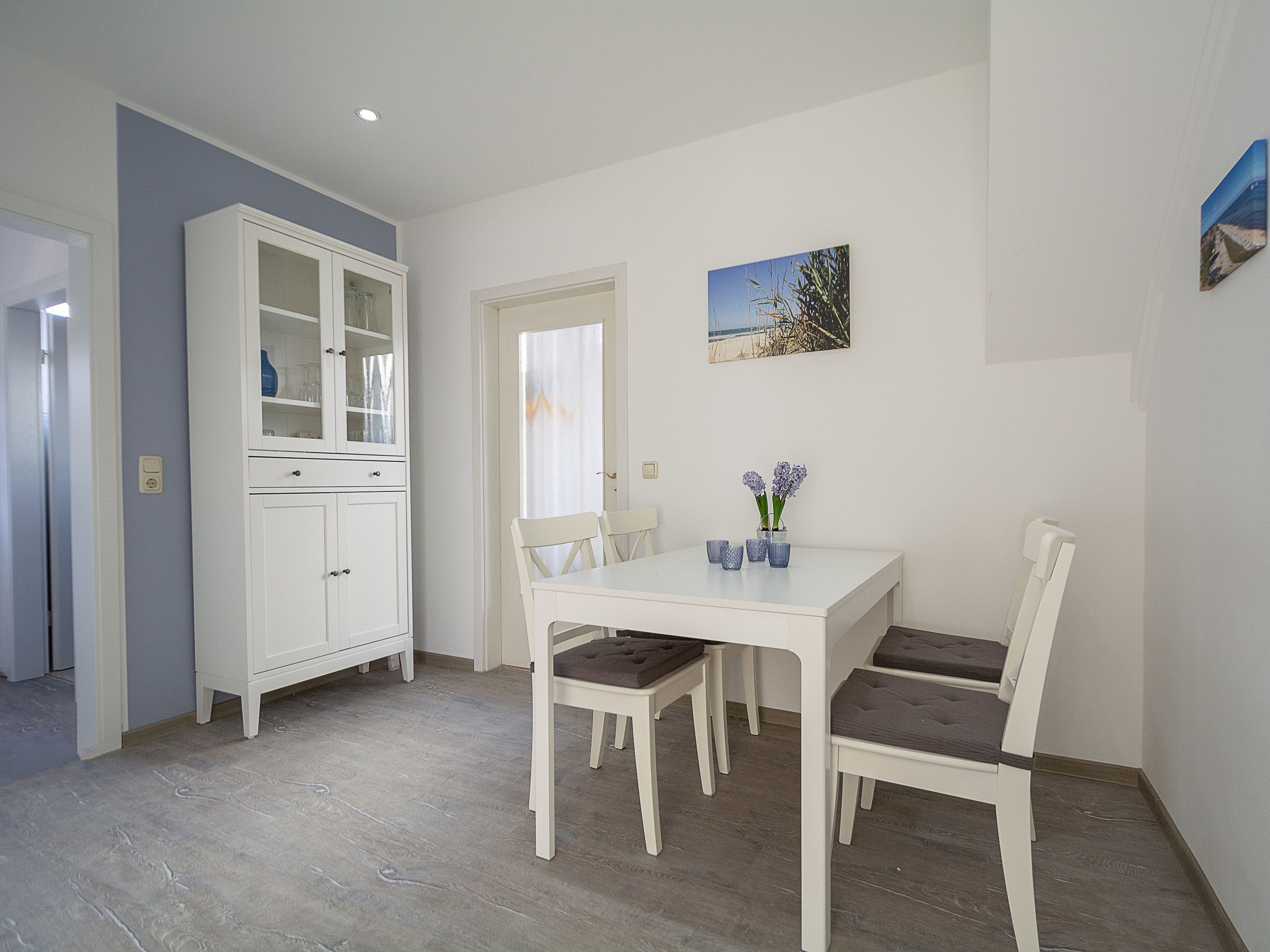 Es empfangen Sie ein offener Essbereich für 4 Personen sowie ein hell und freundlich gestaltetes Wohnzimmer mit gemütlicher Ledercouchgarnitur und Flachbild-TV. Mit nur wenigen Handgriffen lässt sich das Sofa zu einem bequemen Schlafplatz für eine dritte und vierte Person umwandeln. Vom Wohnbereich betreten Sie die große möblierte Terrasse, die nach Süden ausgerichtet ist. Hier können Sie Sonne tanken, relaxen und den Abend nach einem schönen Tag am Meer ausklingen lassen.