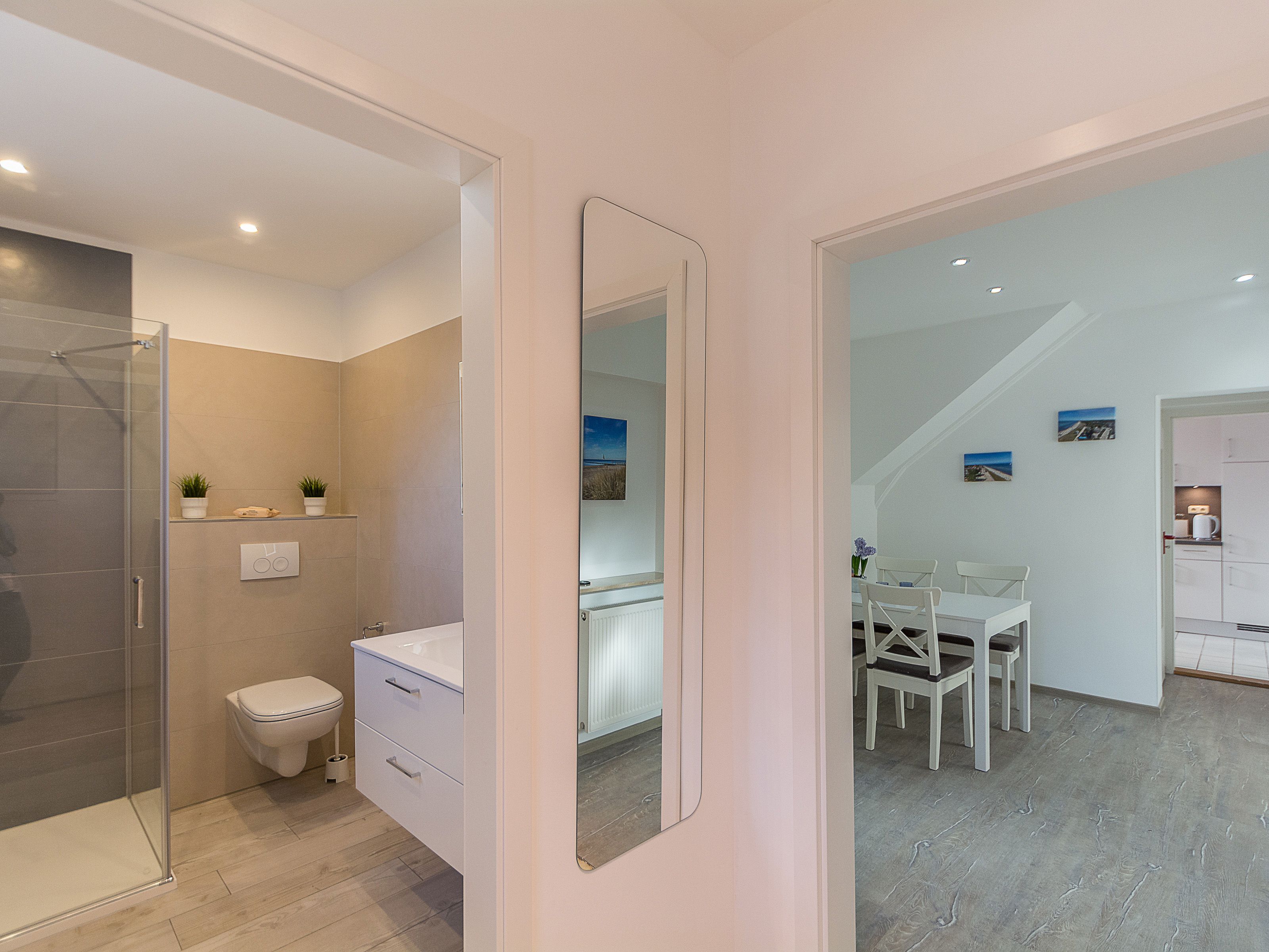 Das modern geflieste Tageslichtbad ist mit einer bodengleichen Duschkabine, Waschbecken und WC eingerichtet. Ein Handtuchheizkörper sorgt für kuschelig warme Handtücher und der Föhn für zusätzlichen Komfort während Ihres Aufenthalts.