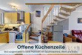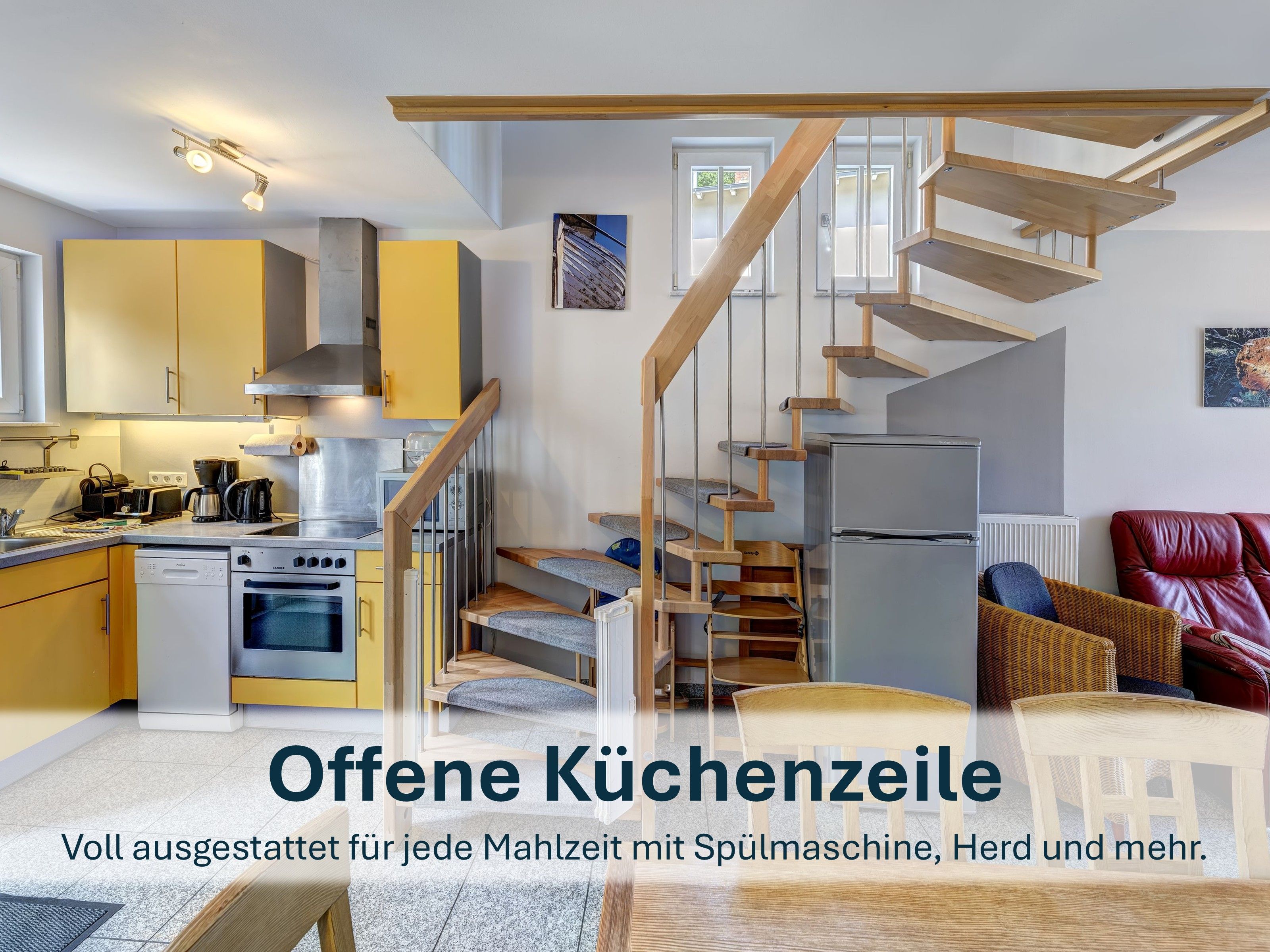 Offene, voll ausgestattete Küche (u.a. mit Spülmaschine, Mikrowelle, Kühl-Gefrierkombi, Kaffeemaschine),
