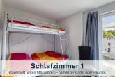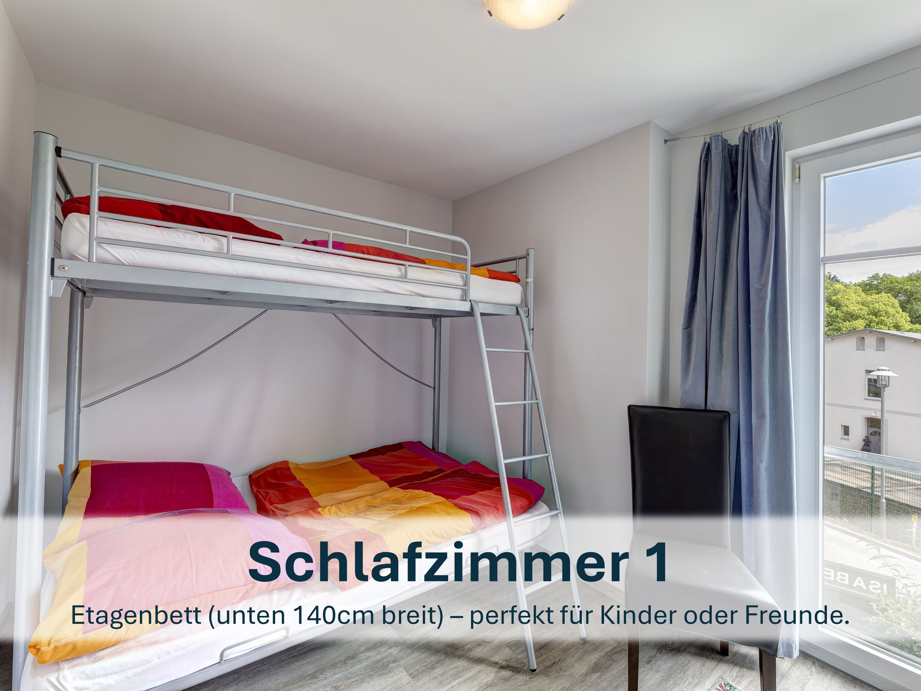 Schlafzimmer mit Etagenbett (unten 140cm breit) & Kleiderschrank,