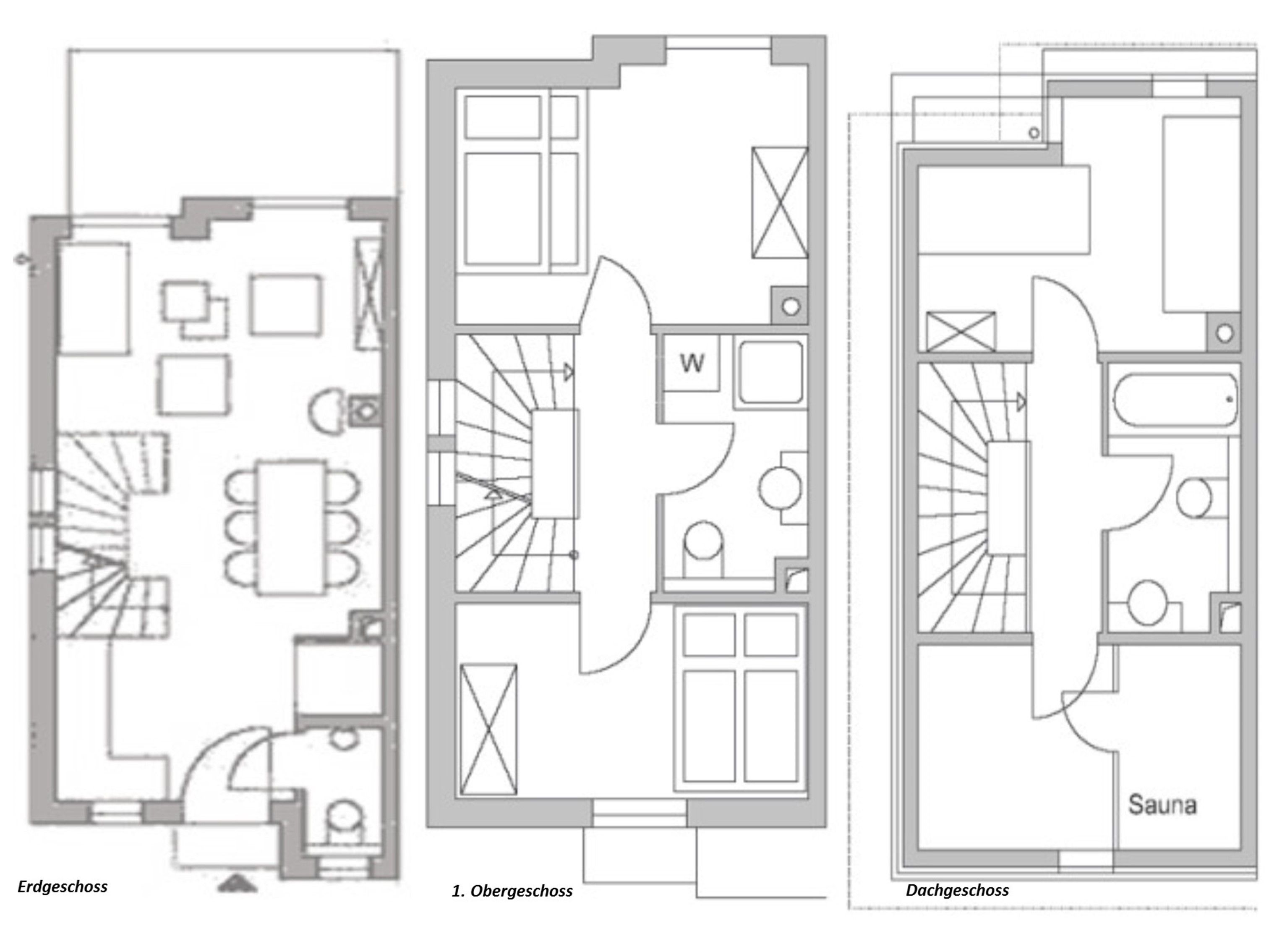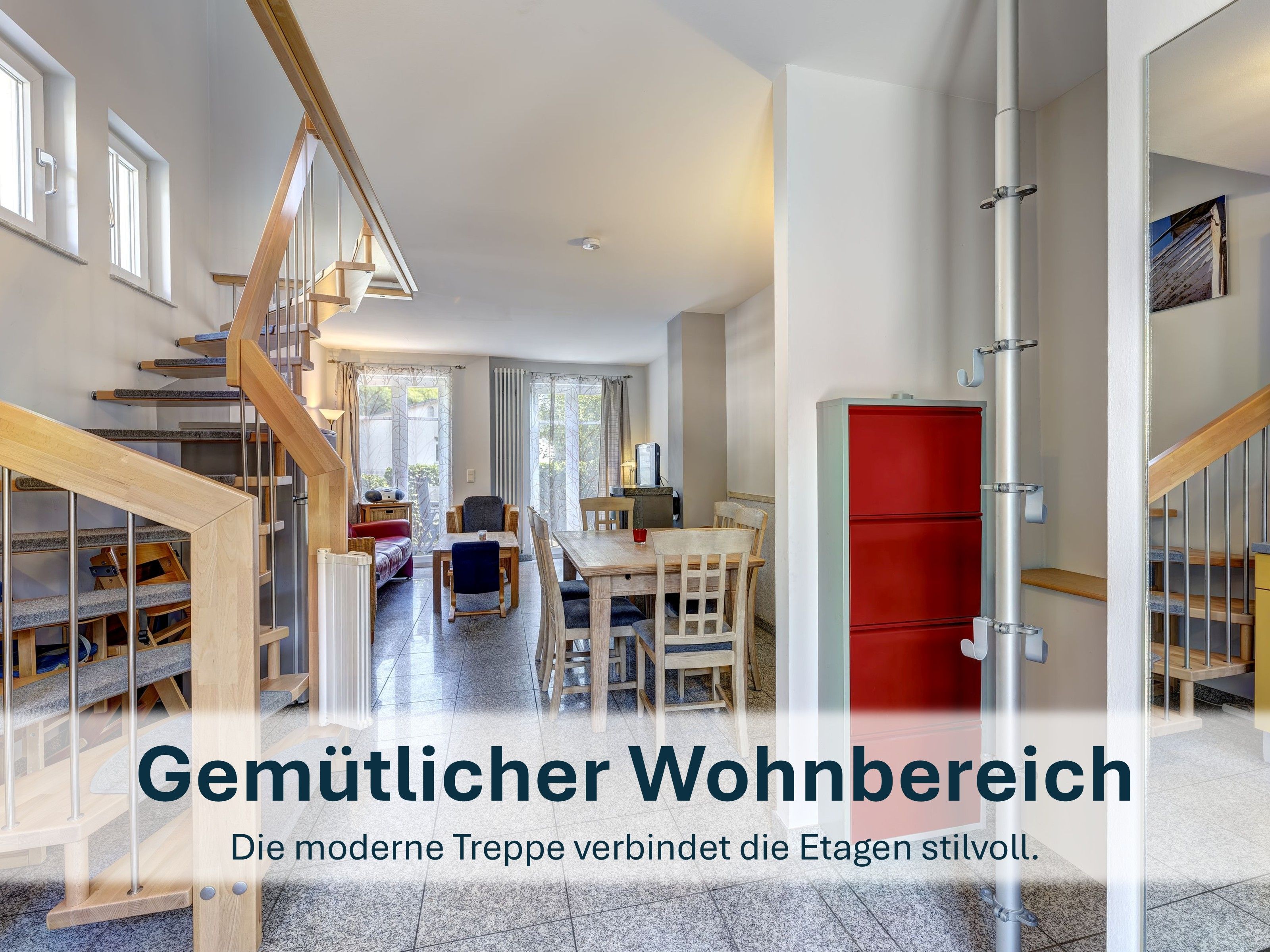Auf drei Etagen erwarten Sie insgesamt drei Schlafzimmer, zwei Bäder, ein Gäste-WC, eine komplett ausgestattete Einbauküche, ein gemütlicher Wohn-/Essbereich mit Kaminofen sowie als besonderes Extra: eine eigene Sauna.