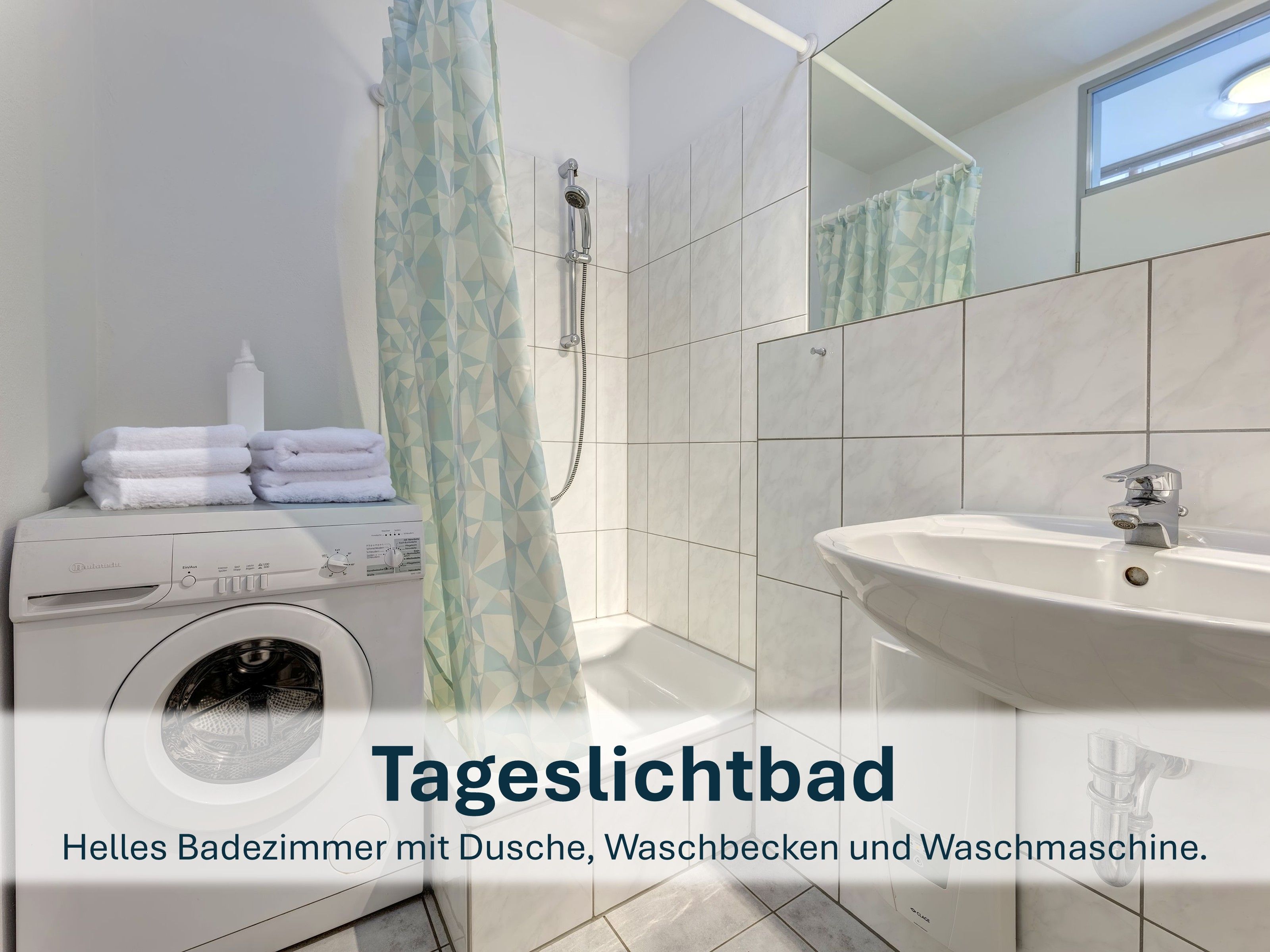 Badezimmer mit Dusche, WC, Waschbecken & Waschmaschine
