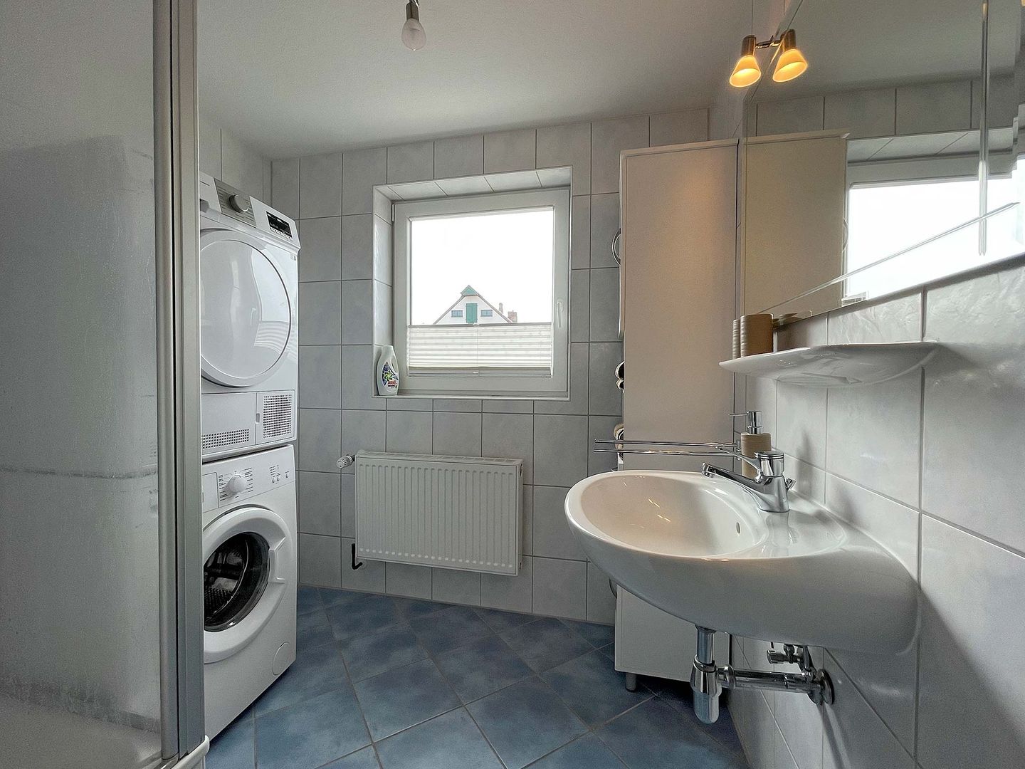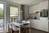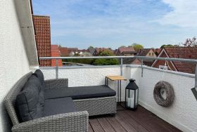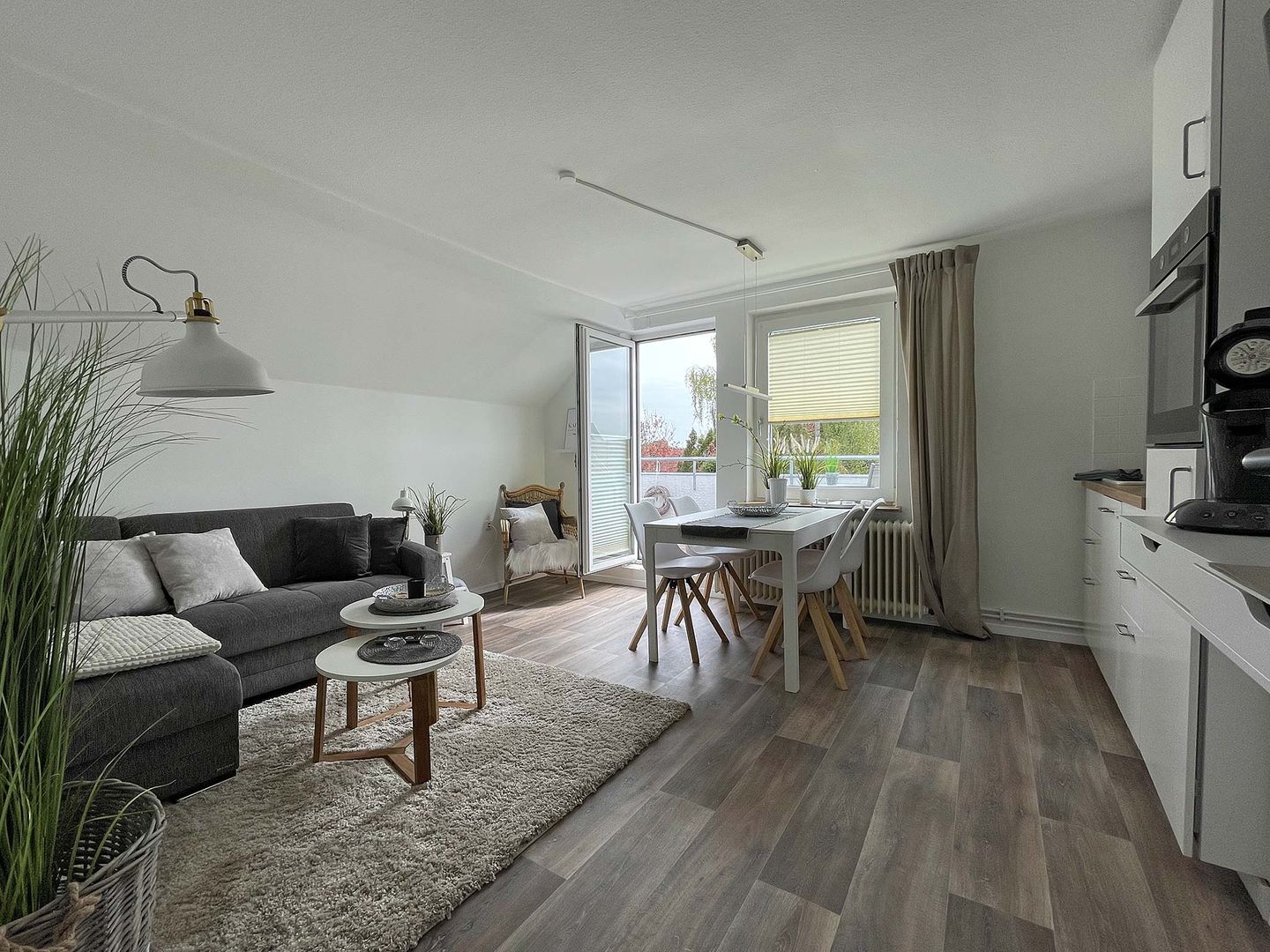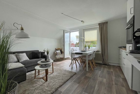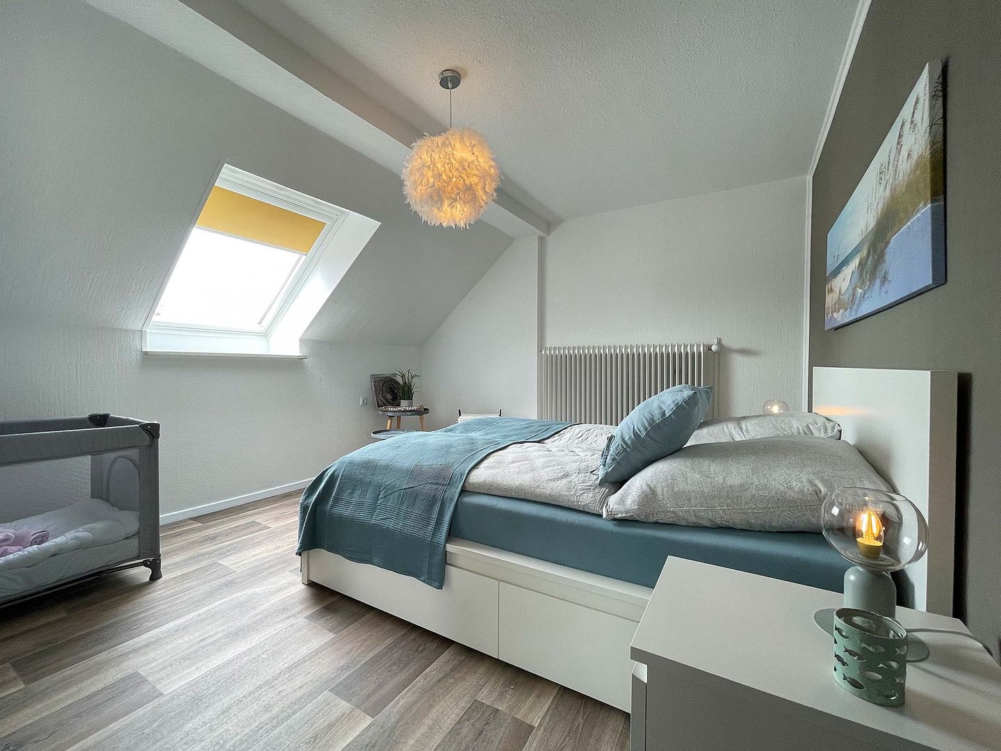 Die helle und modern eingerichtete Ferienwohnung mit sonnigem Balkon zur Gartenseite bietet viel Platz für 3 Erwachsene und 1 Kleinkind. Im großen Wohnraum mit komplett eingerichteter Küchenzeile und sonnigem Essplatz können Sie den Urlaub herrlich genießen. Im Elternschlafzimmer befinden sich ein bequemes Doppelbett,(Topper 180 x 200 m) Kleiderschrank und ein Kinderreisebett. Im 2. Schlafraum fühlt sich ein weiterer Erwachsener wohl. Im Bad mit Fenster finden Sie neben Waschbecken und Dusche auch eine Waschmaschine mit Trockner. Das WC ist separat.