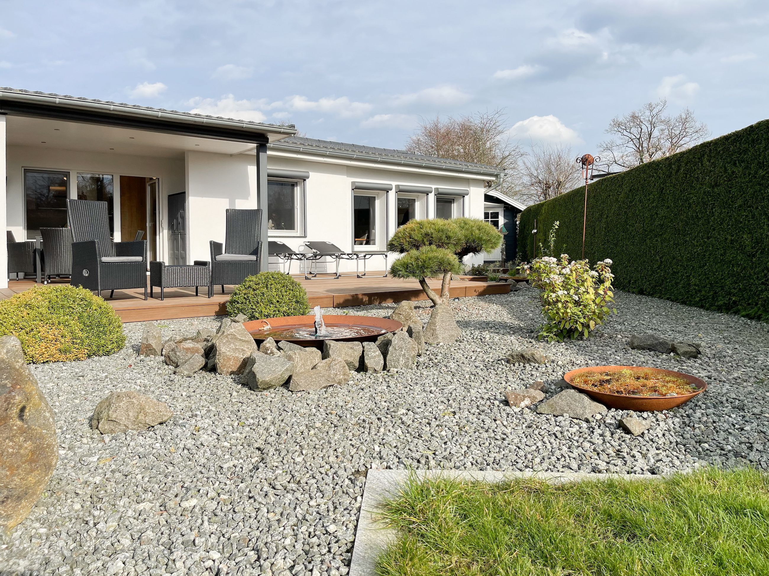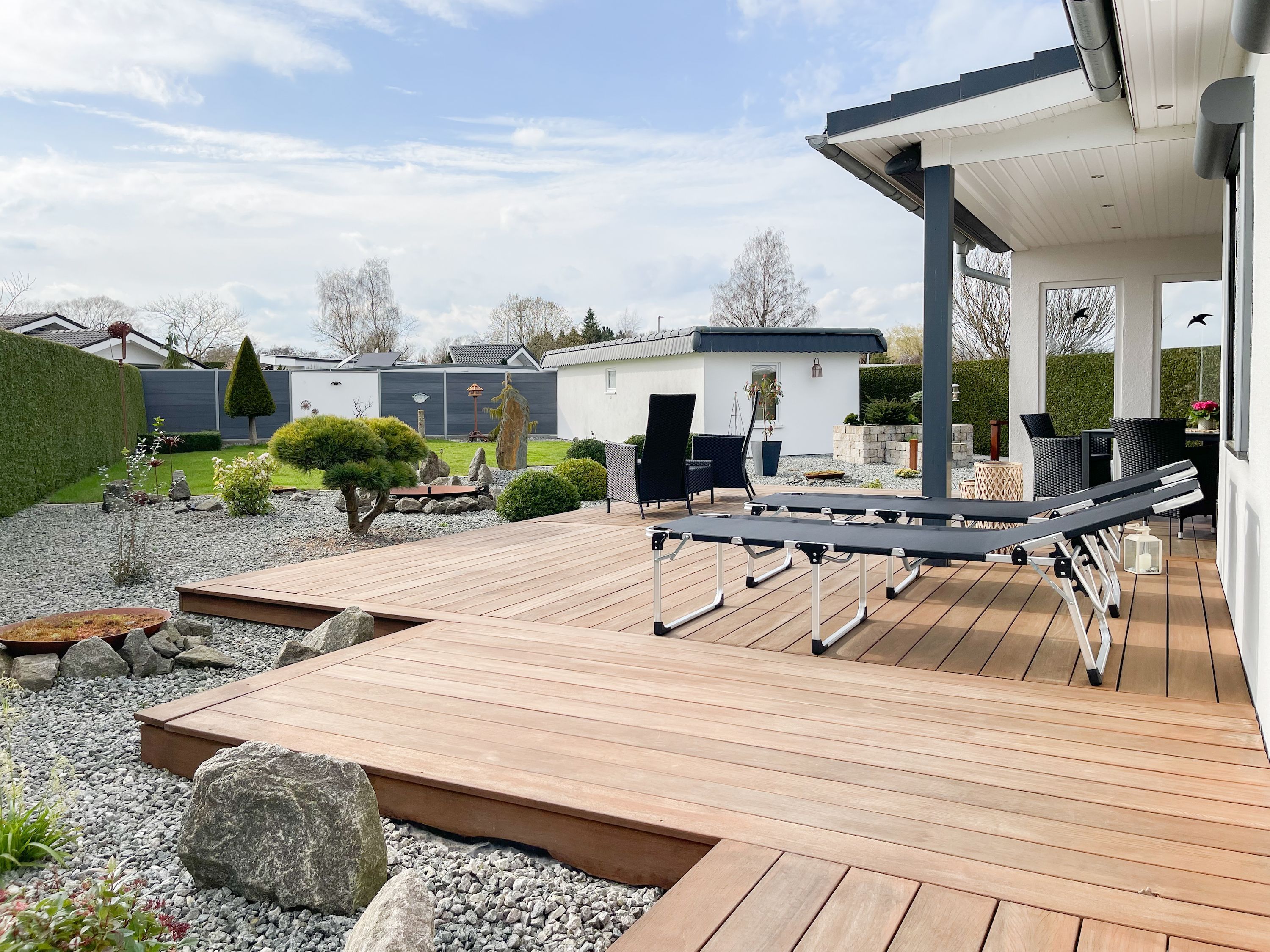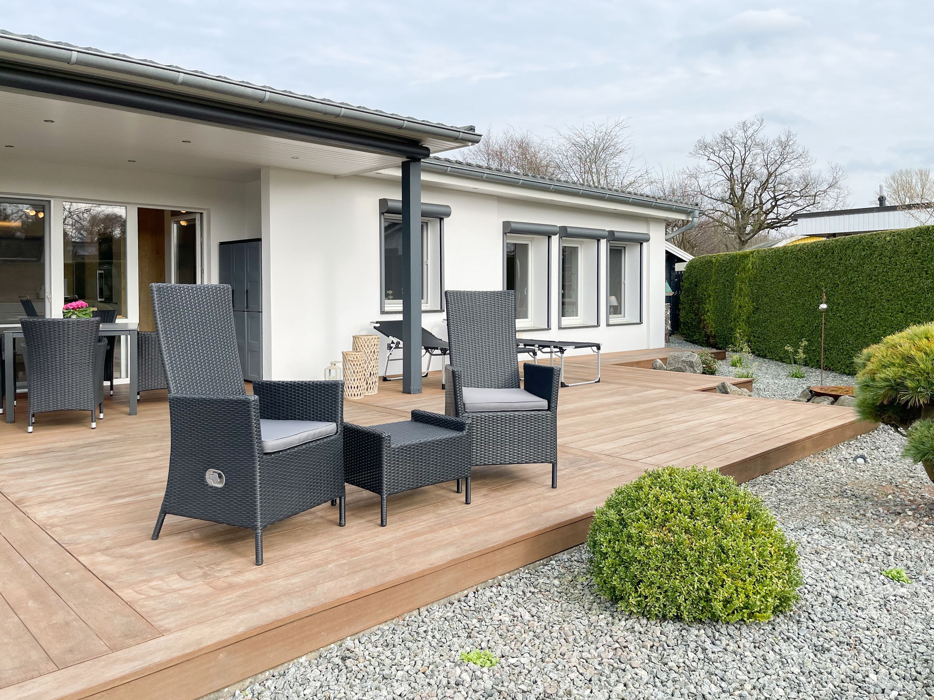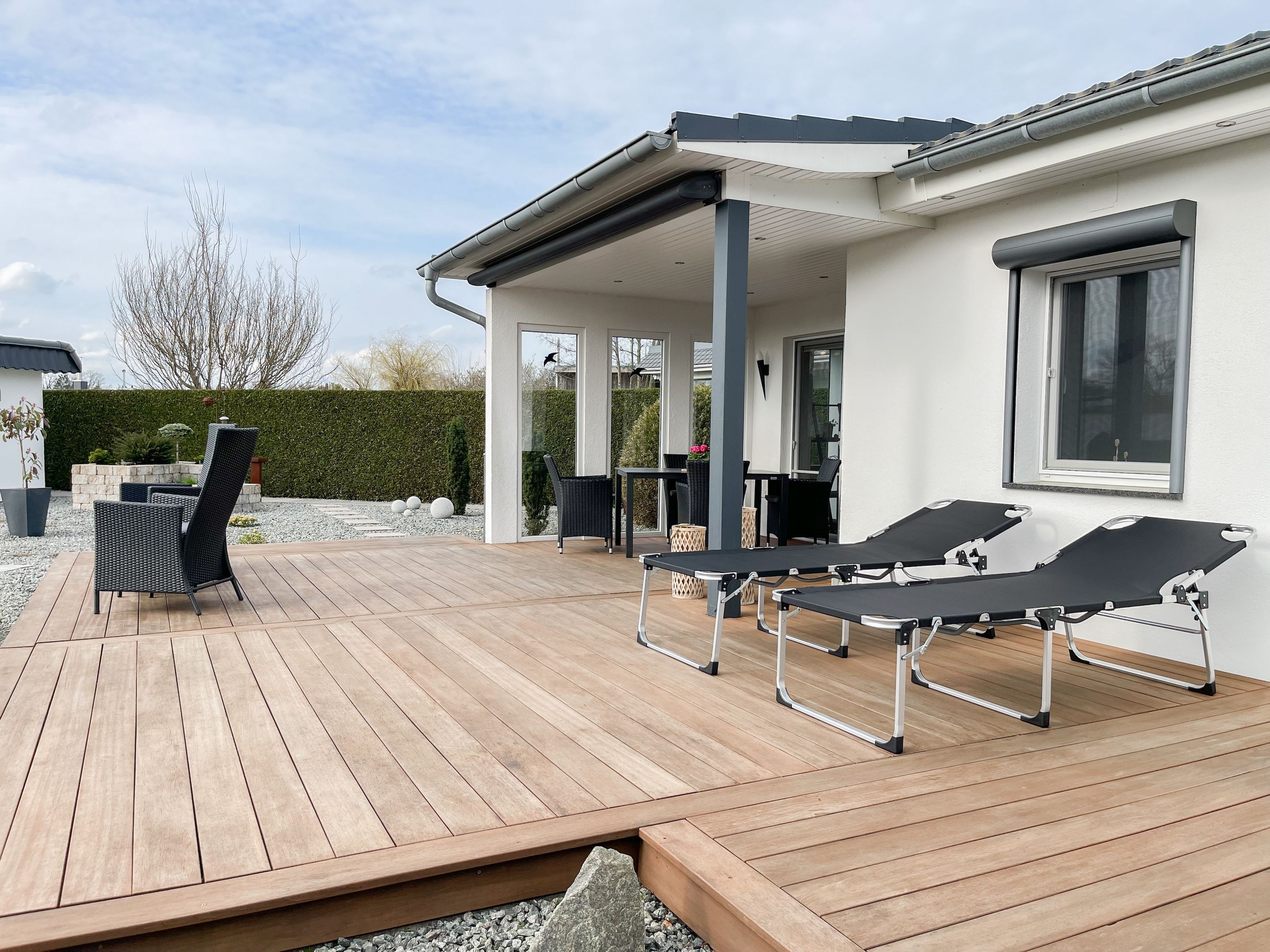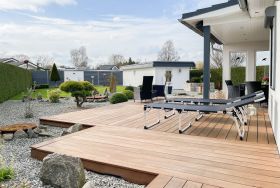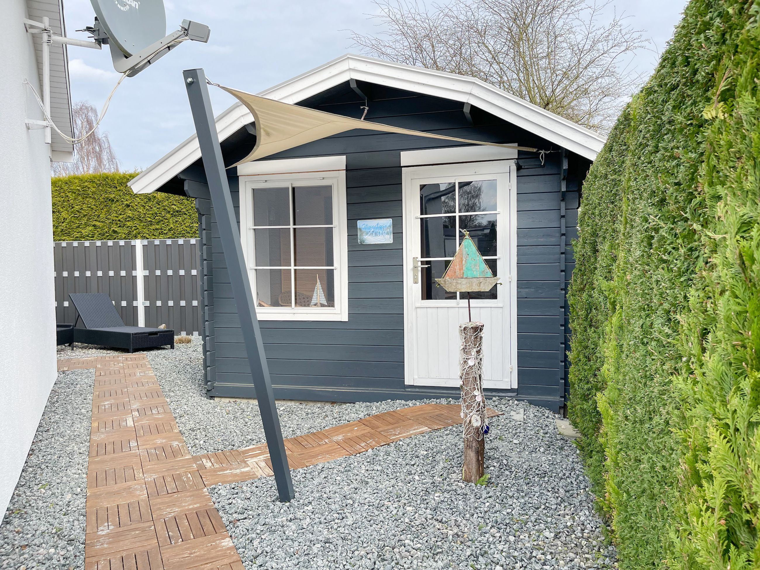 Das Ferienhaus Sonnendeck erfreut sich einer großzügigen, umzäunten Gartenanlage in Südwestlage, die absolute Privatsphäre garantiert. Ein Highlight ist die traumhafte Terrasse mit teilweiser Überdachung und windgeschütztem Bereich, perfekt ausgestattet mit Sonnenliegen, Gartenmöbeln und einer elektrischen Markise für entspannte Stunden im Freien. Für erholsame Momente sorgt die Infrarotsauna, die sich in einem separaten Saunahaus befindet. Hier finden Sie den idealen Ort, um Ihren Urlaub in vollen Zügen zu genießen. Das Haus verfügt über zwei moderne Bäder, zwei Küchen, komfortable Schlafzimmer mit TV, elektrische Außenjalousien, Insektenschutzgitter, WLAN, Bluetooth-Radio und vieles mehr. Eine Garage mit elektrischem Tor bietet Platz für einen PKW und Fahrräder sowie die Lademöglichkeit für E-Bikes, während ein weiterer Stellplatz auf dem Grundstück vorhanden ist.