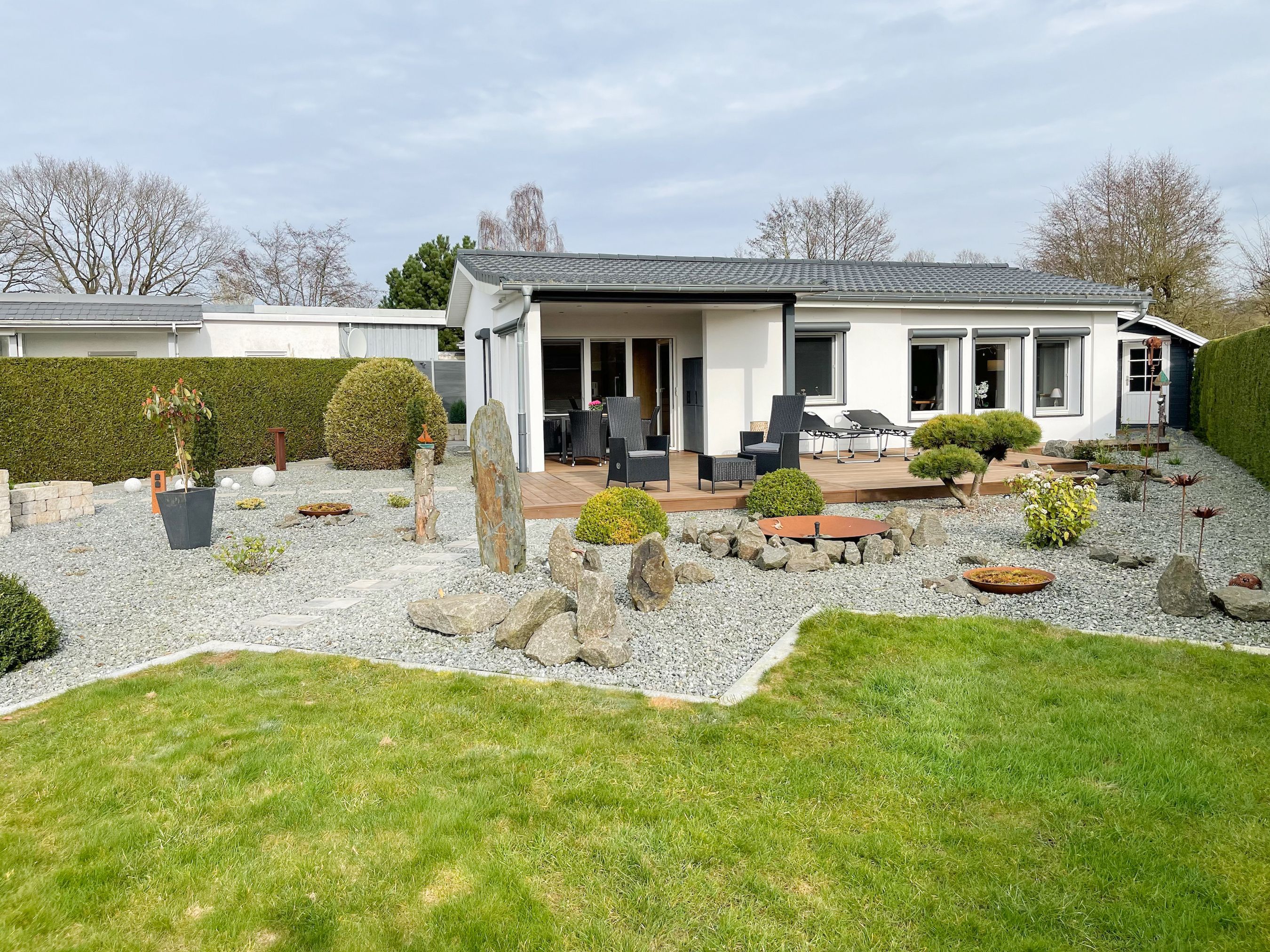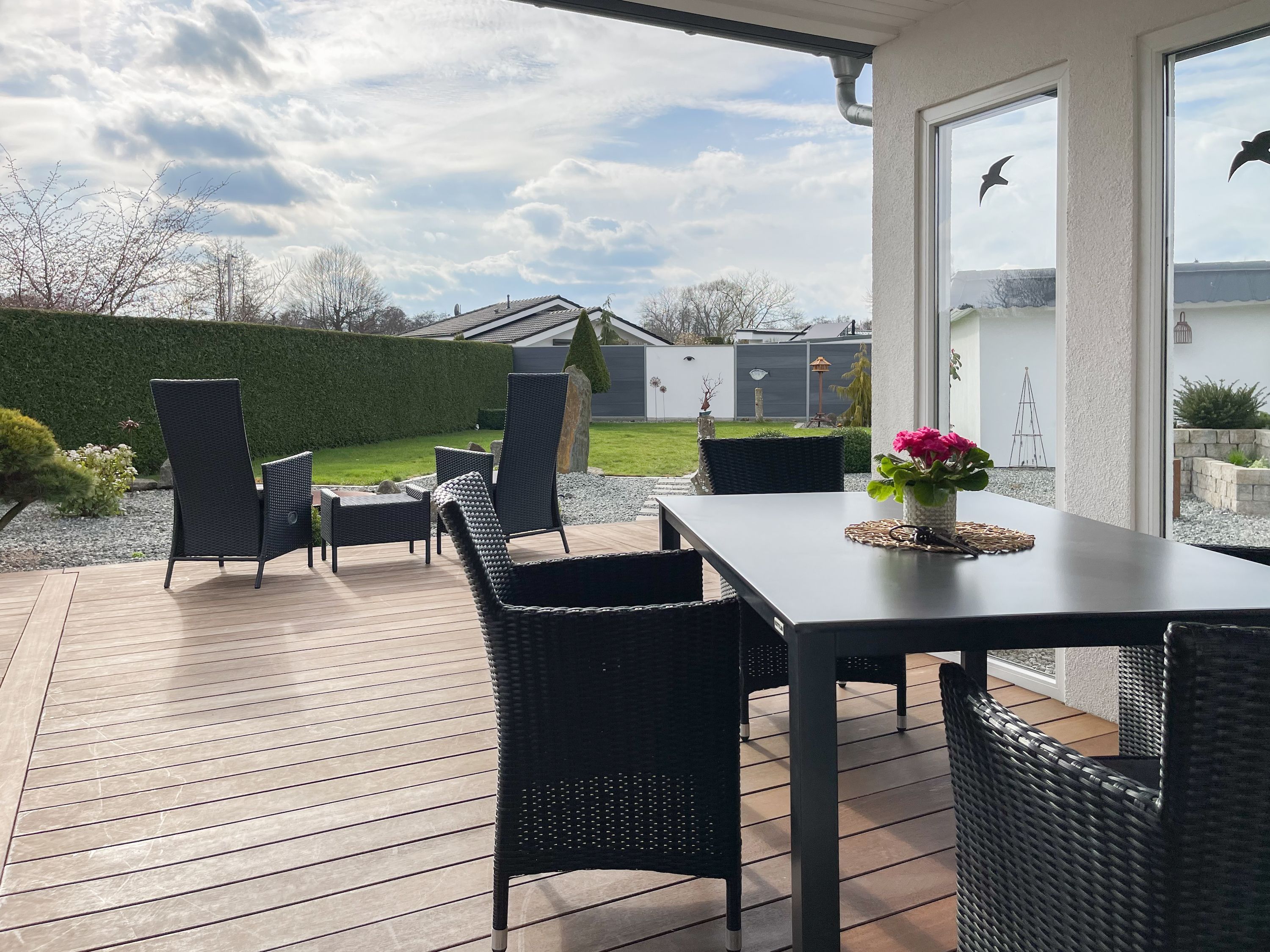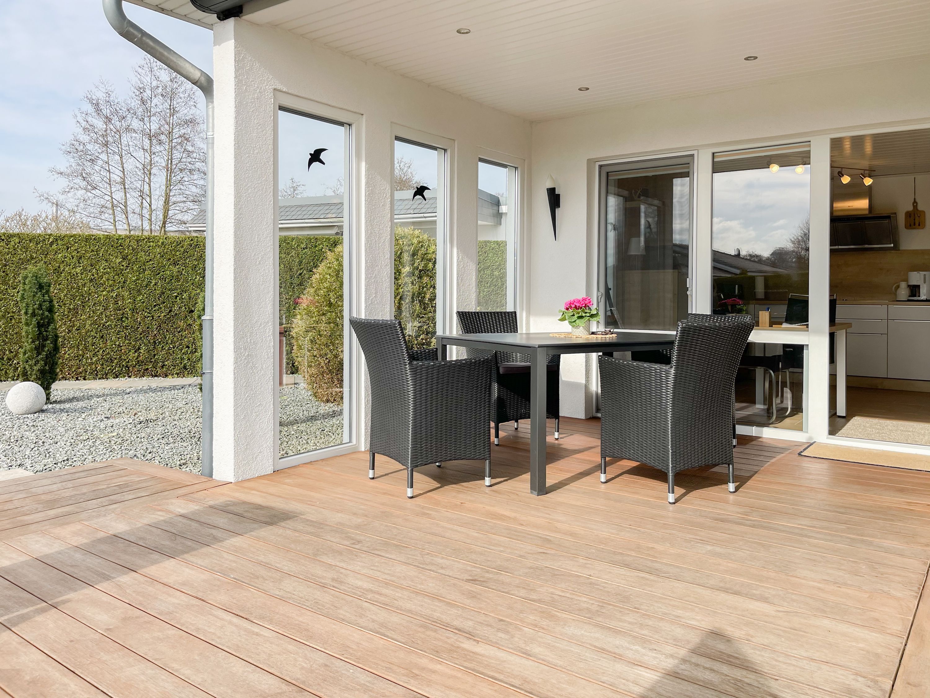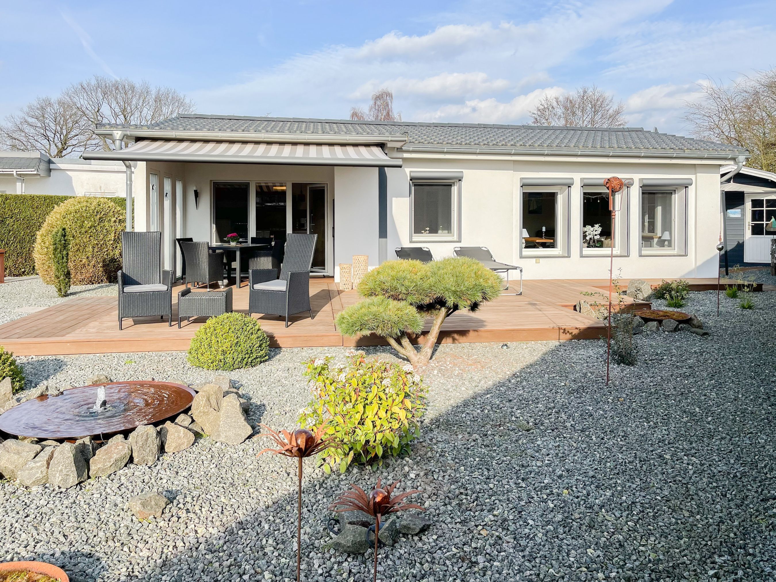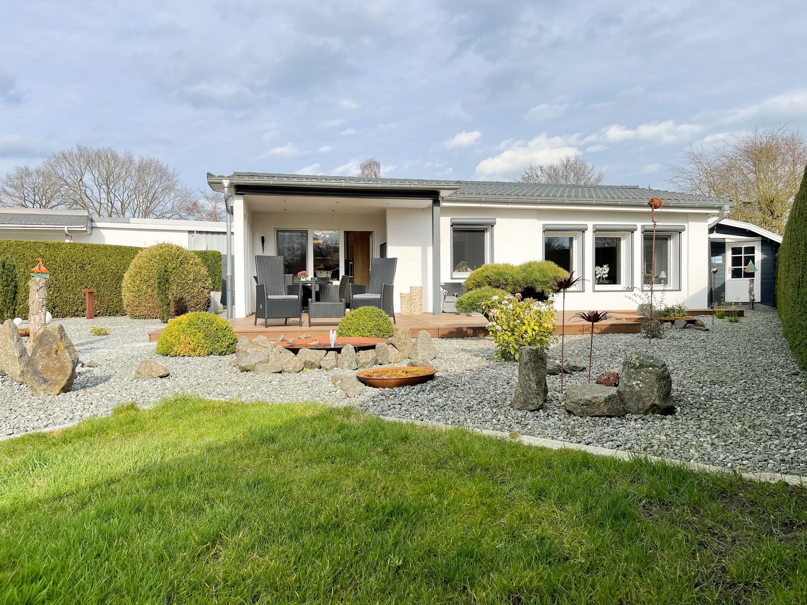 Das Ferienhaus Sonnendeck erfreut sich einer großzügigen, umzäunten Gartenanlage in Südwestlage, die absolute Privatsphäre garantiert. Ein Highlight ist die traumhafte Terrasse mit teilweiser Überdachung und windgeschütztem Bereich, perfekt ausgestattet mit Sonnenliegen, Gartenmöbeln und einer elektrischen Markise für entspannte Stunden im Freien. Für erholsame Momente sorgt die Infrarotsauna, die sich in einem separaten Saunahaus befindet. Hier finden Sie den idealen Ort, um Ihren Urlaub in vollen Zügen zu genießen. Das Haus verfügt über zwei moderne Bäder, zwei Küchen, komfortable Schlafzimmer mit TV, elektrische Außenjalousien, Insektenschutzgitter, WLAN, Bluetooth-Radio und vieles mehr. Eine Garage mit elektrischem Tor bietet Platz für einen PKW und Fahrräder sowie die Lademöglichkeit für E-Bikes, während ein weiterer Stellplatz auf dem Grundstück vorhanden ist.