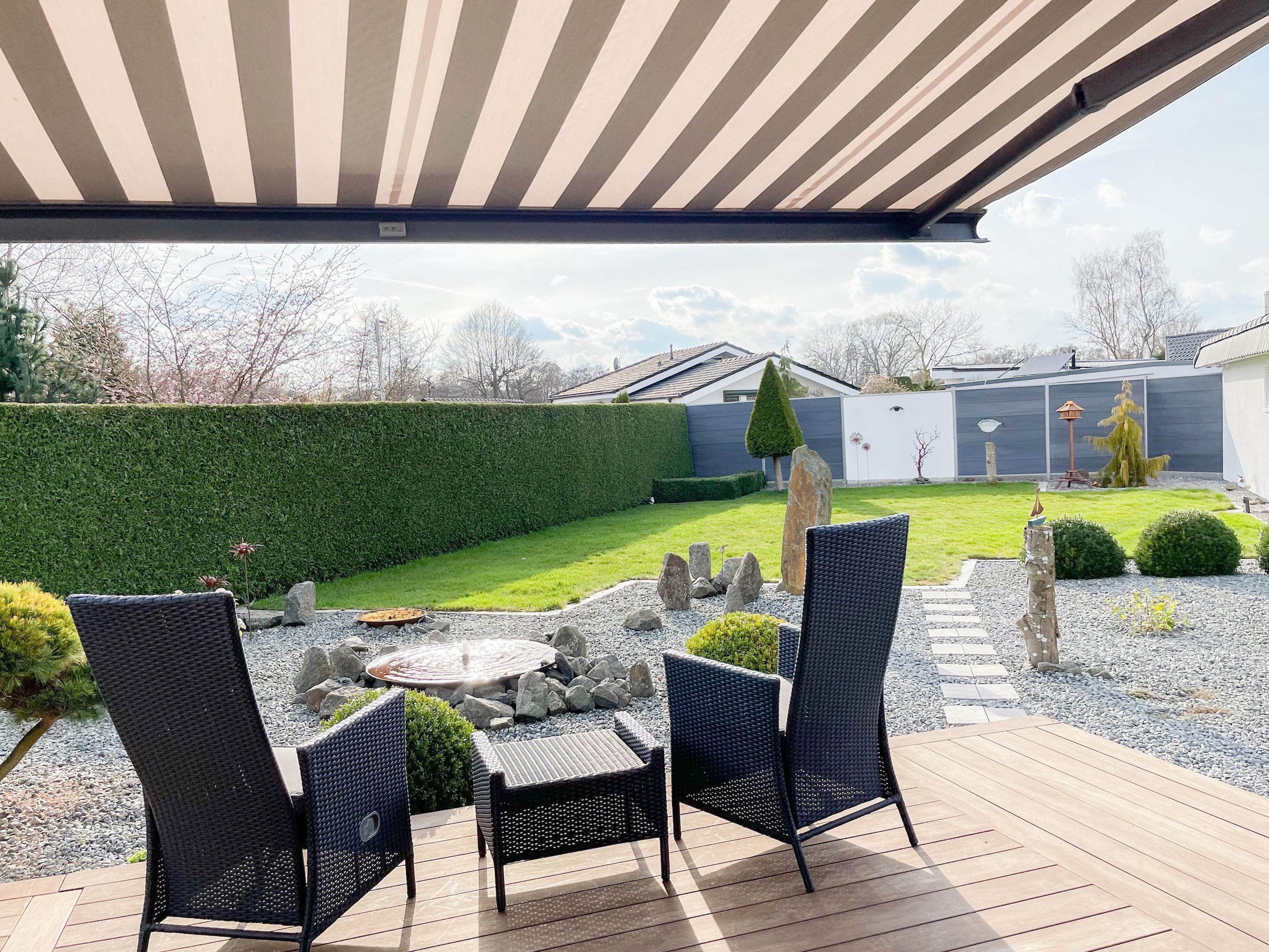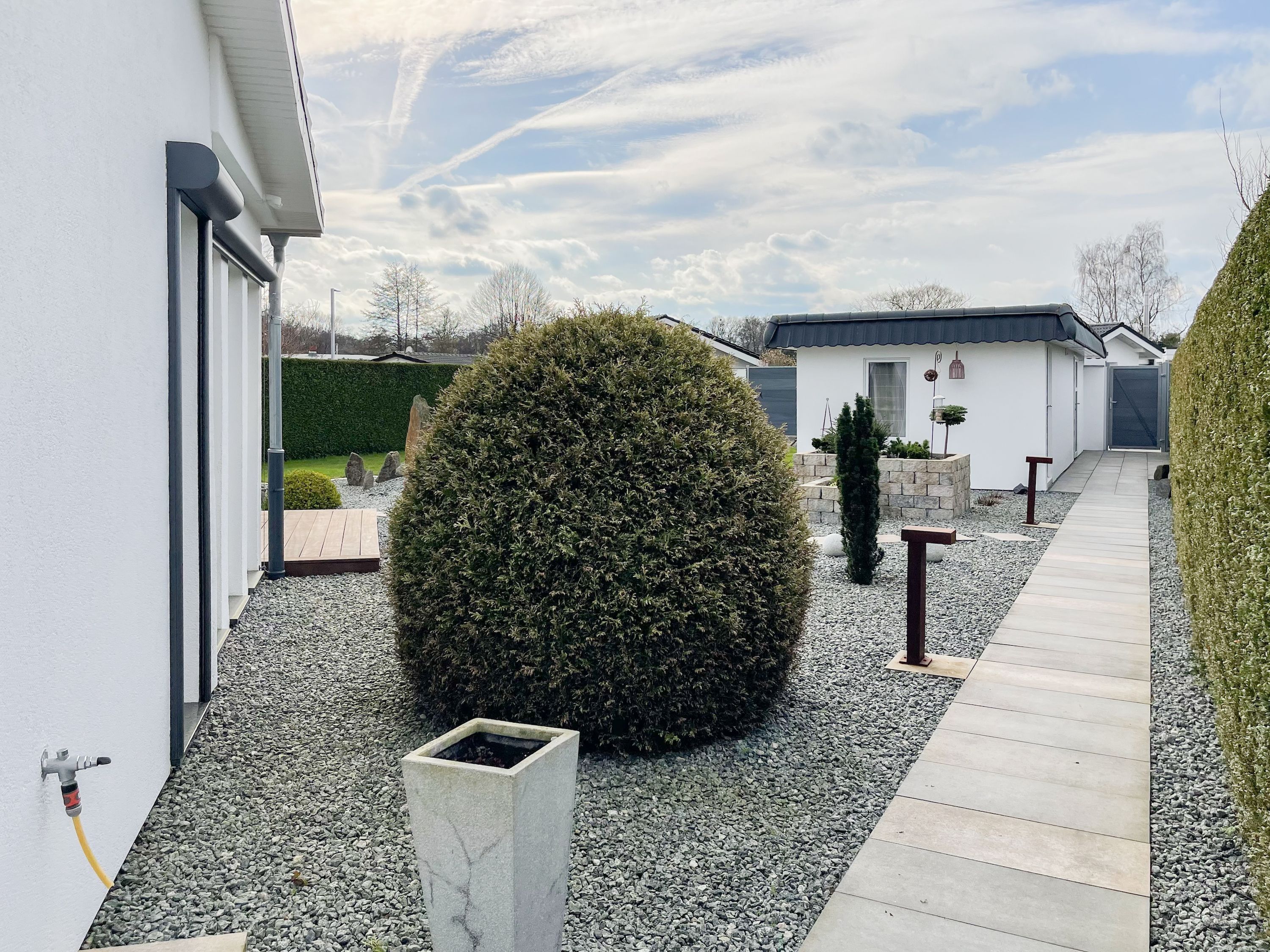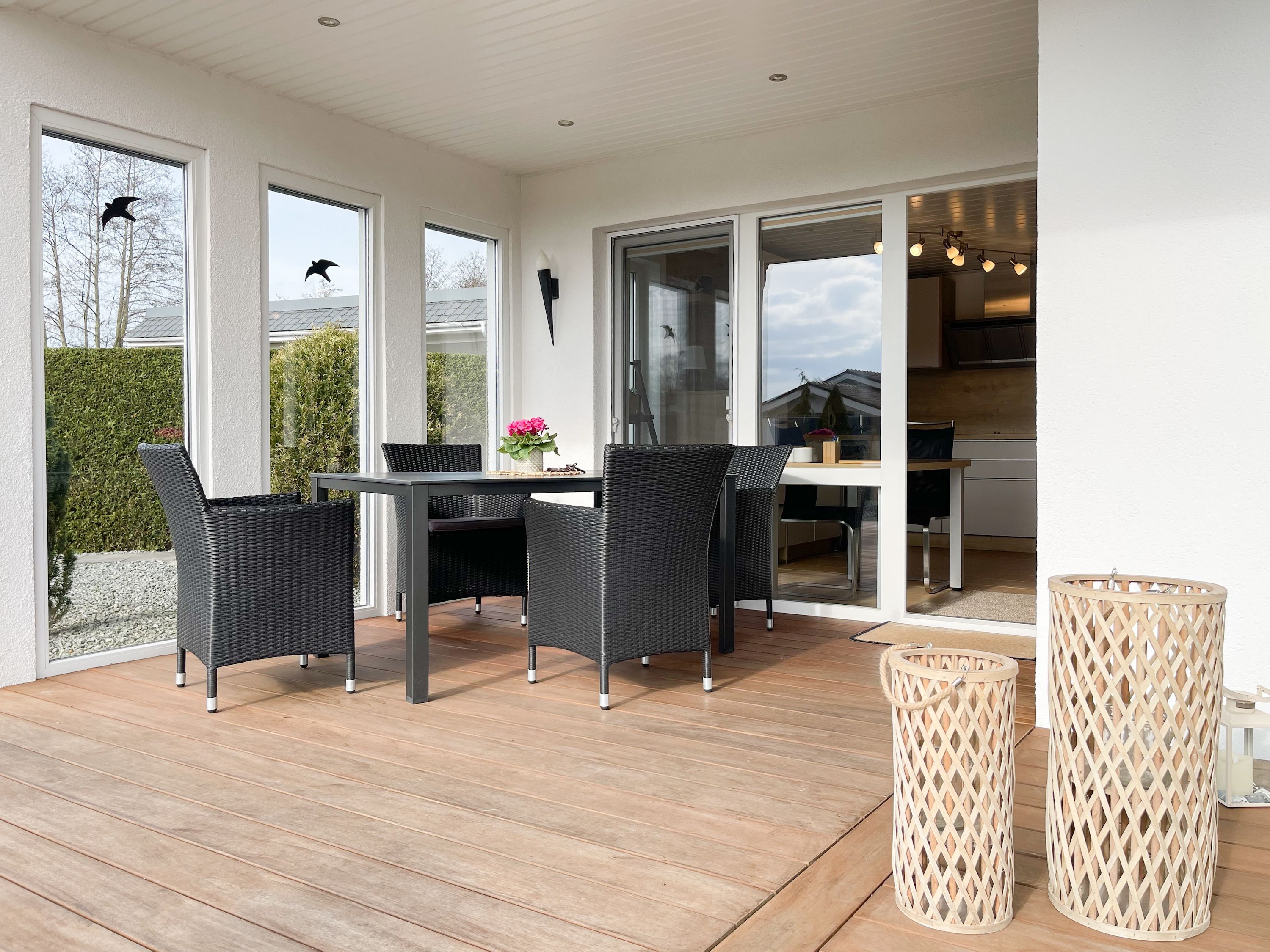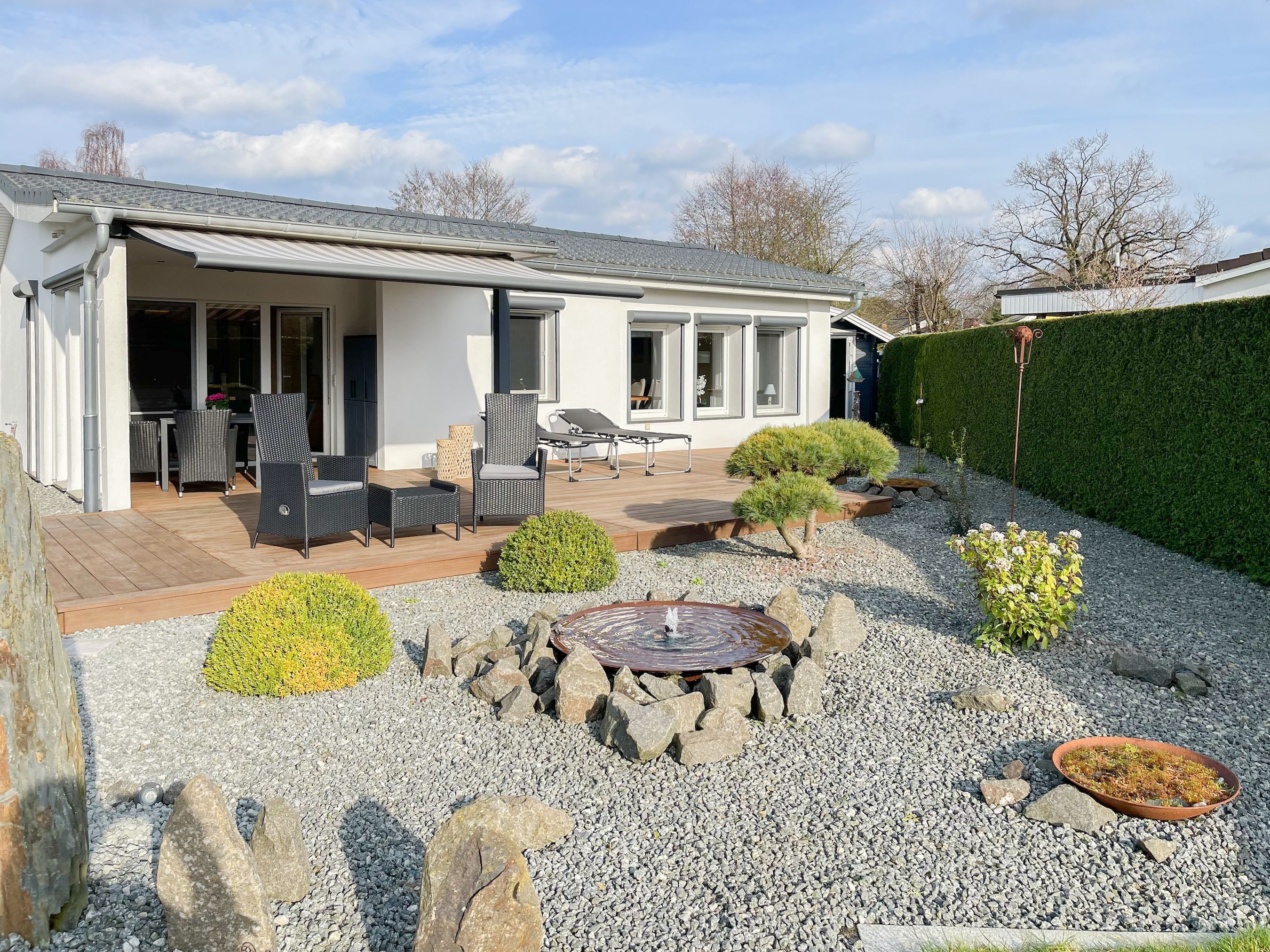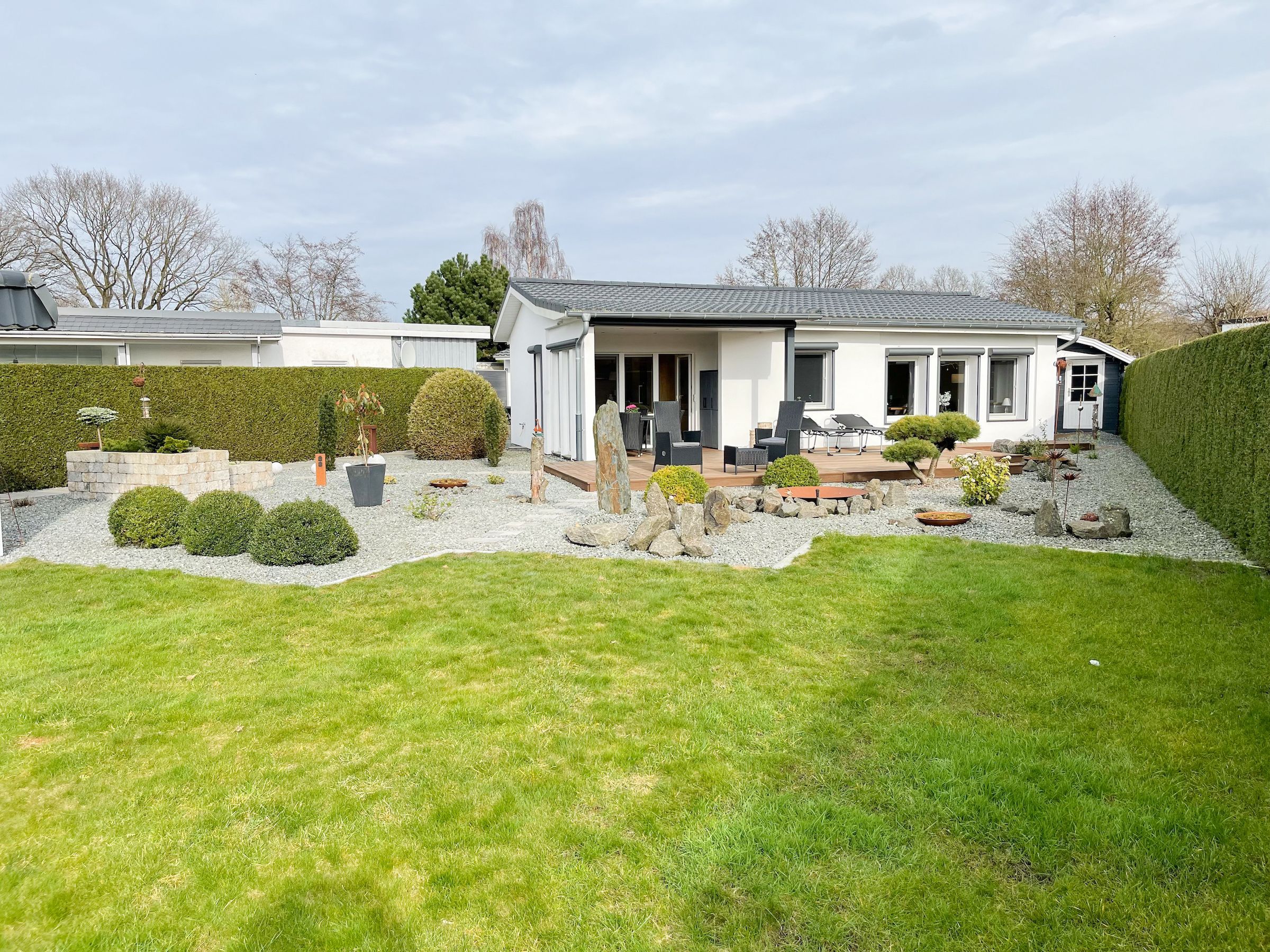 Das Ferienhaus Sonnendeck erfreut sich einer großzügigen, umzäunten Gartenanlage in Südwestlage, die absolute Privatsphäre garantiert. Ein Highlight ist die traumhafte Terrasse mit teilweiser Überdachung und windgeschütztem Bereich, perfekt ausgestattet mit Sonnenliegen, Gartenmöbeln und einer elektrischen Markise für entspannte Stunden im Freien. Für erholsame Momente sorgt die Infrarotsauna, die sich in einem separaten Saunahaus befindet. Hier finden Sie den idealen Ort, um Ihren Urlaub in vollen Zügen zu genießen. Das Haus verfügt über zwei moderne Bäder, zwei Küchen, komfortable Schlafzimmer mit TV, elektrische Außenjalousien, Insektenschutzgitter, WLAN, Bluetooth-Radio und vieles mehr. Eine Garage mit elektrischem Tor bietet Platz für einen PKW und Fahrräder sowie die Lademöglichkeit für E-Bikes, während ein weiterer Stellplatz auf dem Grundstück vorhanden ist.