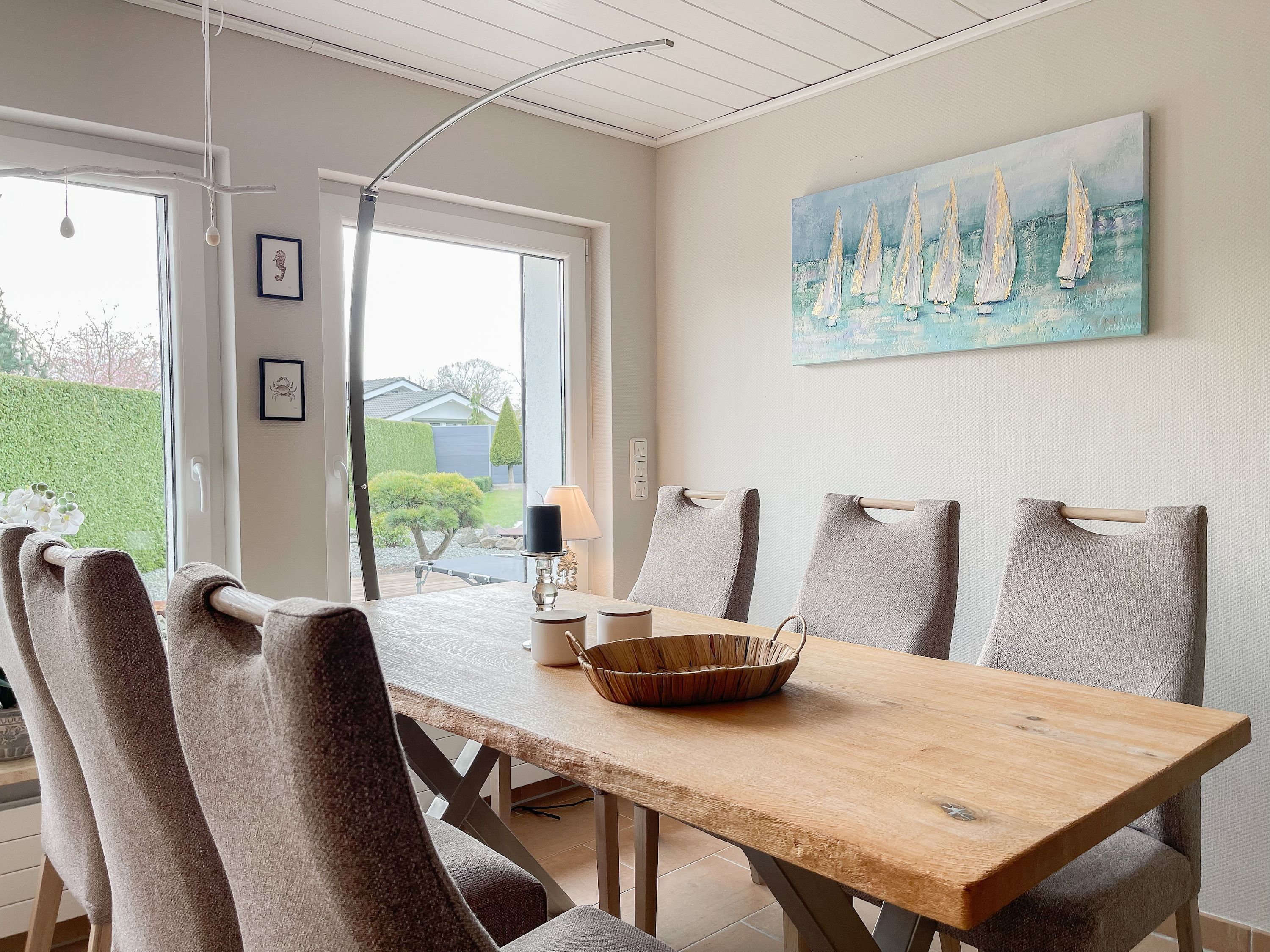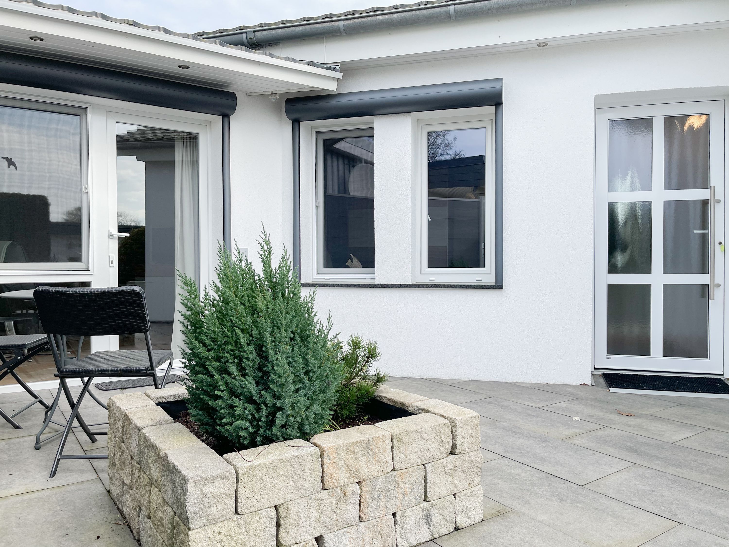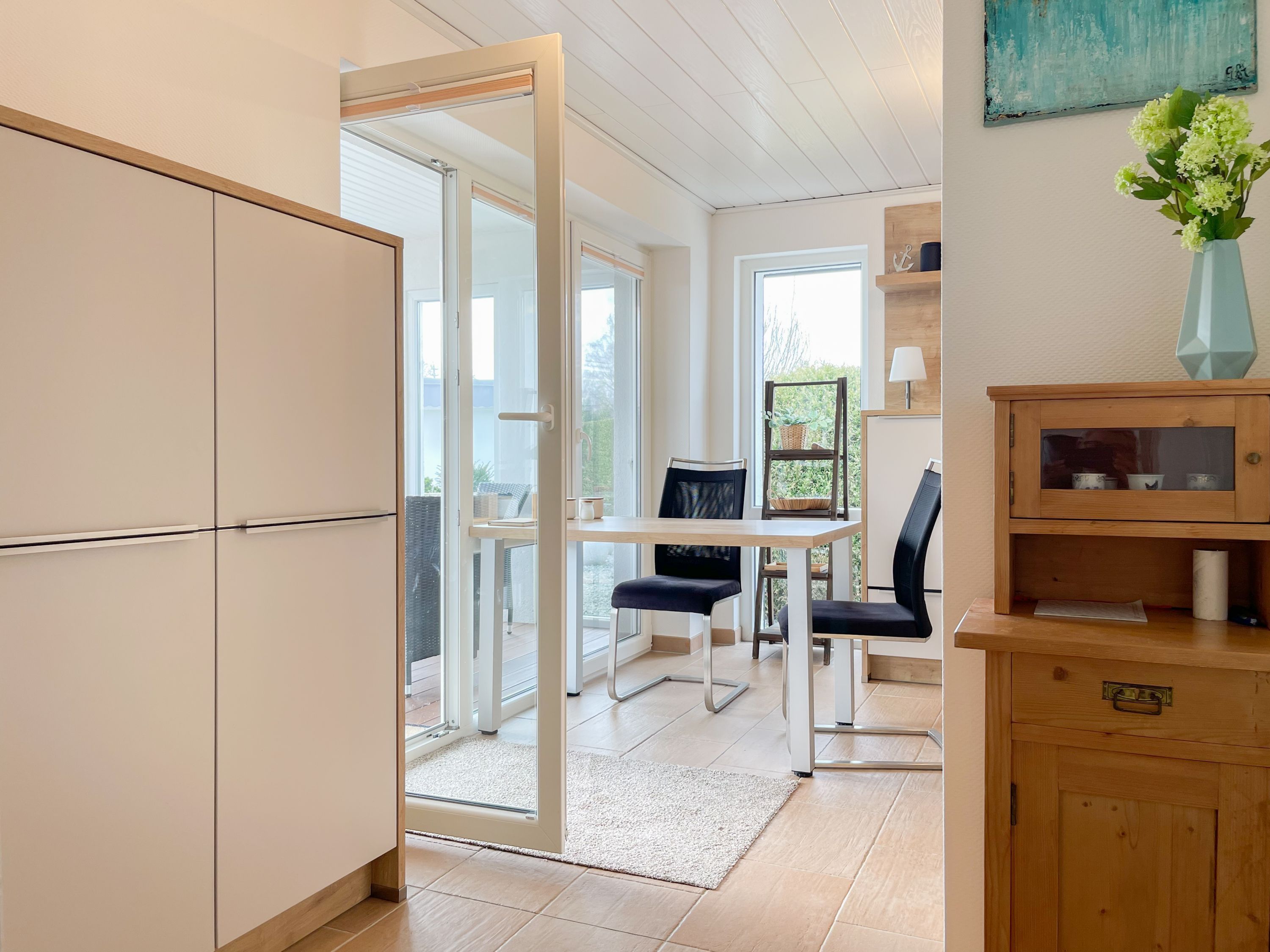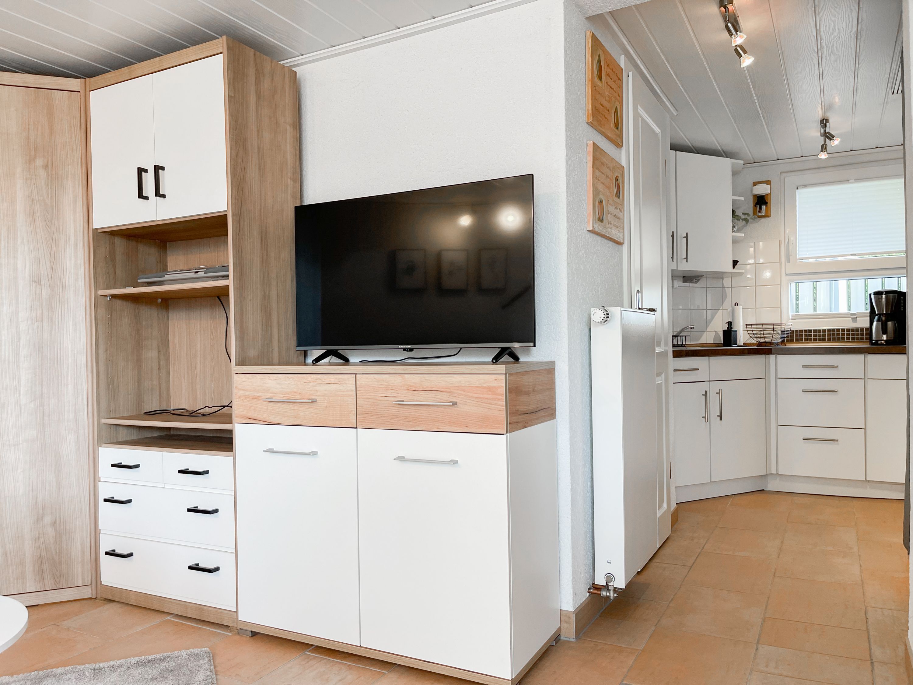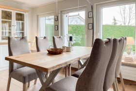 Das Objekt besteht aus 2 Wohneinheiten mit separaten Eingängen, die direkt nebeneinander liegen. Die Hauptwohneinheit bietet auf ca. 75 qm ausreichend Platz für eine Familie bis zu 5 Personen. Es erwartet Sie ein lichtdurchfluteter Wohnbereich mit wunderschönem Blick in den weitläufigen Garten; eingerichtet mit einem Sofa und einem großzügigen Essbereich für gemeinsame Mahlzeiten, Spieleabende oder gemütliches Beisammensein. Hobbyköche können sich freuen, denn die Küche ist mit allen technischen Geräten bis zur integrierten Waschmaschine perfekt ausgestattet. Der überdachte Bereich der Terrasse schließt sich direkt an die Küche an, sodass kurze Wege für Outdoor Mahlzeiten garantiert sind. Es gibt ein kleines Schlafzimmer mit einem Einzelbett (90x200) sowie zwei weitere Schlafzimmer mit Doppelbetten (160x200 und 140x200), die über das Bad zu erreichen sind. Das separate Studio (Deckenhöhe 209 cm) ist mit einem Schlafsofa (140x200), einem Relaxsessel, Kleiderschrank, TV und einem Essbereich für 2 Personen eingerichtet. Es gibt ein weiteres Duschbad sowie eine kleine Küche mit Kühlschrank, kleiner Kochplatte, Kaffeemaschine, Wasserkocher, Toaster, Waschmaschine und Trockner.