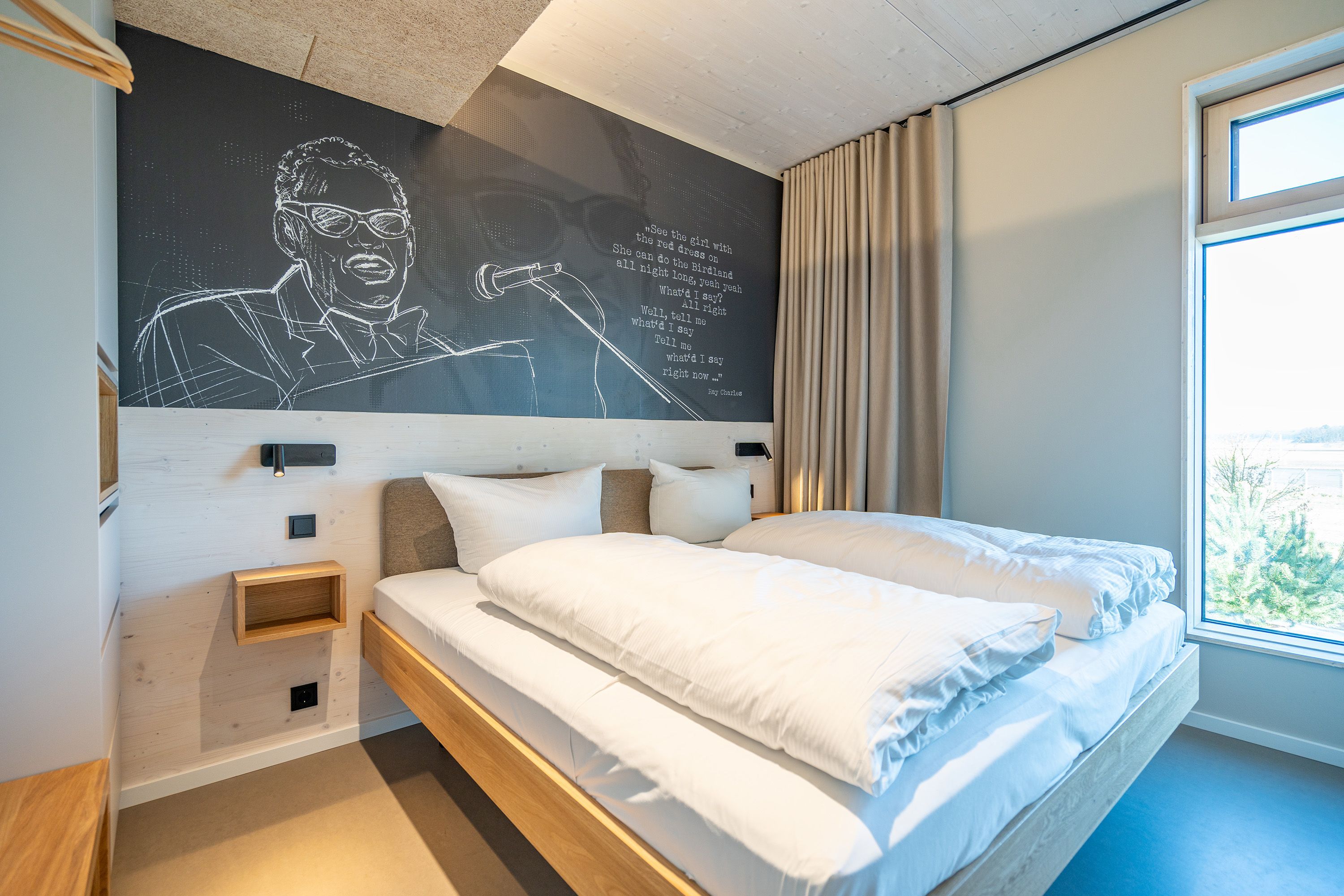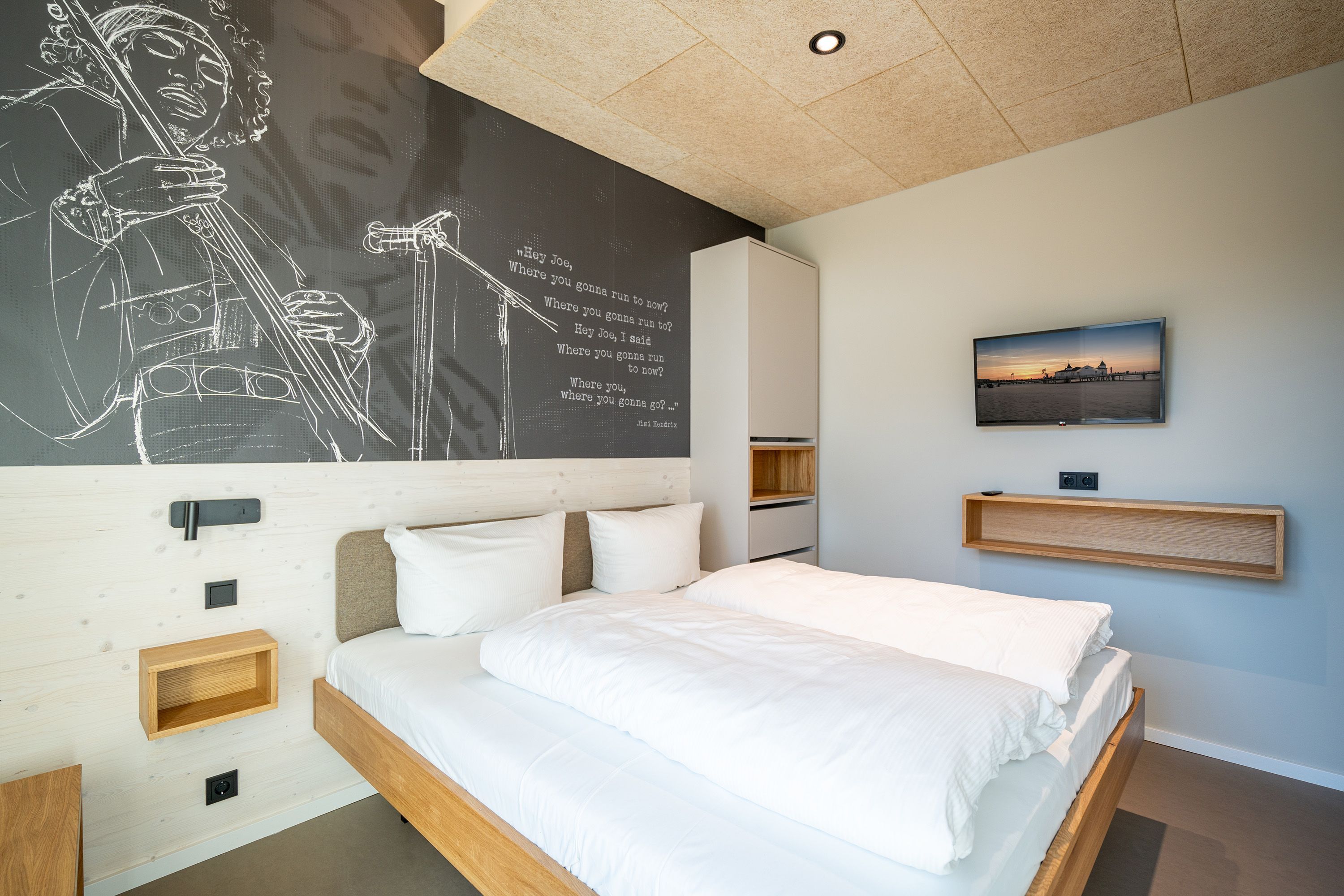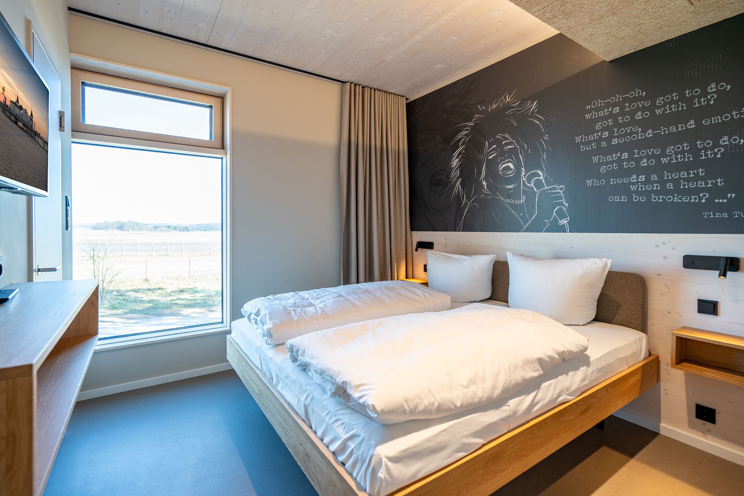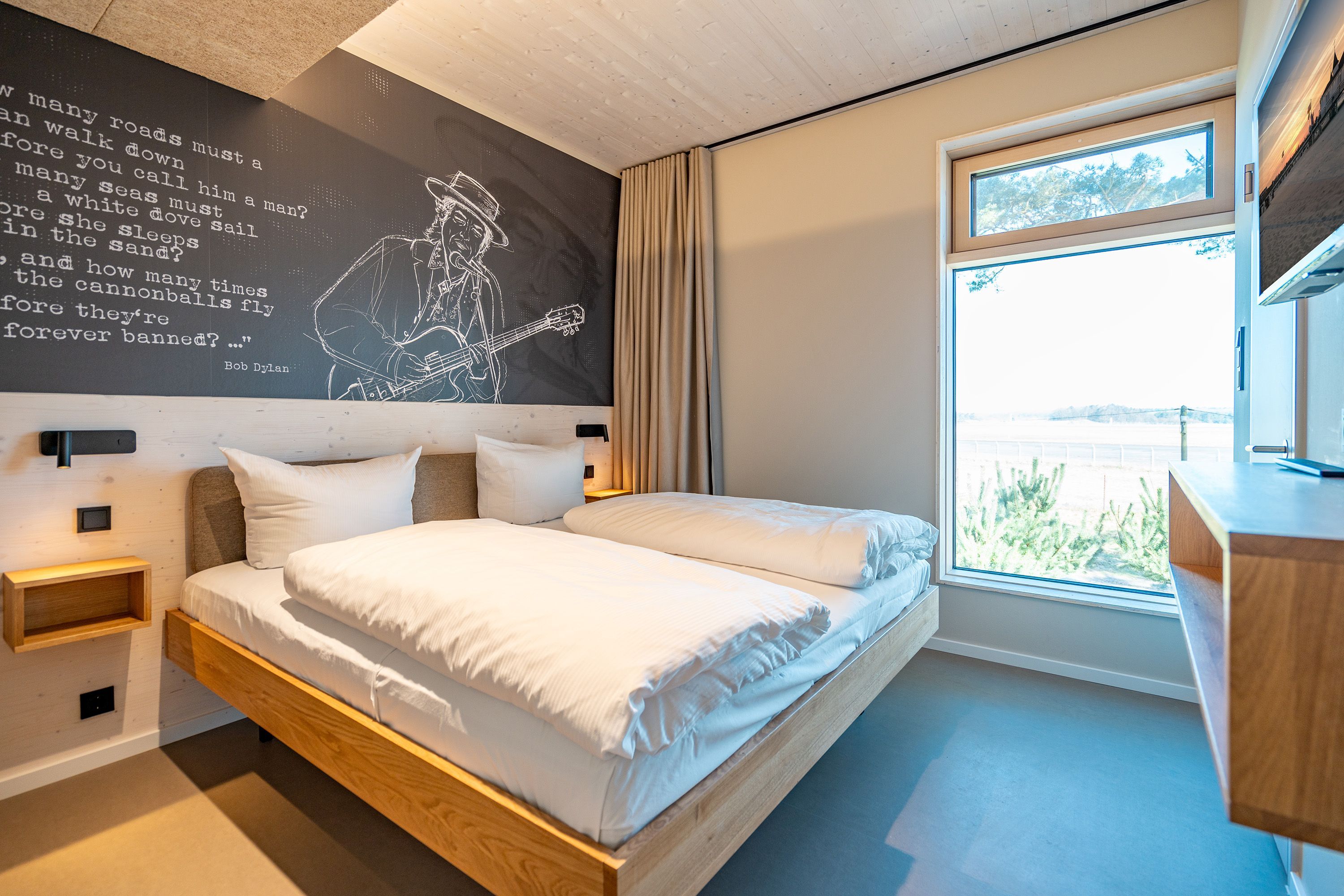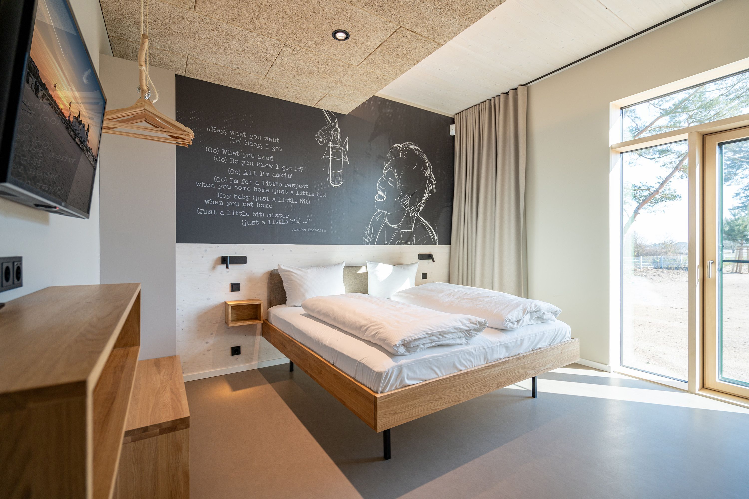 In dem 300 Quadratmeter großen Seminar- und Gästehaus mit großzügiger Außenanlage können bis zu 16 Personen nebst einem Kleinkind im Kinderreisebett beim Arbeiten oder Feiern, gemeinsam die Zeit genießen. In dieser besonderen Location kommen Bewohner nicht nur runter, sondern auf schöpferische Ideen voller Rhythm and Blues. Denn in der modernen Architektur des Hauses aus Stahl, Beton und Holz stecken jede Menge Reminiszenzen an die großen Künstler des Rockn Roll. Die Liebe zum musikalischen Detail steckt in vielen Kleinigkeiten. Wer mit offenen Augen durchs Haus schlendert, wird garantiert inspiriert. Legen Sie doch eine Platte auf dem Plattenspieler auf und träumen Sie sich in die Klänge großartiger Songs.Ein großer und offener Wohnbereich im Erdgeschoss ist perfekt dafür gemacht, Produktivität und Freizeit miteinander zu verbinden. Auch für große Familientreffen ist die Küstenkiste bestens geeignet. Im loftähnlichen Gemeinschaftsbereich lässt es sich wunderbar feiern, essen, gemeinsam kochen oder einfach nur zusammensitzen und das Leben genießen. Der Wohnbereich mit Ledersofas, Kamin und Klavier, der Essbereich mit riesiger Holztafel, die sich auch bestens zum Brainstormen, Diskutieren und Pläneschmieden eignet, und die supermoderne Küche sorgen für ein Gefühl von Freiheit und Nähe, von Unbeschwertheit und dem Fokus auf das Wesentliche. Auch im Innenhof und auf der Sonnenterrasse mit Grill laden zwei große Tafeln zum gemeinsamen Essen und Entspannen ein. Die Küche ist mit allem ausgestattet, was man sich für das Kochen in Gesellschaft nur wünschen kann. Sie verfügt über einen 6-Platten-Induktionsherd, einen Backofen sowie eine Mikrowelle-Backofen-Kombination. Auch mit 16 Mitbewohnern ist der Abwasch kein Problem. Denn den übernehmen zwei große Geschirrspüler. In den Schränken und in einem Serviceraum mit Waschmaschine, Trockner und zusätzlichem Kühl- und Gefrierschrank findet sich viel Stauraum für alle brauchbaren Utensilien, die dank Beschriftung, leicht zu finden sind. Die Gäste wohnen in acht Studios zwei im Erdgeschoss, sechs im 1. Obergeschoss mit Doppelbett, Kleiderschrank, Flat-TV, eigenem Tageslicht-Duschbad und separatem WC. Drei der Schlafzimmer verfügen über einen Zugang zum Balkon mit Haffblick. Aber auch alle anderen Zimmer haben aus dem Bett einen Blick ins Grüne. Jedes Zimmer ist einem anderen Musikgenie gewidmet. Entscheiden Sie selbst, ob Sie sich und ihre Träume lieber von Janis Joplin, Joni Mitchel oder von Bob Dylan beflügeln lassen wollen. Im Obergeschoss gibt es einen weiteren Loungebereich mit Flat-TV und Zugang zum Balkon. In einem Fitnessraum kann man sich an den hochwertigen Geräten der Firma Nohrd wunderbar auspowern, um anschließend in der Sauna oder im Whirlpool, die Energieakkus wieder aufzuladen. Doch das eigentliche Highlight des Anwesens ist der weitläufige Garten mit Beachvolleyballfeld auf echtem Strandsand, lauschigen Eckchen zum Sitzen, einem Hot Tub und einer großen Chillterrasse mit Haffblick. Parkplätze und eine Wallbox für Elektroautos (gegen Gebühr) gibt es vor dem Haus. Tierliebe Gäste können gegen Aufpreis bis zu zwei ihrer Lieblinge mitbringen.