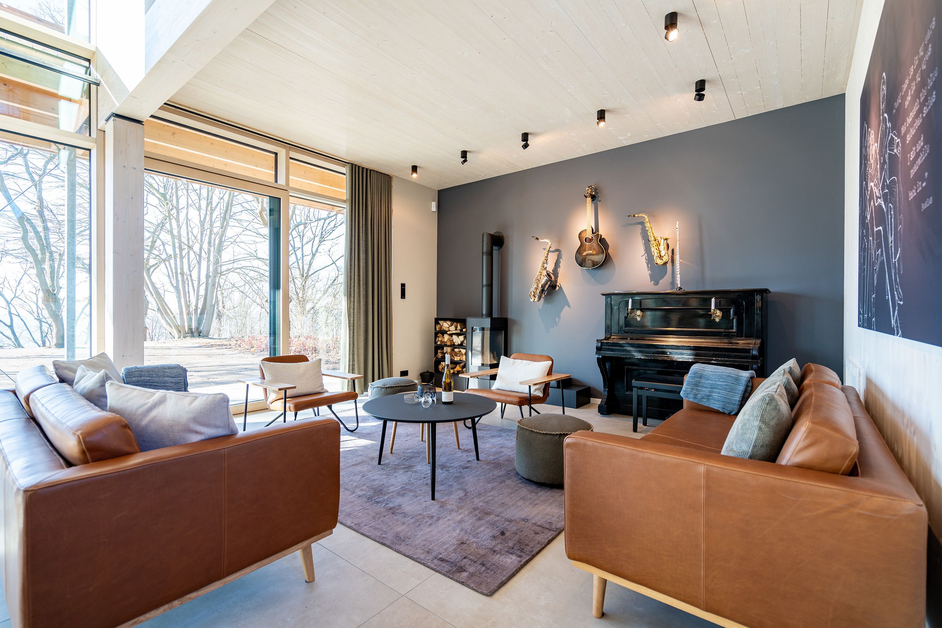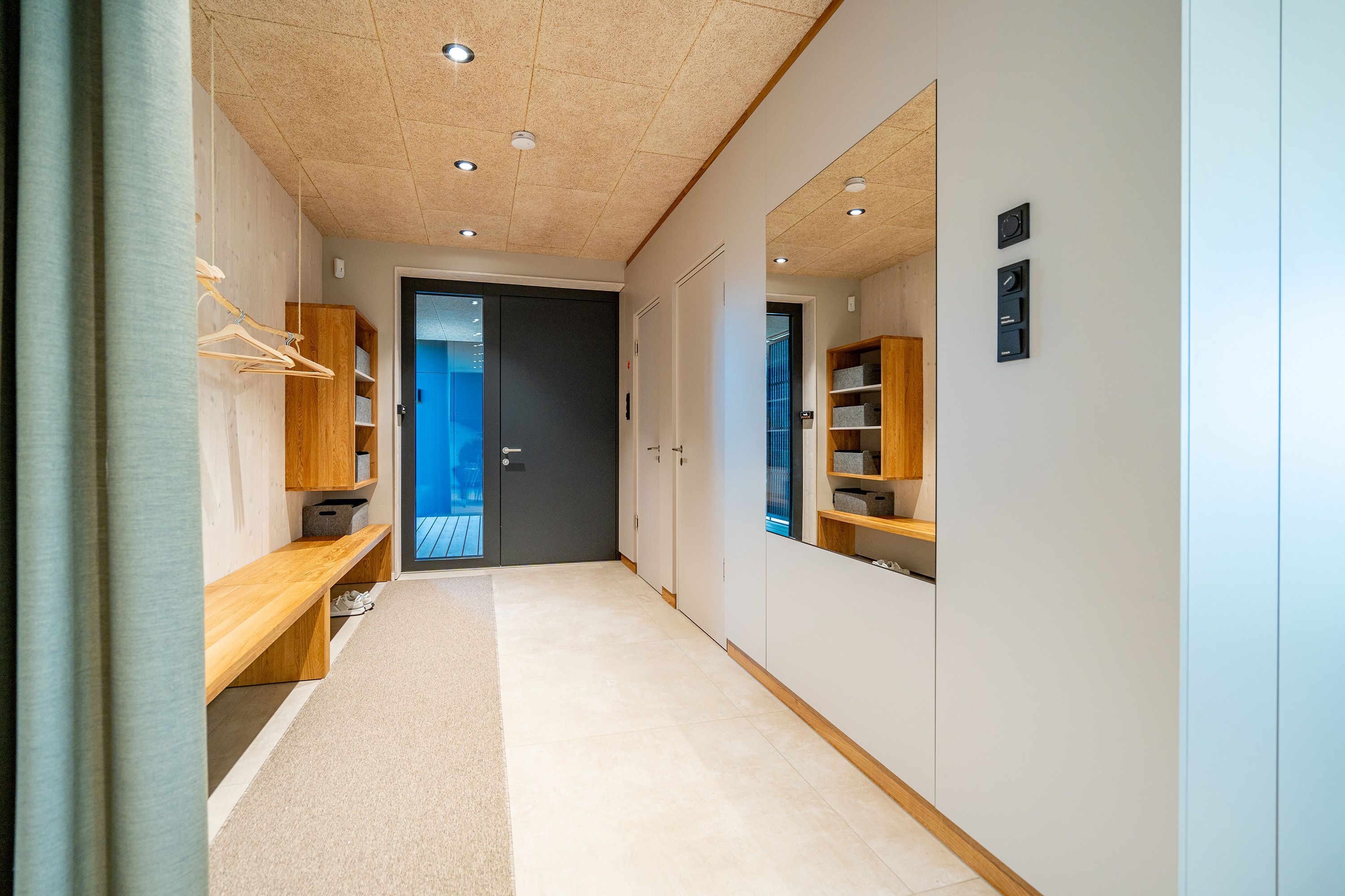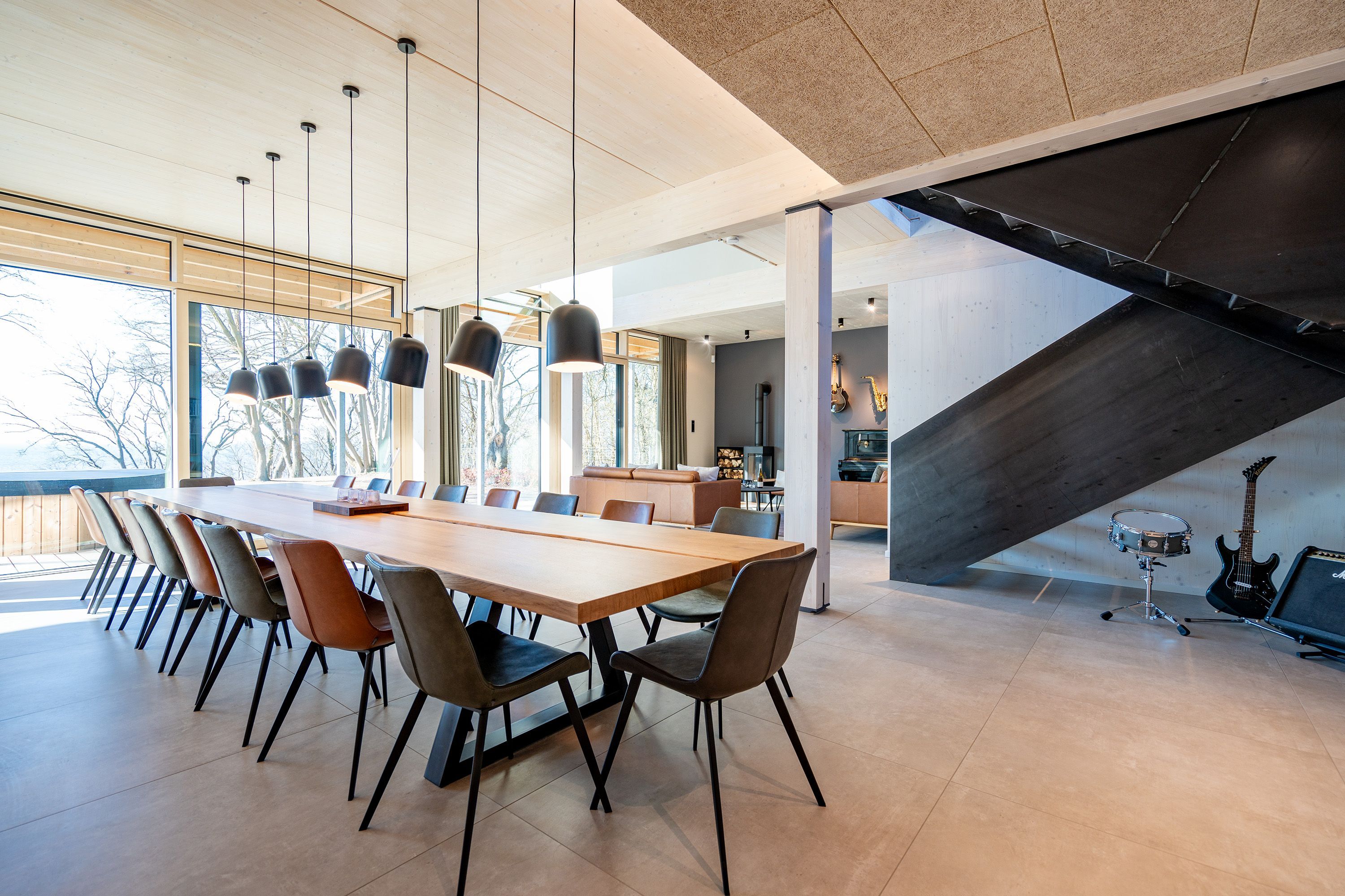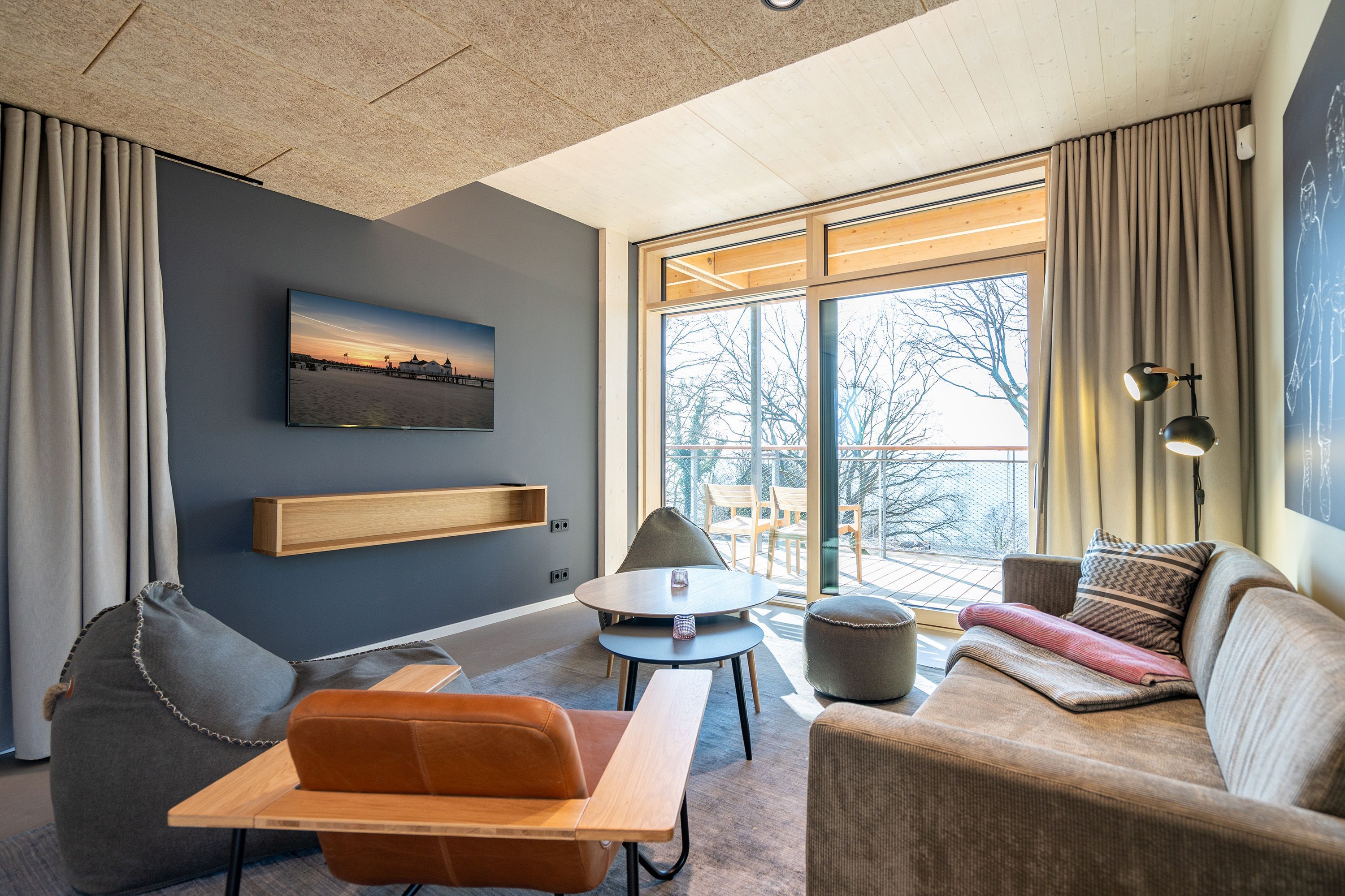 In dem 300 Quadratmeter großen Seminar- und Gästehaus mit großzügiger Außenanlage können bis zu 16 Personen nebst einem Kleinkind im Kinderreisebett beim Arbeiten oder Feiern, gemeinsam die Zeit genießen. In dieser besonderen Location kommen Bewohner nicht nur runter, sondern auf schöpferische Ideen voller Rhythm and Blues. Denn in der modernen Architektur des Hauses aus Stahl, Beton und Holz stecken jede Menge Reminiszenzen an die großen Künstler des Rockn Roll. Die Liebe zum musikalischen Detail steckt in vielen Kleinigkeiten. Wer mit offenen Augen durchs Haus schlendert, wird garantiert inspiriert. Legen Sie doch eine Platte auf dem Plattenspieler auf und träumen Sie sich in die Klänge großartiger Songs.Ein großer und offener Wohnbereich im Erdgeschoss ist perfekt dafür gemacht, Produktivität und Freizeit miteinander zu verbinden. Auch für große Familientreffen ist die Küstenkiste bestens geeignet. Im loftähnlichen Gemeinschaftsbereich lässt es sich wunderbar feiern, essen, gemeinsam kochen oder einfach nur zusammensitzen und das Leben genießen. Der Wohnbereich mit Ledersofas, Kamin und Klavier, der Essbereich mit riesiger Holztafel, die sich auch bestens zum Brainstormen, Diskutieren und Pläneschmieden eignet, und die supermoderne Küche sorgen für ein Gefühl von Freiheit und Nähe, von Unbeschwertheit und dem Fokus auf das Wesentliche. Auch im Innenhof und auf der Sonnenterrasse mit Grill laden zwei große Tafeln zum gemeinsamen Essen und Entspannen ein. Die Küche ist mit allem ausgestattet, was man sich für das Kochen in Gesellschaft nur wünschen kann. Sie verfügt über einen 6-Platten-Induktionsherd, einen Backofen sowie eine Mikrowelle-Backofen-Kombination. Auch mit 16 Mitbewohnern ist der Abwasch kein Problem. Denn den übernehmen zwei große Geschirrspüler. In den Schränken und in einem Serviceraum mit Waschmaschine, Trockner und zusätzlichem Kühl- und Gefrierschrank findet sich viel Stauraum für alle brauchbaren Utensilien, die dank Beschriftung, leicht zu finden sind. Die Gäste wohnen in acht Studios zwei im Erdgeschoss, sechs im 1. Obergeschoss mit Doppelbett, Kleiderschrank, Flat-TV, eigenem Tageslicht-Duschbad und separatem WC. Drei der Schlafzimmer verfügen über einen Zugang zum Balkon mit Haffblick. Aber auch alle anderen Zimmer haben aus dem Bett einen Blick ins Grüne. Jedes Zimmer ist einem anderen Musikgenie gewidmet. Entscheiden Sie selbst, ob Sie sich und ihre Träume lieber von Janis Joplin, Joni Mitchel oder von Bob Dylan beflügeln lassen wollen. Im Obergeschoss gibt es einen weiteren Loungebereich mit Flat-TV und Zugang zum Balkon. In einem Fitnessraum kann man sich an den hochwertigen Geräten der Firma Nohrd wunderbar auspowern, um anschließend in der Sauna oder im Whirlpool, die Energieakkus wieder aufzuladen. Doch das eigentliche Highlight des Anwesens ist der weitläufige Garten mit Beachvolleyballfeld auf echtem Strandsand, lauschigen Eckchen zum Sitzen, einem Hot Tub und einer großen Chillterrasse mit Haffblick. Parkplätze und eine Wallbox für Elektroautos (gegen Gebühr) gibt es vor dem Haus. Tierliebe Gäste können gegen Aufpreis bis zu zwei ihrer Lieblinge mitbringen.