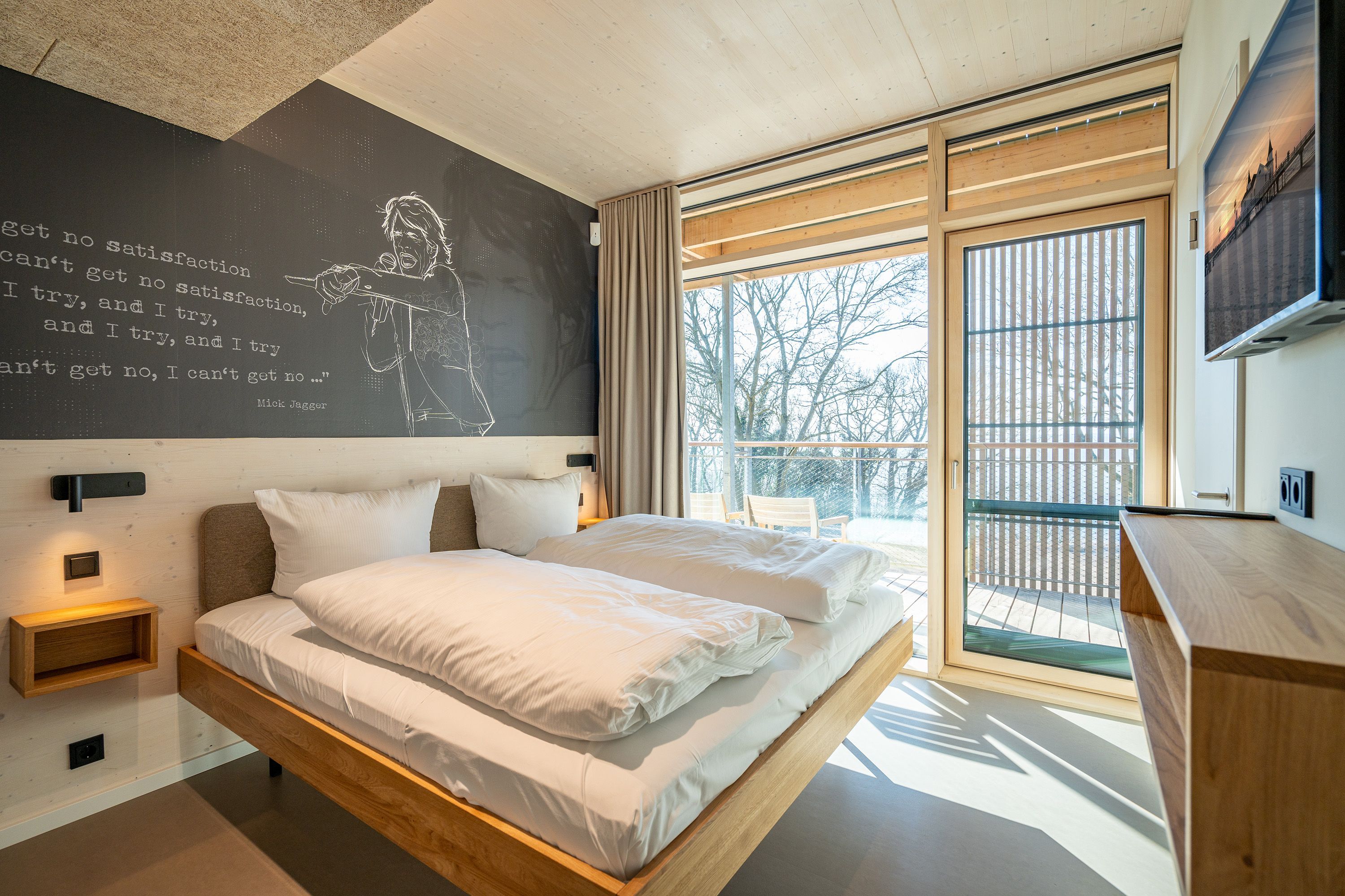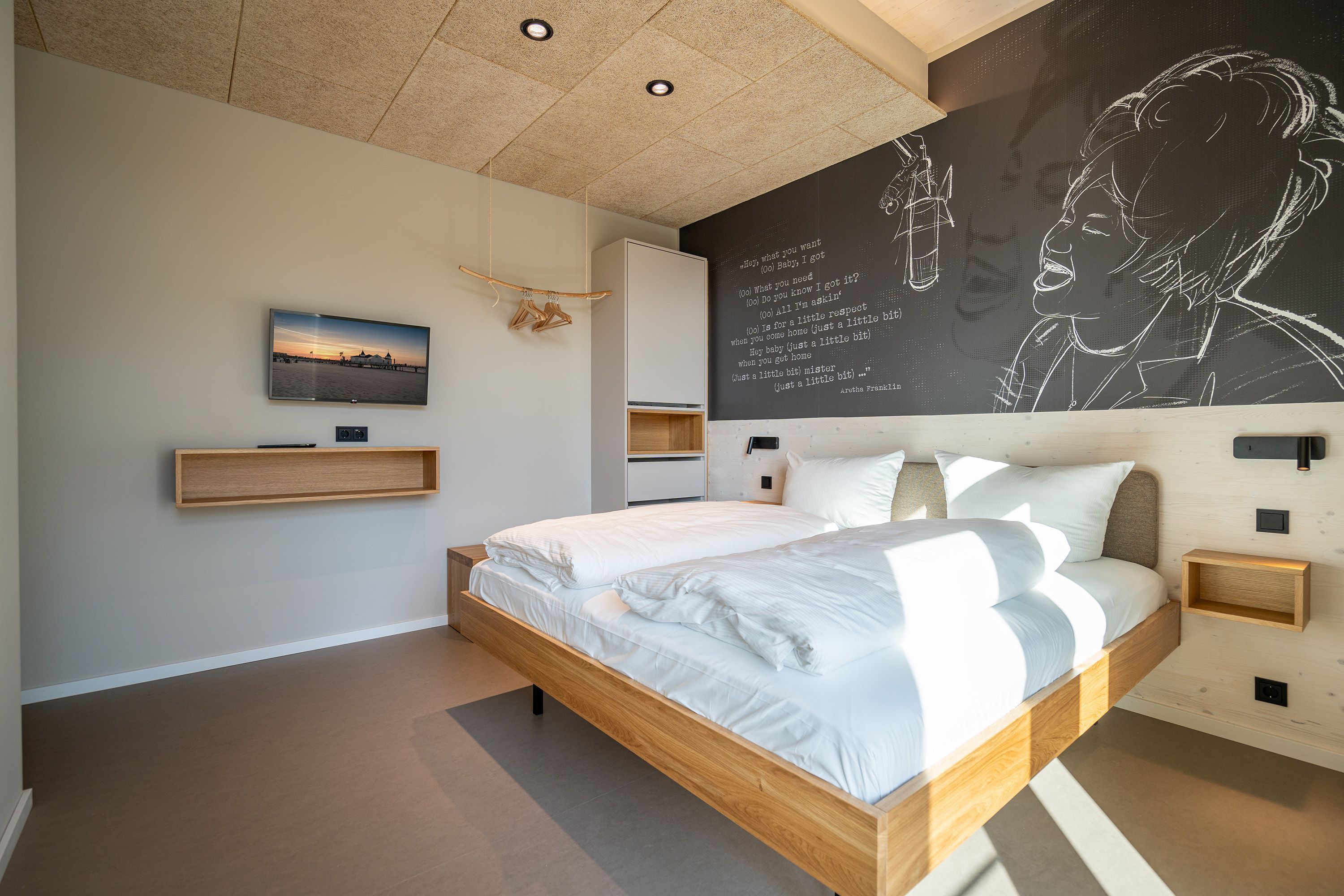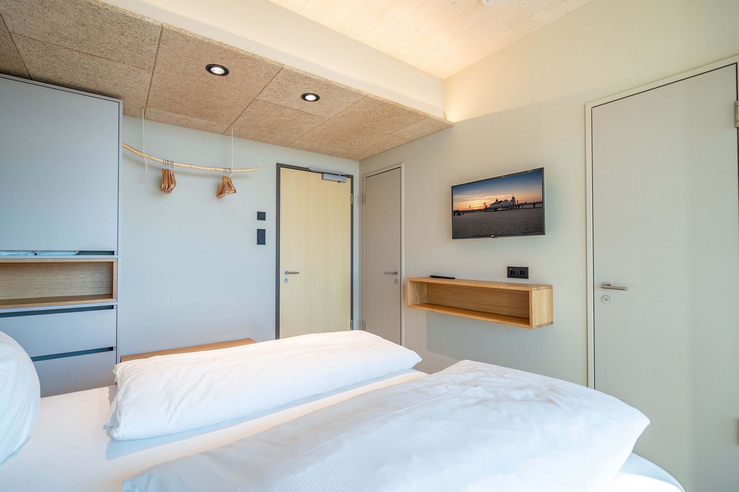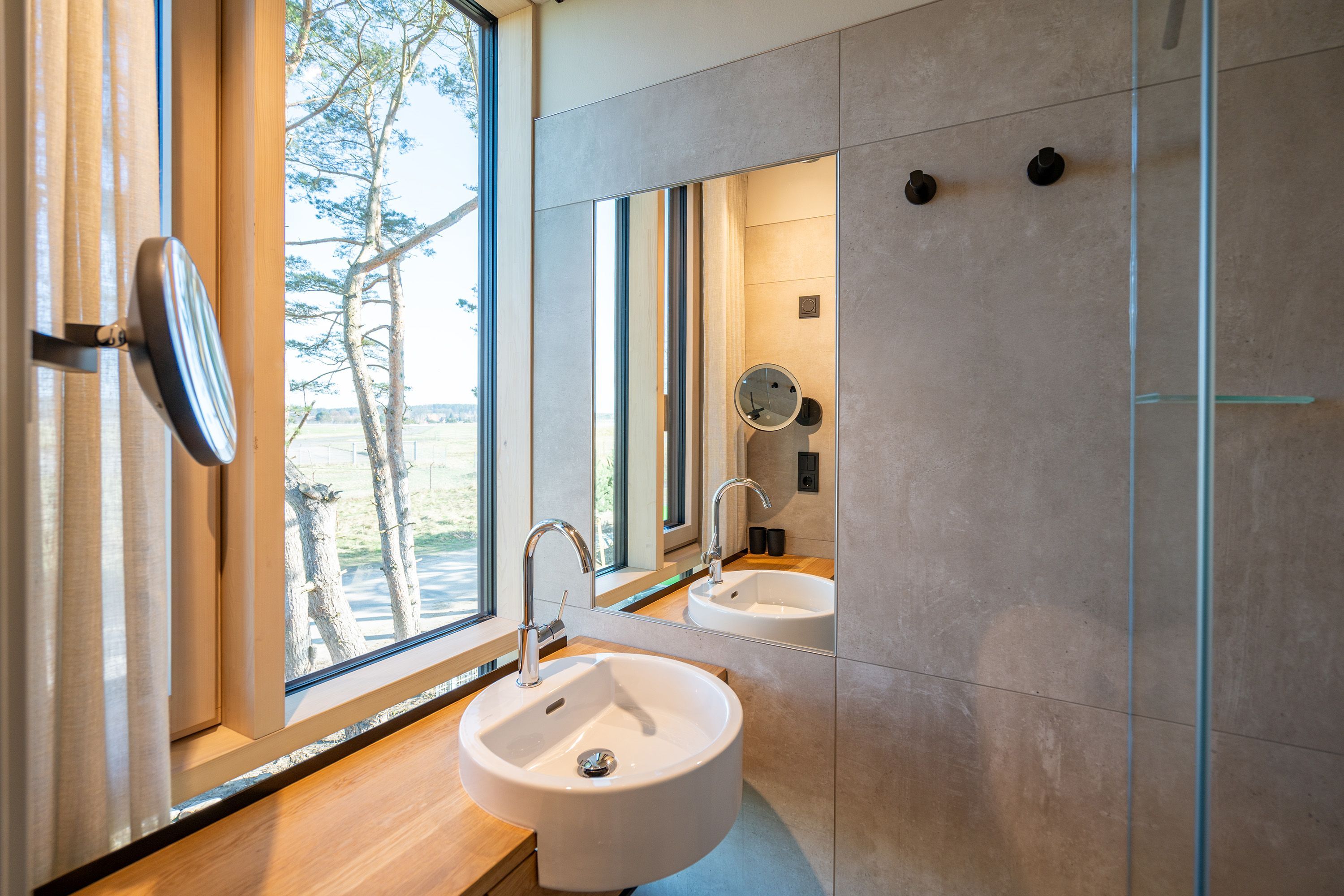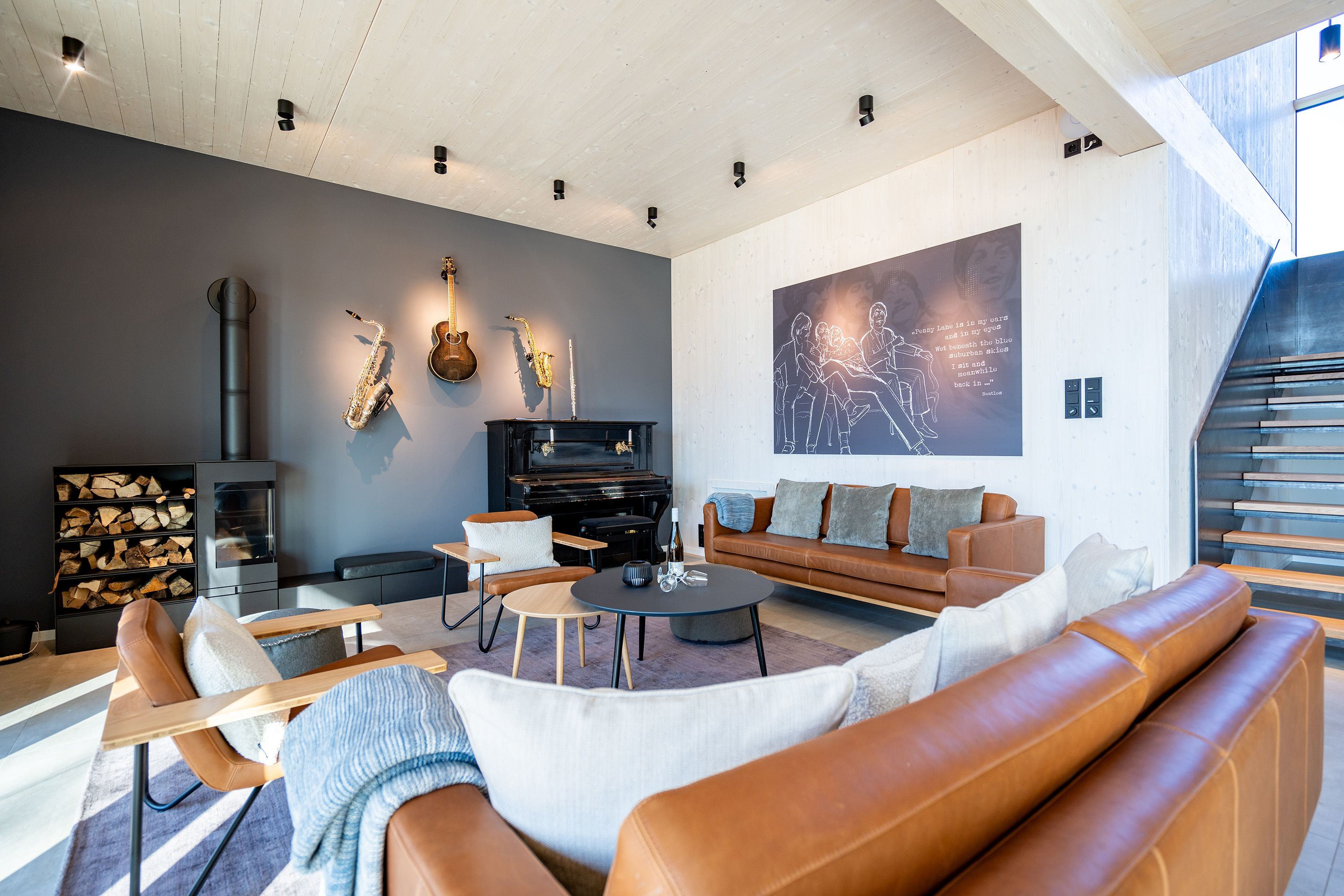 In dem 300 Quadratmeter großen Seminar- und Gästehaus mit großzügiger Außenanlage können bis zu 16 Personen nebst einem Kleinkind im Kinderreisebett beim Arbeiten oder Feiern, gemeinsam die Zeit genießen. In dieser besonderen Location kommen Bewohner nicht nur runter, sondern auf schöpferische Ideen voller Rhythm and Blues. Denn in der modernen Architektur des Hauses aus Stahl, Beton und Holz stecken jede Menge Reminiszenzen an die großen Künstler des Rockn Roll. Die Liebe zum musikalischen Detail steckt in vielen Kleinigkeiten. Wer mit offenen Augen durchs Haus schlendert, wird garantiert inspiriert. Legen Sie doch eine Platte auf dem Plattenspieler auf und träumen Sie sich in die Klänge großartiger Songs.Ein großer und offener Wohnbereich im Erdgeschoss ist perfekt dafür gemacht, Produktivität und Freizeit miteinander zu verbinden. Auch für große Familientreffen ist die Küstenkiste bestens geeignet. Im loftähnlichen Gemeinschaftsbereich lässt es sich wunderbar feiern, essen, gemeinsam kochen oder einfach nur zusammensitzen und das Leben genießen. Der Wohnbereich mit Ledersofas, Kamin und Klavier, der Essbereich mit riesiger Holztafel, die sich auch bestens zum Brainstormen, Diskutieren und Pläneschmieden eignet, und die supermoderne Küche sorgen für ein Gefühl von Freiheit und Nähe, von Unbeschwertheit und dem Fokus auf das Wesentliche. Auch im Innenhof und auf der Sonnenterrasse mit Grill laden zwei große Tafeln zum gemeinsamen Essen und Entspannen ein. Die Küche ist mit allem ausgestattet, was man sich für das Kochen in Gesellschaft nur wünschen kann. Sie verfügt über einen 6-Platten-Induktionsherd, einen Backofen sowie eine Mikrowelle-Backofen-Kombination. Auch mit 16 Mitbewohnern ist der Abwasch kein Problem. Denn den übernehmen zwei große Geschirrspüler. In den Schränken und in einem Serviceraum mit Waschmaschine, Trockner und zusätzlichem Kühl- und Gefrierschrank findet sich viel Stauraum für alle brauchbaren Utensilien, die dank Beschriftung, leicht zu finden sind. Die Gäste wohnen in acht Studios zwei im Erdgeschoss, sechs im 1. Obergeschoss mit Doppelbett, Kleiderschrank, Flat-TV, eigenem Tageslicht-Duschbad und separatem WC. Drei der Schlafzimmer verfügen über einen Zugang zum Balkon mit Haffblick. Aber auch alle anderen Zimmer haben aus dem Bett einen Blick ins Grüne. Jedes Zimmer ist einem anderen Musikgenie gewidmet. Entscheiden Sie selbst, ob Sie sich und ihre Träume lieber von Janis Joplin, Joni Mitchel oder von Bob Dylan beflügeln lassen wollen. Im Obergeschoss gibt es einen weiteren Loungebereich mit Flat-TV und Zugang zum Balkon. In einem Fitnessraum kann man sich an den hochwertigen Geräten der Firma Nohrd wunderbar auspowern, um anschließend in der Sauna oder im Whirlpool, die Energieakkus wieder aufzuladen. Doch das eigentliche Highlight des Anwesens ist der weitläufige Garten mit Beachvolleyballfeld auf echtem Strandsand, lauschigen Eckchen zum Sitzen, einem Hot Tub und einer großen Chillterrasse mit Haffblick. Parkplätze und eine Wallbox für Elektroautos (gegen Gebühr) gibt es vor dem Haus. Tierliebe Gäste können gegen Aufpreis bis zu zwei ihrer Lieblinge mitbringen.