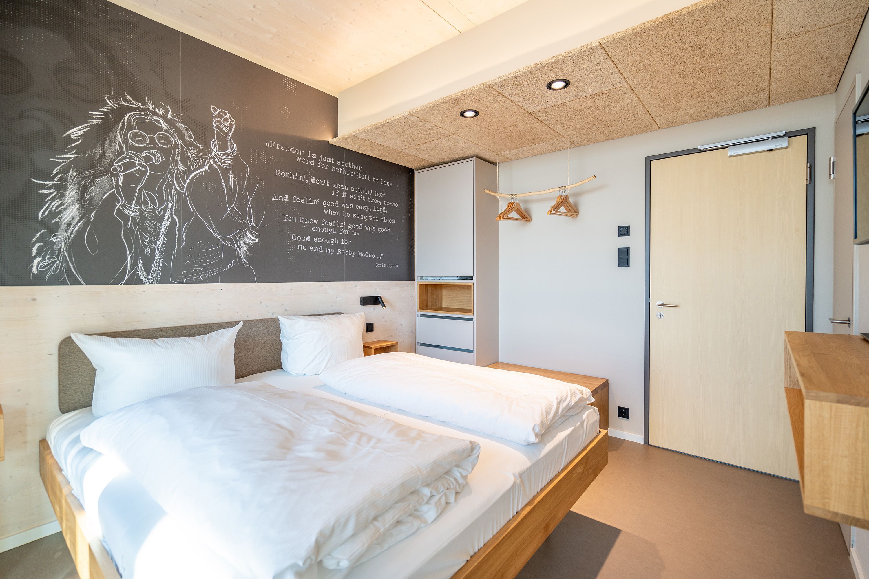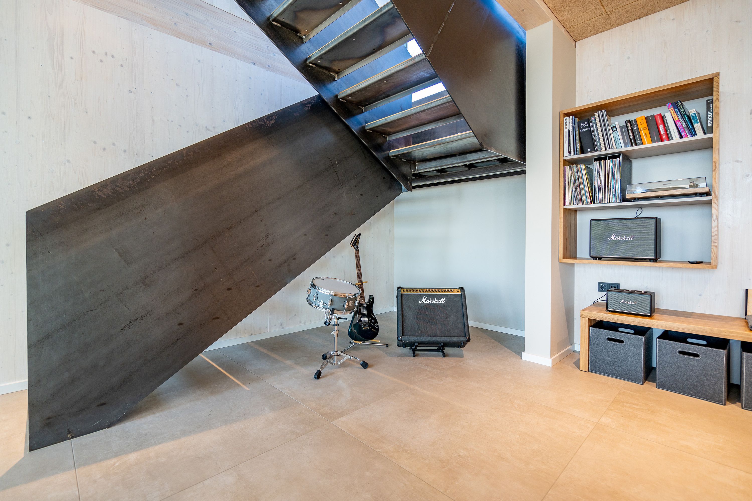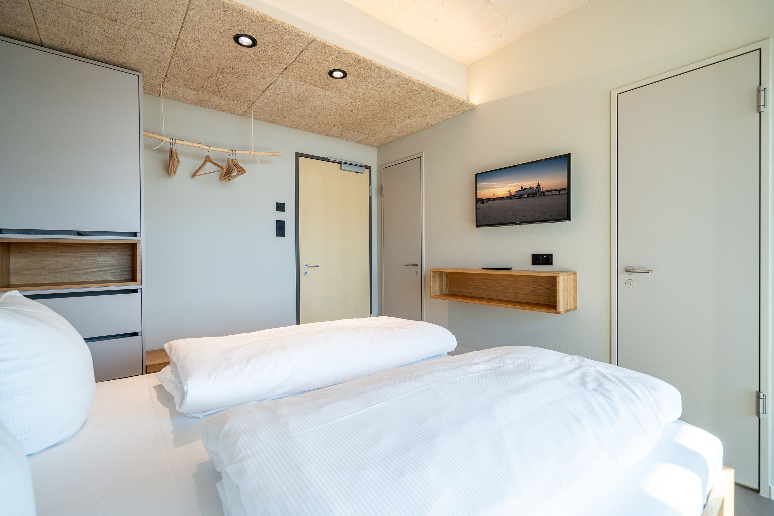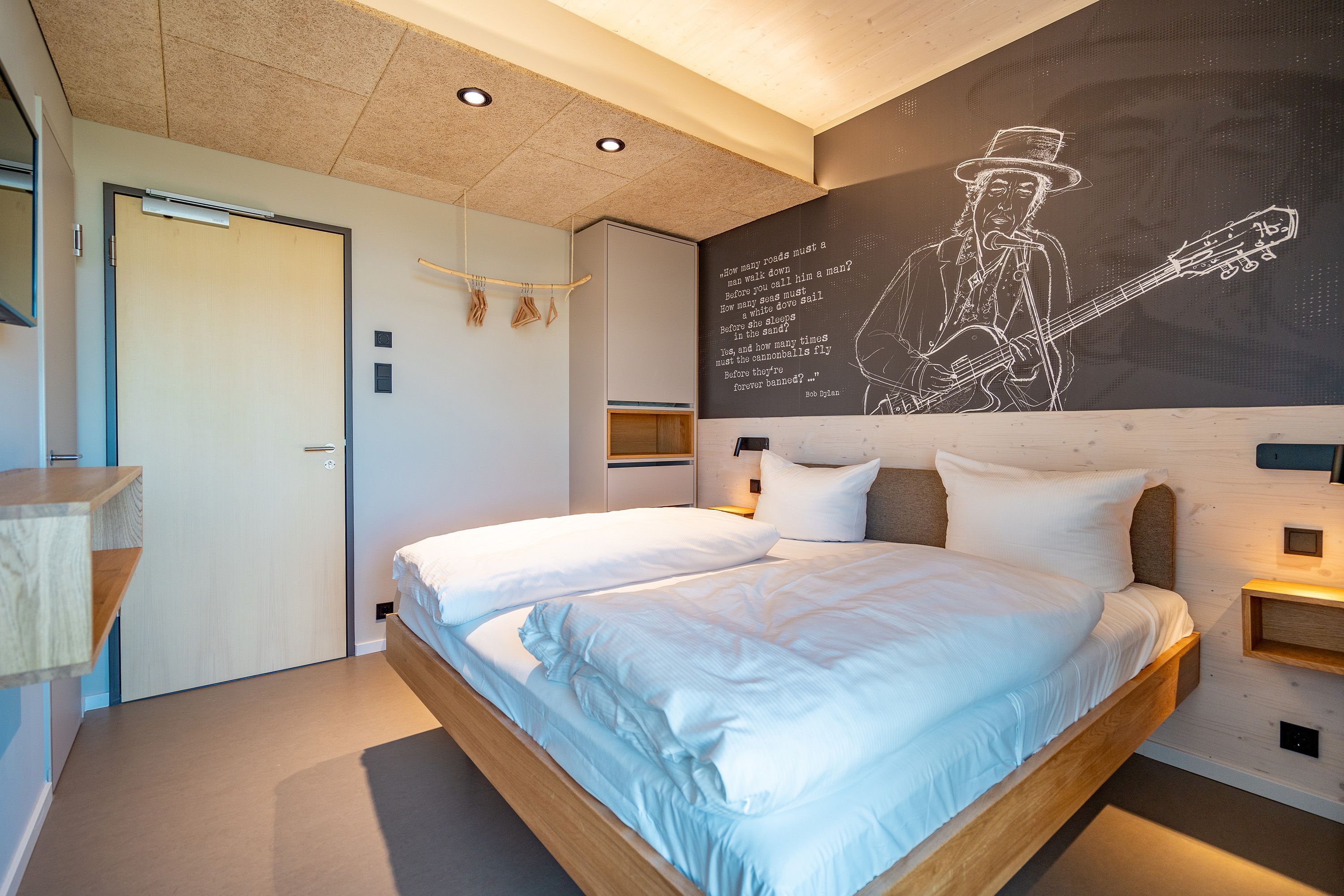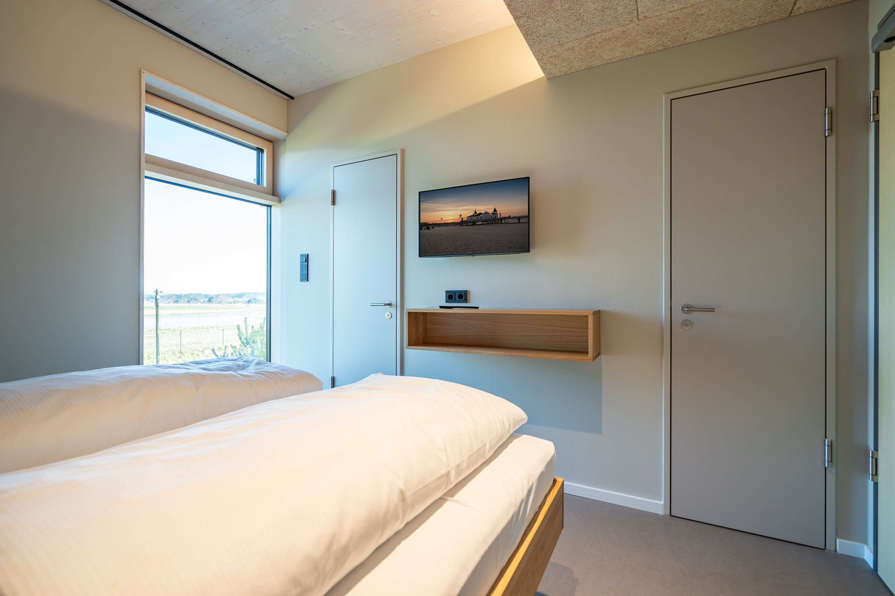 In dem 300 Quadratmeter großen Seminar- und Gästehaus mit großzügiger Außenanlage können bis zu 16 Personen nebst einem Kleinkind im Kinderreisebett beim Arbeiten oder Feiern, gemeinsam die Zeit genießen. In dieser besonderen Location kommen Bewohner nicht nur runter, sondern auf schöpferische Ideen voller Rhythm and Blues. Denn in der modernen Architektur des Hauses aus Stahl, Beton und Holz stecken jede Menge Reminiszenzen an die großen Künstler des Rockn Roll. Die Liebe zum musikalischen Detail steckt in vielen Kleinigkeiten. Wer mit offenen Augen durchs Haus schlendert, wird garantiert inspiriert. Legen Sie doch eine Platte auf dem Plattenspieler auf und träumen Sie sich in die Klänge großartiger Songs.Ein großer und offener Wohnbereich im Erdgeschoss ist perfekt dafür gemacht, Produktivität und Freizeit miteinander zu verbinden. Auch für große Familientreffen ist die Küstenkiste bestens geeignet. Im loftähnlichen Gemeinschaftsbereich lässt es sich wunderbar feiern, essen, gemeinsam kochen oder einfach nur zusammensitzen und das Leben genießen. Der Wohnbereich mit Ledersofas, Kamin und Klavier, der Essbereich mit riesiger Holztafel, die sich auch bestens zum Brainstormen, Diskutieren und Pläneschmieden eignet, und die supermoderne Küche sorgen für ein Gefühl von Freiheit und Nähe, von Unbeschwertheit und dem Fokus auf das Wesentliche. Auch im Innenhof und auf der Sonnenterrasse mit Grill laden zwei große Tafeln zum gemeinsamen Essen und Entspannen ein. Die Küche ist mit allem ausgestattet, was man sich für das Kochen in Gesellschaft nur wünschen kann. Sie verfügt über einen 6-Platten-Induktionsherd, einen Backofen sowie eine Mikrowelle-Backofen-Kombination. Auch mit 16 Mitbewohnern ist der Abwasch kein Problem. Denn den übernehmen zwei große Geschirrspüler. In den Schränken und in einem Serviceraum mit Waschmaschine, Trockner und zusätzlichem Kühl- und Gefrierschrank findet sich viel Stauraum für alle brauchbaren Utensilien, die dank Beschriftung, leicht zu finden sind. Die Gäste wohnen in acht Studios zwei im Erdgeschoss, sechs im 1. Obergeschoss mit Doppelbett, Kleiderschrank, Flat-TV, eigenem Tageslicht-Duschbad und separatem WC. Drei der Schlafzimmer verfügen über einen Zugang zum Balkon mit Haffblick. Aber auch alle anderen Zimmer haben aus dem Bett einen Blick ins Grüne. Jedes Zimmer ist einem anderen Musikgenie gewidmet. Entscheiden Sie selbst, ob Sie sich und ihre Träume lieber von Janis Joplin, Joni Mitchel oder von Bob Dylan beflügeln lassen wollen. Im Obergeschoss gibt es einen weiteren Loungebereich mit Flat-TV und Zugang zum Balkon. In einem Fitnessraum kann man sich an den hochwertigen Geräten der Firma Nohrd wunderbar auspowern, um anschließend in der Sauna oder im Whirlpool, die Energieakkus wieder aufzuladen. Doch das eigentliche Highlight des Anwesens ist der weitläufige Garten mit Beachvolleyballfeld auf echtem Strandsand, lauschigen Eckchen zum Sitzen, einem Hot Tub und einer großen Chillterrasse mit Haffblick. Parkplätze und eine Wallbox für Elektroautos (gegen Gebühr) gibt es vor dem Haus. Tierliebe Gäste können gegen Aufpreis bis zu zwei ihrer Lieblinge mitbringen.