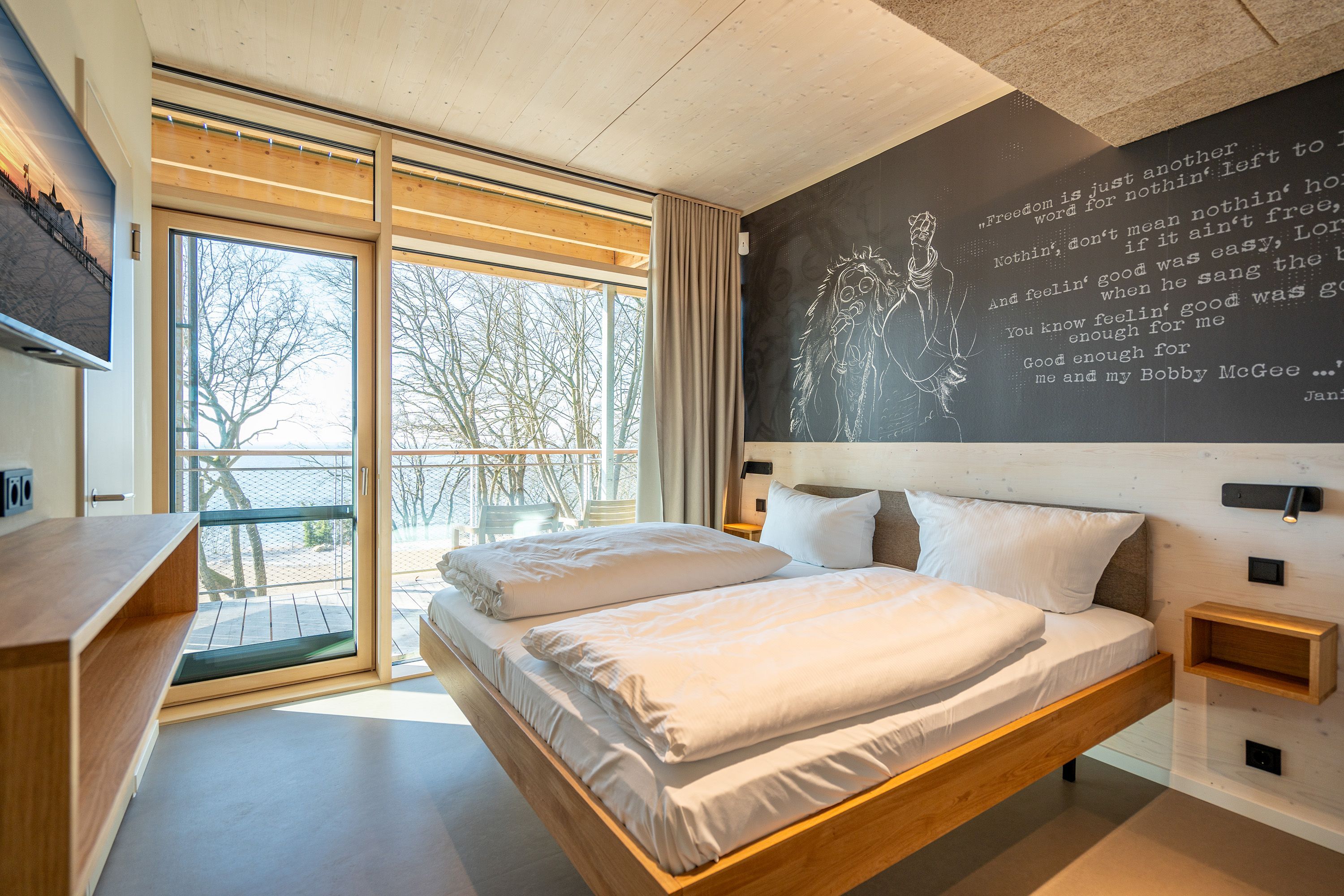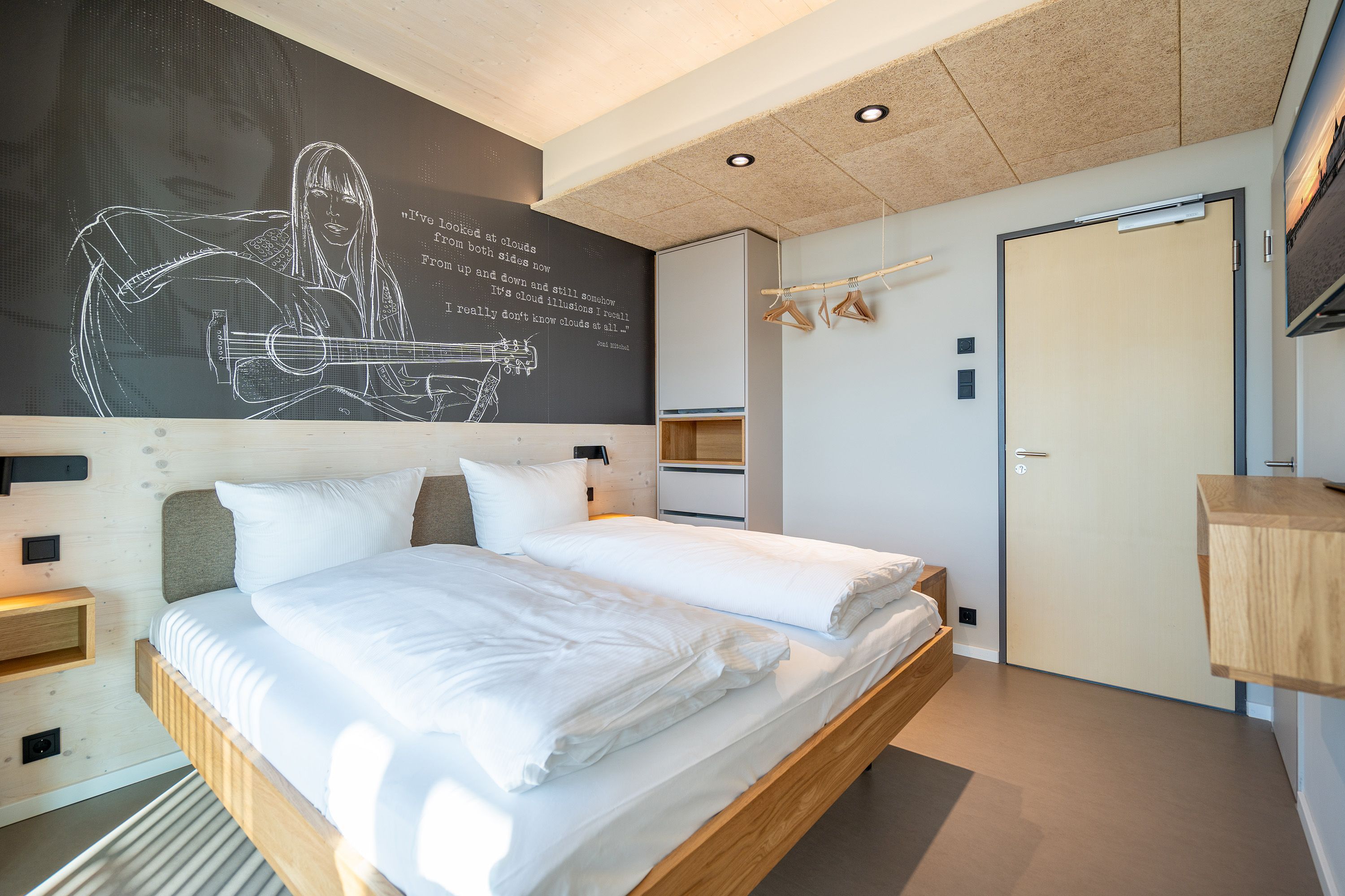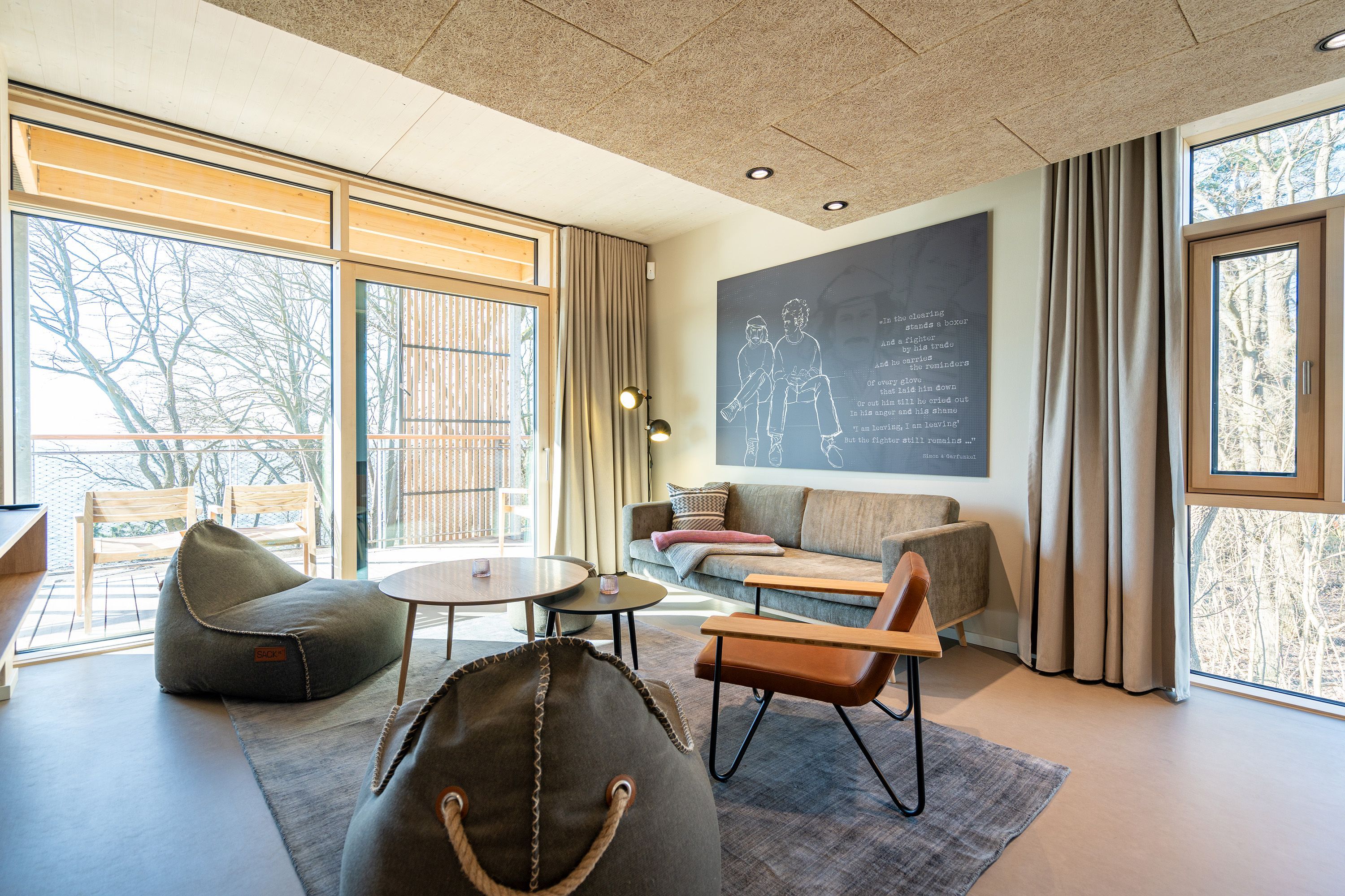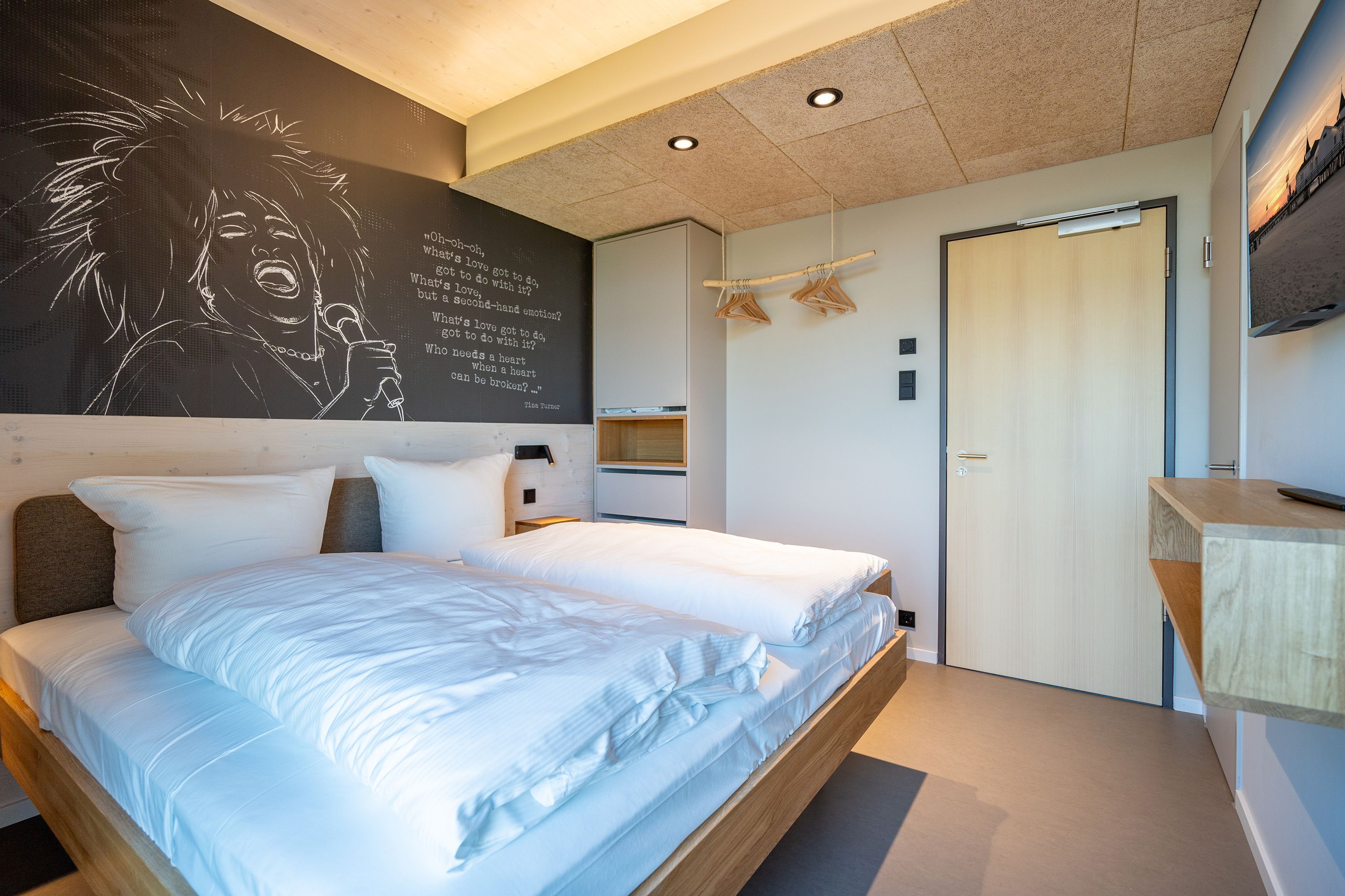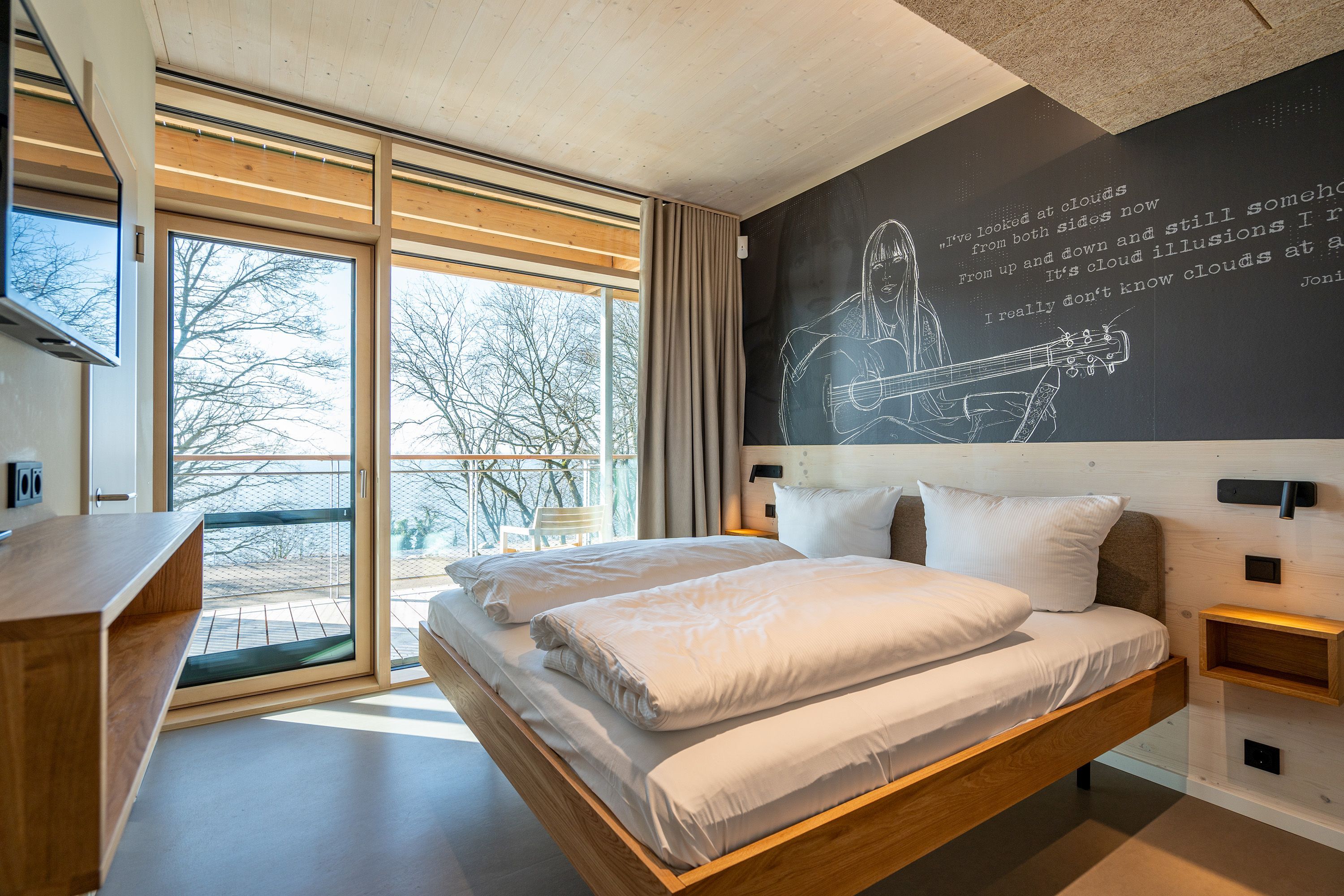 In dem 300 Quadratmeter großen Seminar- und Gästehaus mit großzügiger Außenanlage können bis zu 16 Personen nebst einem Kleinkind im Kinderreisebett beim Arbeiten oder Feiern, gemeinsam die Zeit genießen. In dieser besonderen Location kommen Bewohner nicht nur runter, sondern auf schöpferische Ideen voller Rhythm and Blues. Denn in der modernen Architektur des Hauses aus Stahl, Beton und Holz stecken jede Menge Reminiszenzen an die großen Künstler des Rockn Roll. Die Liebe zum musikalischen Detail steckt in vielen Kleinigkeiten. Wer mit offenen Augen durchs Haus schlendert, wird garantiert inspiriert. Legen Sie doch eine Platte auf dem Plattenspieler auf und träumen Sie sich in die Klänge großartiger Songs.Ein großer und offener Wohnbereich im Erdgeschoss ist perfekt dafür gemacht, Produktivität und Freizeit miteinander zu verbinden. Auch für große Familientreffen ist die Küstenkiste bestens geeignet. Im loftähnlichen Gemeinschaftsbereich lässt es sich wunderbar feiern, essen, gemeinsam kochen oder einfach nur zusammensitzen und das Leben genießen. Der Wohnbereich mit Ledersofas, Kamin und Klavier, der Essbereich mit riesiger Holztafel, die sich auch bestens zum Brainstormen, Diskutieren und Pläneschmieden eignet, und die supermoderne Küche sorgen für ein Gefühl von Freiheit und Nähe, von Unbeschwertheit und dem Fokus auf das Wesentliche. Auch im Innenhof und auf der Sonnenterrasse mit Grill laden zwei große Tafeln zum gemeinsamen Essen und Entspannen ein. Die Küche ist mit allem ausgestattet, was man sich für das Kochen in Gesellschaft nur wünschen kann. Sie verfügt über einen 6-Platten-Induktionsherd, einen Backofen sowie eine Mikrowelle-Backofen-Kombination. Auch mit 16 Mitbewohnern ist der Abwasch kein Problem. Denn den übernehmen zwei große Geschirrspüler. In den Schränken und in einem Serviceraum mit Waschmaschine, Trockner und zusätzlichem Kühl- und Gefrierschrank findet sich viel Stauraum für alle brauchbaren Utensilien, die dank Beschriftung, leicht zu finden sind. Die Gäste wohnen in acht Studios zwei im Erdgeschoss, sechs im 1. Obergeschoss mit Doppelbett, Kleiderschrank, Flat-TV, eigenem Tageslicht-Duschbad und separatem WC. Drei der Schlafzimmer verfügen über einen Zugang zum Balkon mit Haffblick. Aber auch alle anderen Zimmer haben aus dem Bett einen Blick ins Grüne. Jedes Zimmer ist einem anderen Musikgenie gewidmet. Entscheiden Sie selbst, ob Sie sich und ihre Träume lieber von Janis Joplin, Joni Mitchel oder von Bob Dylan beflügeln lassen wollen. Im Obergeschoss gibt es einen weiteren Loungebereich mit Flat-TV und Zugang zum Balkon. In einem Fitnessraum kann man sich an den hochwertigen Geräten der Firma Nohrd wunderbar auspowern, um anschließend in der Sauna oder im Whirlpool, die Energieakkus wieder aufzuladen. Doch das eigentliche Highlight des Anwesens ist der weitläufige Garten mit Beachvolleyballfeld auf echtem Strandsand, lauschigen Eckchen zum Sitzen, einem Hot Tub und einer großen Chillterrasse mit Haffblick. Parkplätze und eine Wallbox für Elektroautos (gegen Gebühr) gibt es vor dem Haus. Tierliebe Gäste können gegen Aufpreis bis zu zwei ihrer Lieblinge mitbringen.