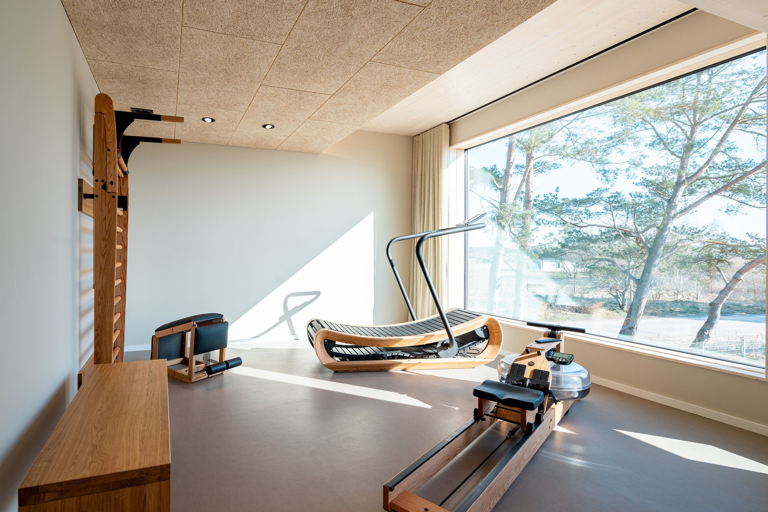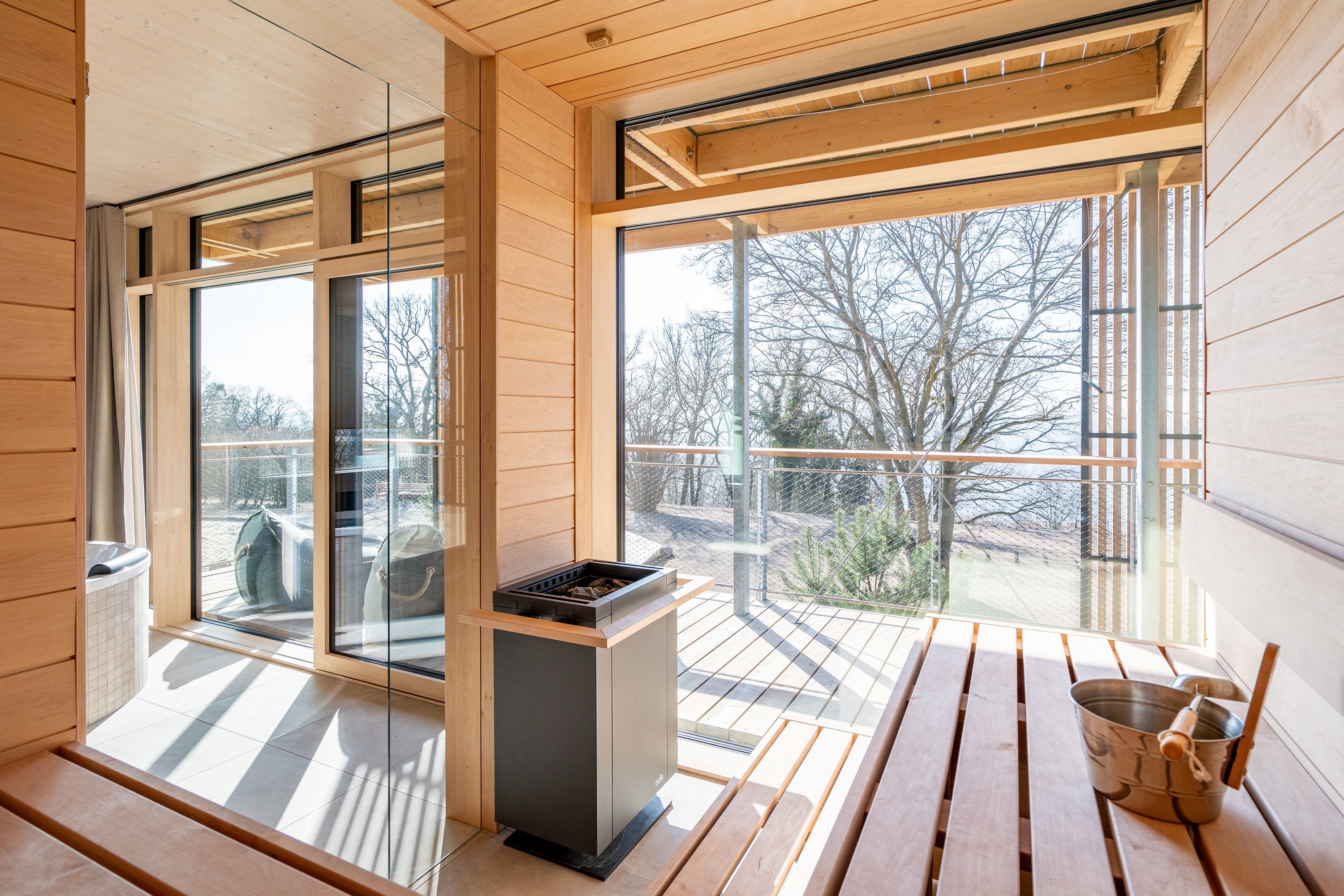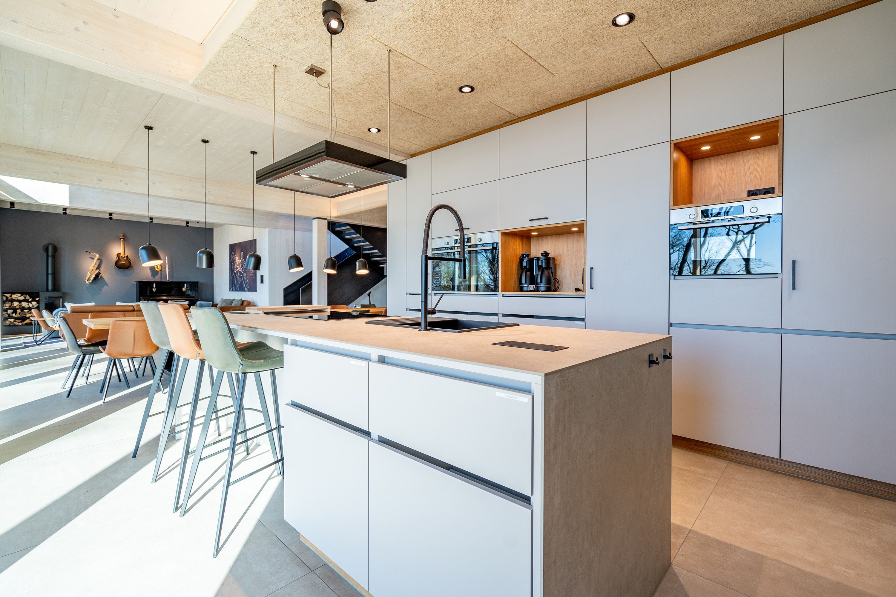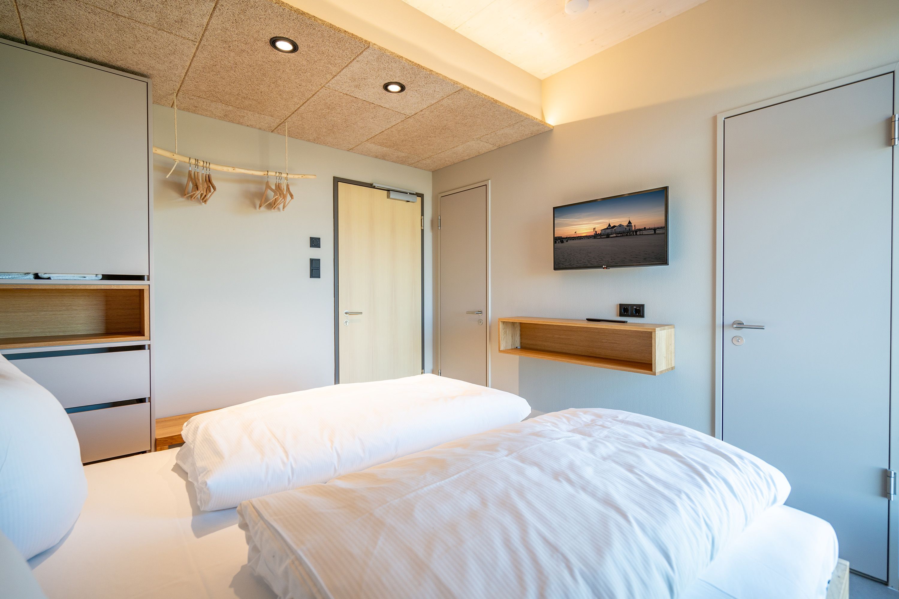 In dem 300 Quadratmeter großen Seminar- und Gästehaus mit großzügiger Außenanlage können bis zu 16 Personen nebst einem Kleinkind im Kinderreisebett beim Arbeiten oder Feiern, gemeinsam die Zeit genießen. In dieser besonderen Location kommen Bewohner nicht nur runter, sondern auf schöpferische Ideen voller Rhythm and Blues. Denn in der modernen Architektur des Hauses aus Stahl, Beton und Holz stecken jede Menge Reminiszenzen an die großen Künstler des Rockn Roll. Die Liebe zum musikalischen Detail steckt in vielen Kleinigkeiten. Wer mit offenen Augen durchs Haus schlendert, wird garantiert inspiriert. Legen Sie doch eine Platte auf dem Plattenspieler auf und träumen Sie sich in die Klänge großartiger Songs.Ein großer und offener Wohnbereich im Erdgeschoss ist perfekt dafür gemacht, Produktivität und Freizeit miteinander zu verbinden. Auch für große Familientreffen ist die Küstenkiste bestens geeignet. Im loftähnlichen Gemeinschaftsbereich lässt es sich wunderbar feiern, essen, gemeinsam kochen oder einfach nur zusammensitzen und das Leben genießen. Der Wohnbereich mit Ledersofas, Kamin und Klavier, der Essbereich mit riesiger Holztafel, die sich auch bestens zum Brainstormen, Diskutieren und Pläneschmieden eignet, und die supermoderne Küche sorgen für ein Gefühl von Freiheit und Nähe, von Unbeschwertheit und dem Fokus auf das Wesentliche. Auch im Innenhof und auf der Sonnenterrasse mit Grill laden zwei große Tafeln zum gemeinsamen Essen und Entspannen ein. Die Küche ist mit allem ausgestattet, was man sich für das Kochen in Gesellschaft nur wünschen kann. Sie verfügt über einen 6-Platten-Induktionsherd, einen Backofen sowie eine Mikrowelle-Backofen-Kombination. Auch mit 16 Mitbewohnern ist der Abwasch kein Problem. Denn den übernehmen zwei große Geschirrspüler. In den Schränken und in einem Serviceraum mit Waschmaschine, Trockner und zusätzlichem Kühl- und Gefrierschrank findet sich viel Stauraum für alle brauchbaren Utensilien, die dank Beschriftung, leicht zu finden sind. Die Gäste wohnen in acht Studios zwei im Erdgeschoss, sechs im 1. Obergeschoss mit Doppelbett, Kleiderschrank, Flat-TV, eigenem Tageslicht-Duschbad und separatem WC. Drei der Schlafzimmer verfügen über einen Zugang zum Balkon mit Haffblick. Aber auch alle anderen Zimmer haben aus dem Bett einen Blick ins Grüne. Jedes Zimmer ist einem anderen Musikgenie gewidmet. Entscheiden Sie selbst, ob Sie sich und ihre Träume lieber von Janis Joplin, Joni Mitchel oder von Bob Dylan beflügeln lassen wollen. Im Obergeschoss gibt es einen weiteren Loungebereich mit Flat-TV und Zugang zum Balkon. In einem Fitnessraum kann man sich an den hochwertigen Geräten der Firma Nohrd wunderbar auspowern, um anschließend in der Sauna oder im Whirlpool, die Energieakkus wieder aufzuladen. Doch das eigentliche Highlight des Anwesens ist der weitläufige Garten mit Beachvolleyballfeld auf echtem Strandsand, lauschigen Eckchen zum Sitzen, einem Hot Tub und einer großen Chillterrasse mit Haffblick. Parkplätze und eine Wallbox für Elektroautos (gegen Gebühr) gibt es vor dem Haus. Tierliebe Gäste können gegen Aufpreis bis zu zwei ihrer Lieblinge mitbringen.