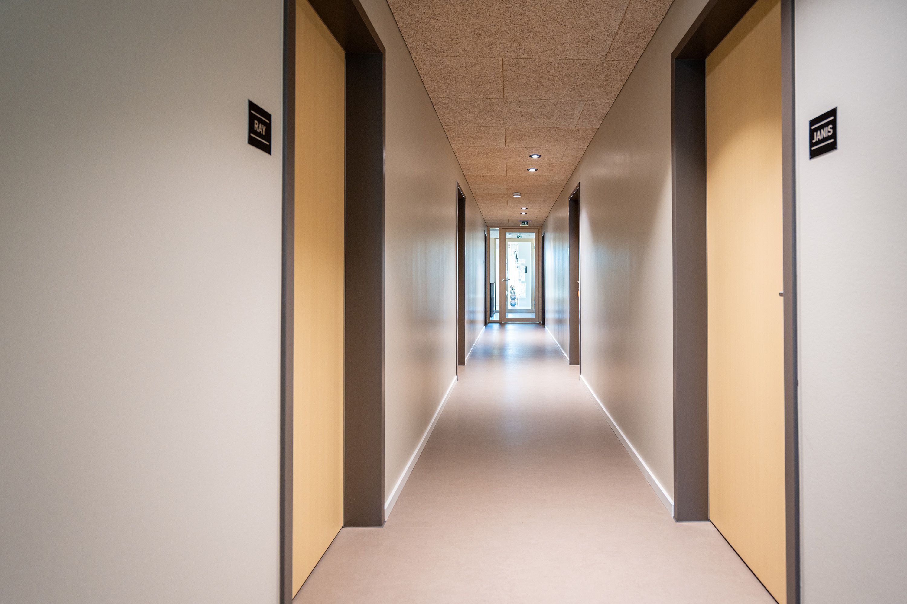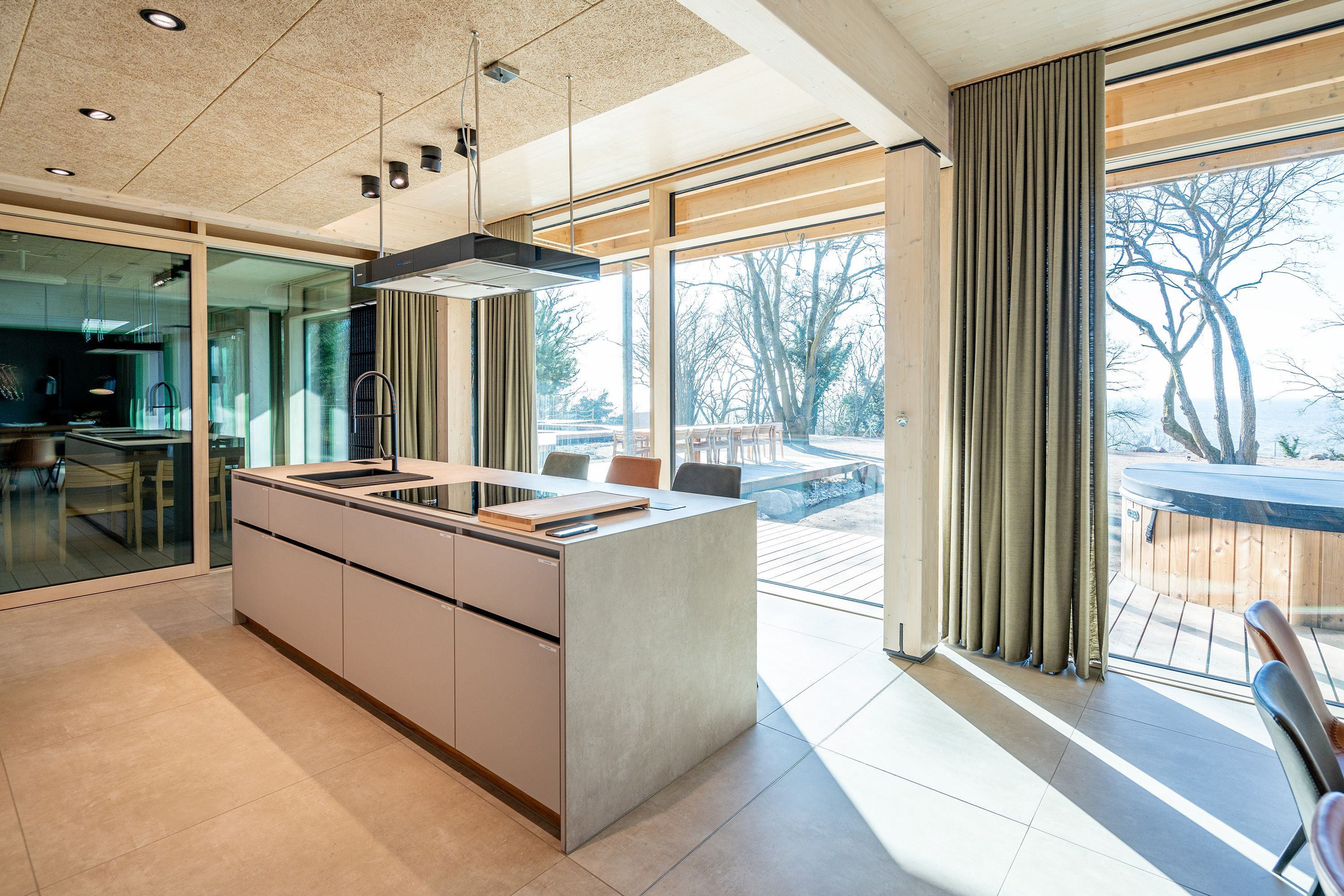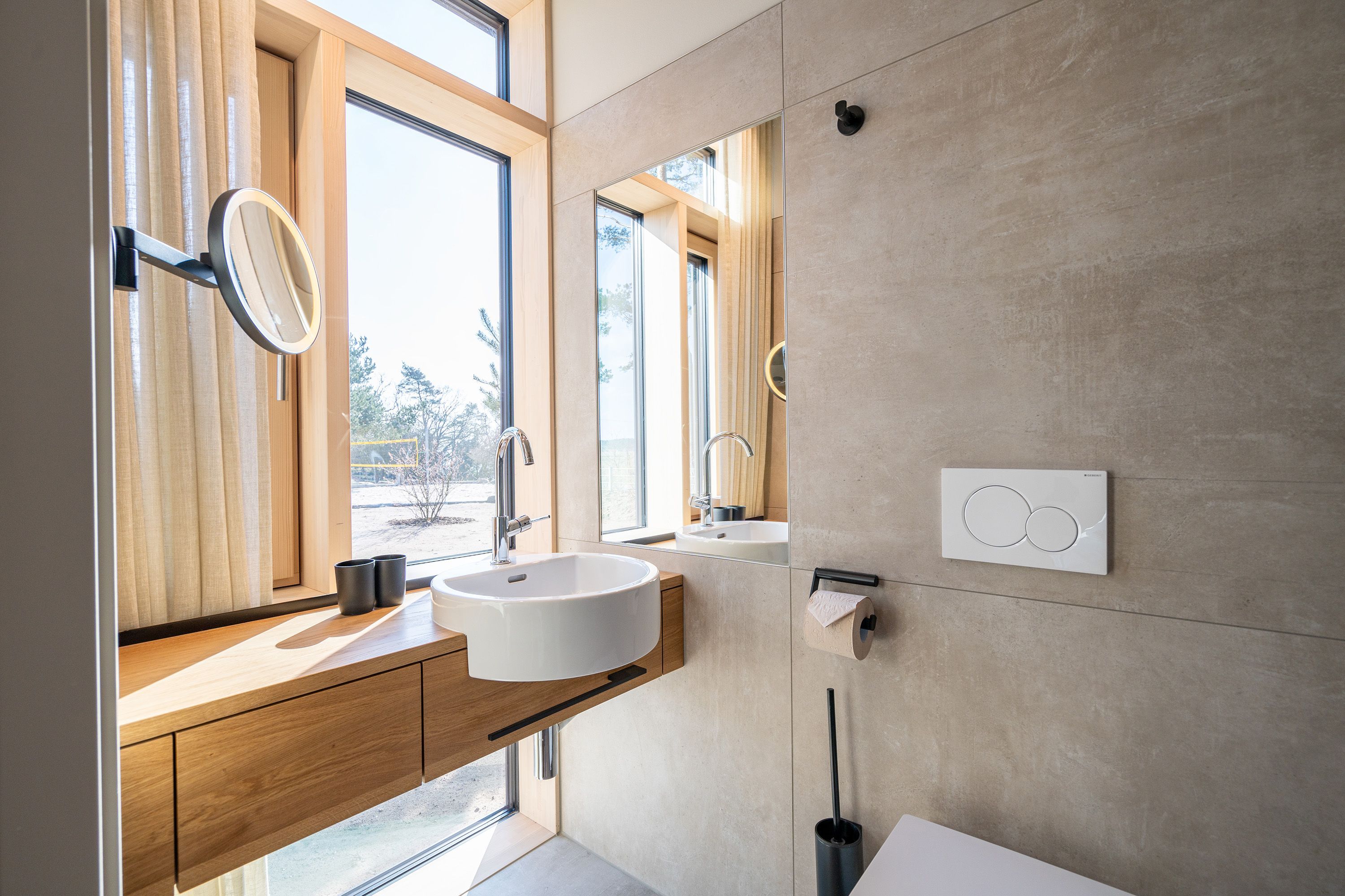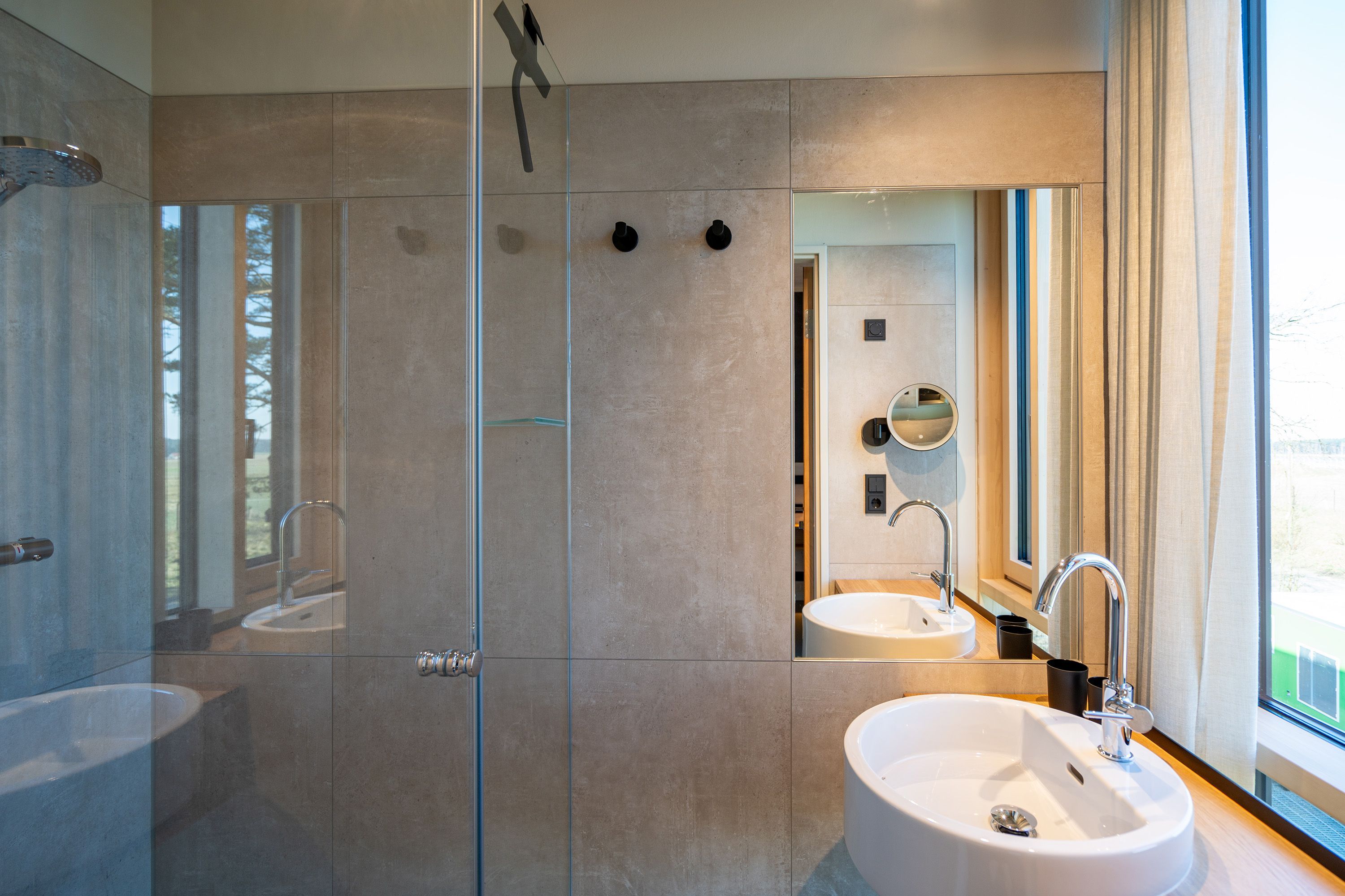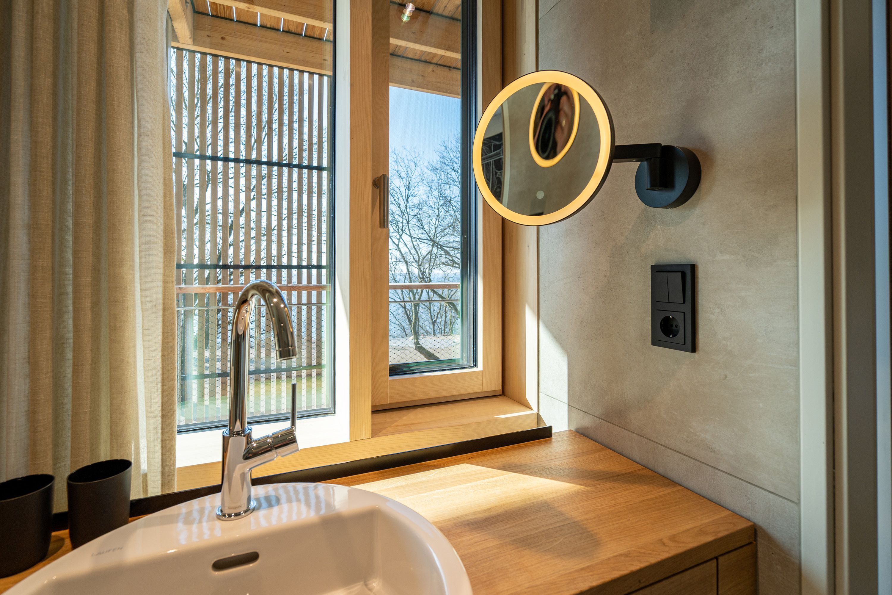 In dem 300 Quadratmeter großen Seminar- und Gästehaus mit großzügiger Außenanlage können bis zu 16 Personen nebst einem Kleinkind im Kinderreisebett beim Arbeiten oder Feiern, gemeinsam die Zeit genießen. In dieser besonderen Location kommen Bewohner nicht nur runter, sondern auf schöpferische Ideen voller Rhythm and Blues. Denn in der modernen Architektur des Hauses aus Stahl, Beton und Holz stecken jede Menge Reminiszenzen an die großen Künstler des Rockn Roll. Die Liebe zum musikalischen Detail steckt in vielen Kleinigkeiten. Wer mit offenen Augen durchs Haus schlendert, wird garantiert inspiriert. Legen Sie doch eine Platte auf dem Plattenspieler auf und träumen Sie sich in die Klänge großartiger Songs.Ein großer und offener Wohnbereich im Erdgeschoss ist perfekt dafür gemacht, Produktivität und Freizeit miteinander zu verbinden. Auch für große Familientreffen ist die Küstenkiste bestens geeignet. Im loftähnlichen Gemeinschaftsbereich lässt es sich wunderbar feiern, essen, gemeinsam kochen oder einfach nur zusammensitzen und das Leben genießen. Der Wohnbereich mit Ledersofas, Kamin und Klavier, der Essbereich mit riesiger Holztafel, die sich auch bestens zum Brainstormen, Diskutieren und Pläneschmieden eignet, und die supermoderne Küche sorgen für ein Gefühl von Freiheit und Nähe, von Unbeschwertheit und dem Fokus auf das Wesentliche. Auch im Innenhof und auf der Sonnenterrasse mit Grill laden zwei große Tafeln zum gemeinsamen Essen und Entspannen ein. Die Küche ist mit allem ausgestattet, was man sich für das Kochen in Gesellschaft nur wünschen kann. Sie verfügt über einen 6-Platten-Induktionsherd, einen Backofen sowie eine Mikrowelle-Backofen-Kombination. Auch mit 16 Mitbewohnern ist der Abwasch kein Problem. Denn den übernehmen zwei große Geschirrspüler. In den Schränken und in einem Serviceraum mit Waschmaschine, Trockner und zusätzlichem Kühl- und Gefrierschrank findet sich viel Stauraum für alle brauchbaren Utensilien, die dank Beschriftung, leicht zu finden sind. Die Gäste wohnen in acht Studios zwei im Erdgeschoss, sechs im 1. Obergeschoss mit Doppelbett, Kleiderschrank, Flat-TV, eigenem Tageslicht-Duschbad und separatem WC. Drei der Schlafzimmer verfügen über einen Zugang zum Balkon mit Haffblick. Aber auch alle anderen Zimmer haben aus dem Bett einen Blick ins Grüne. Jedes Zimmer ist einem anderen Musikgenie gewidmet. Entscheiden Sie selbst, ob Sie sich und ihre Träume lieber von Janis Joplin, Joni Mitchel oder von Bob Dylan beflügeln lassen wollen. Im Obergeschoss gibt es einen weiteren Loungebereich mit Flat-TV und Zugang zum Balkon. In einem Fitnessraum kann man sich an den hochwertigen Geräten der Firma Nohrd wunderbar auspowern, um anschließend in der Sauna oder im Whirlpool, die Energieakkus wieder aufzuladen. Doch das eigentliche Highlight des Anwesens ist der weitläufige Garten mit Beachvolleyballfeld auf echtem Strandsand, lauschigen Eckchen zum Sitzen, einem Hot Tub und einer großen Chillterrasse mit Haffblick. Parkplätze und eine Wallbox für Elektroautos (gegen Gebühr) gibt es vor dem Haus. Tierliebe Gäste können gegen Aufpreis bis zu zwei ihrer Lieblinge mitbringen.