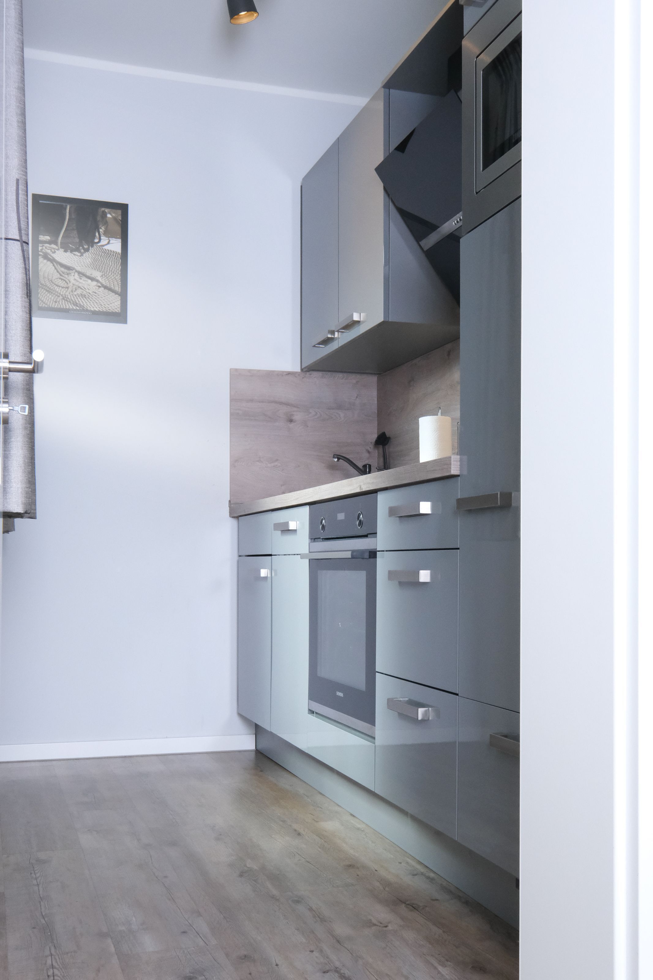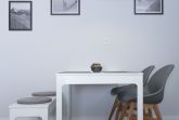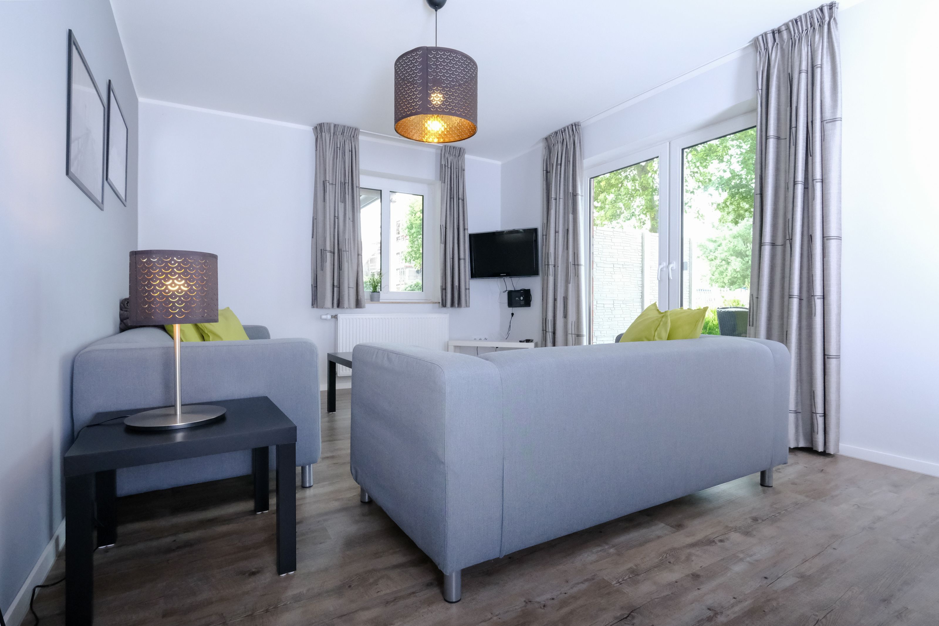 Das Herzstück der Wohnung bildet der helle und großzügige Wohn- und Essbereich mit insgesamt 23m². Gemütliche Sessel und eine Couch laden zum Entspannen ein. Für die passende Unterhaltung sorgen Gesellschaftsspiele, ein Flachbild-TV mit Smart-TV, DVD-Player und Hi-Fi-System. Der Essbereich ist für 4 Personen ausgelegt und grenzt direkt an die separate Küche der Wohnung. Die hochwertige Küche ist voll ausgestattet und verfügt über eine Spülmaschine, einen Backofen mit Cerankochfeld, eine Mikrowelle, einen großen Kühlschrank mit separatem Gefrierfach, eine Kaffeemaschine (wahlweise Pad oder Filter), einen Wasserkocher, Toaster u.v.m. Durch das große Fenster haben Sie auch beim Kochen direkten Blick auf die möblierte Terrasse mit Sonnenschirm und können es als Durchreiche für ein gemütliches Frühstück im Freien nutzen.