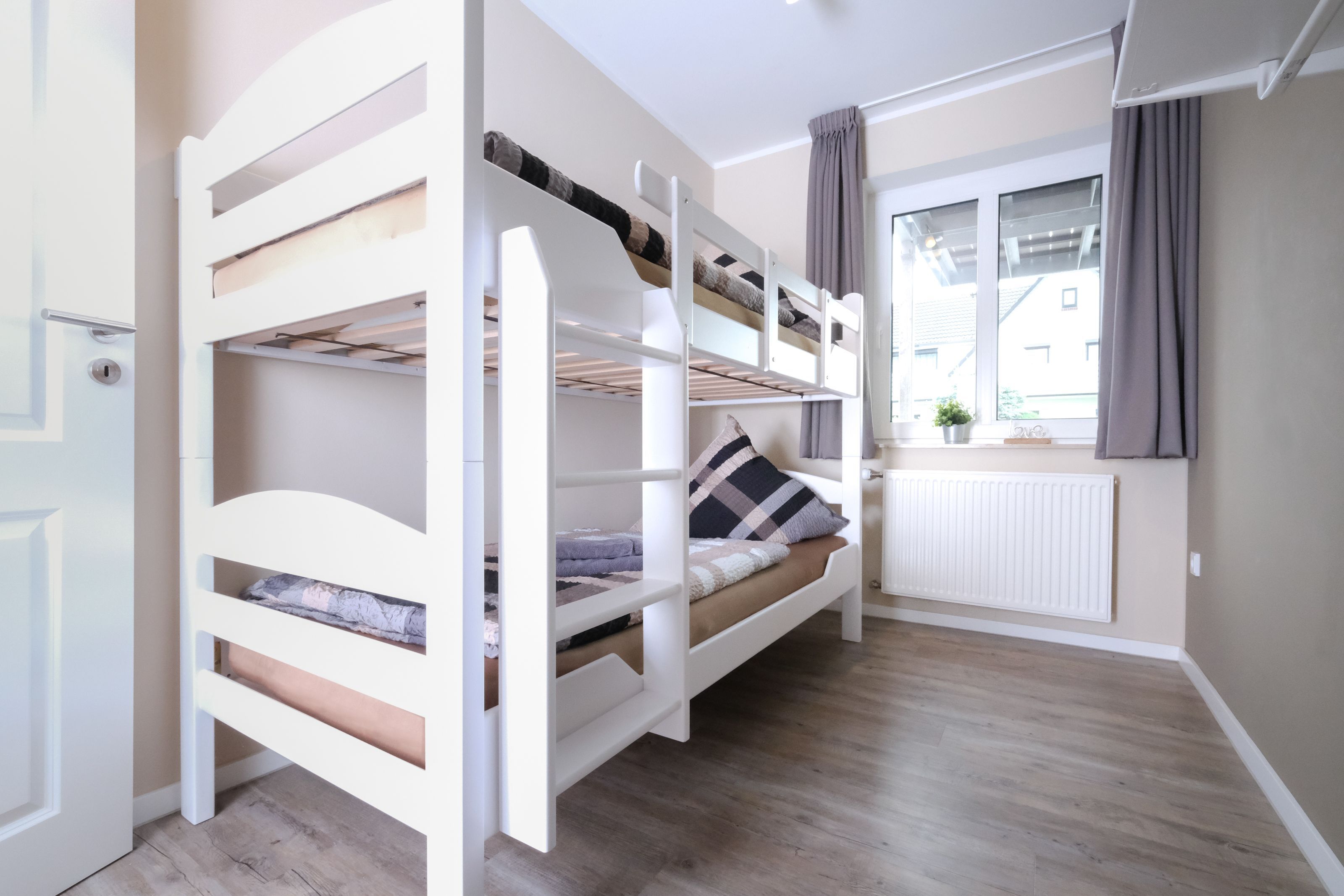Das Friesenhuus Nr. 1 ist die größte Ferienwohnung des Hauses und verfügt über einen geräumigen Flur mit Garderobe und gewährt Zutritt zum modernen Badezimmer mit WC, Waschtisch, bodengleicher Dusche und Fön. Das Elternschlafzimmer ist großzügig geschnitten und bietet Ihnen einen direkten Blick auf den Deich. Es ist mit einem Doppelbett (180x200) mit offenem Fußende ausgestattet. Im zweiten Schlafzimmer steht Ihnen ein Etagenbett (je 90x200) zur Verfügung. Beide Schlafzimmer verfügen über einen Wandschrank und Verdunklungsmöglichkeiten.