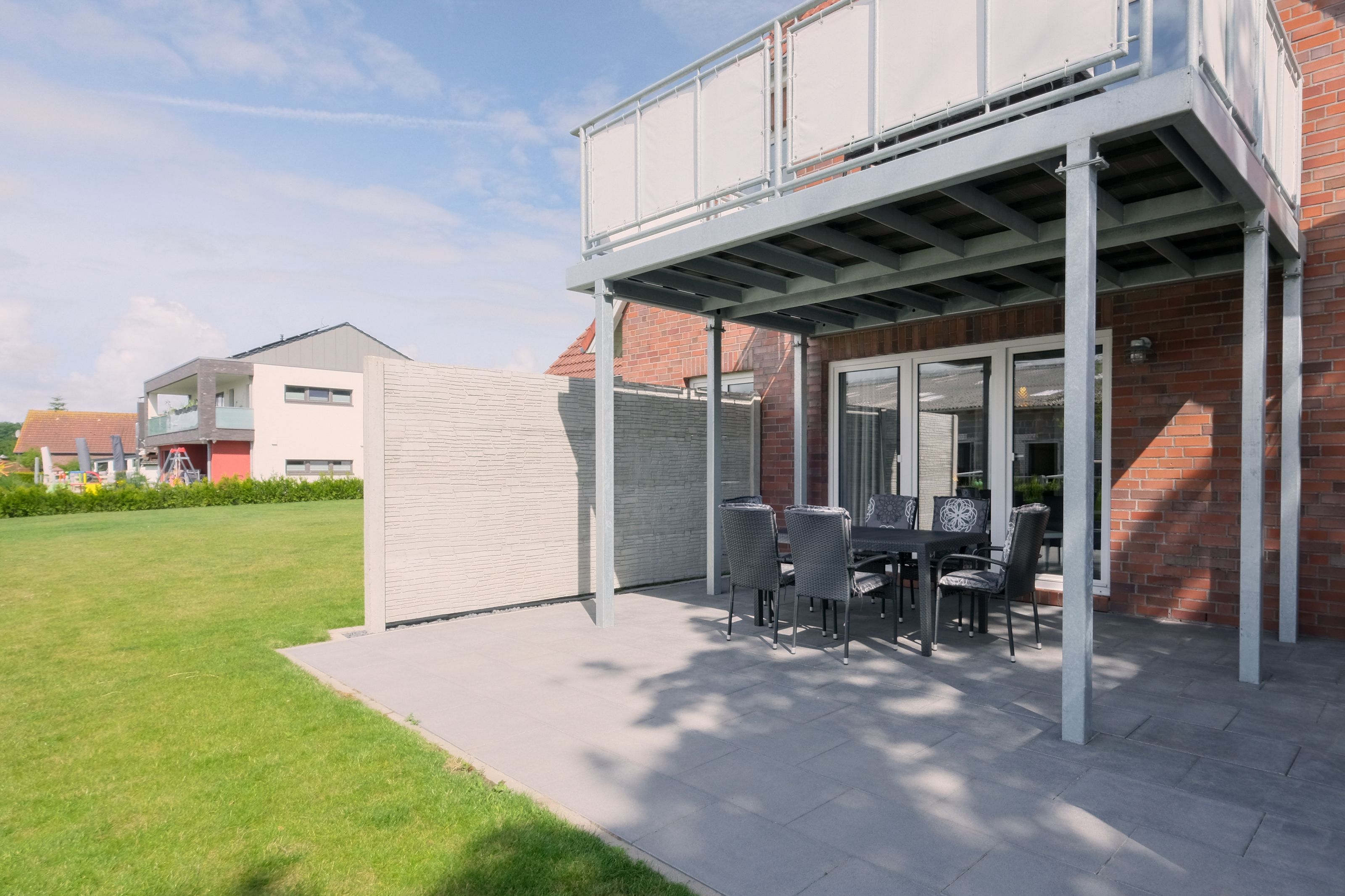 Die große möblierte Süd-Terrasse lädt zum Sonnenbaden ein und bietet durch den darüberliegenden Balkon, einen Sonnenschirm und den seitlichen Sichtschutz ausreichend Privatsphäre.