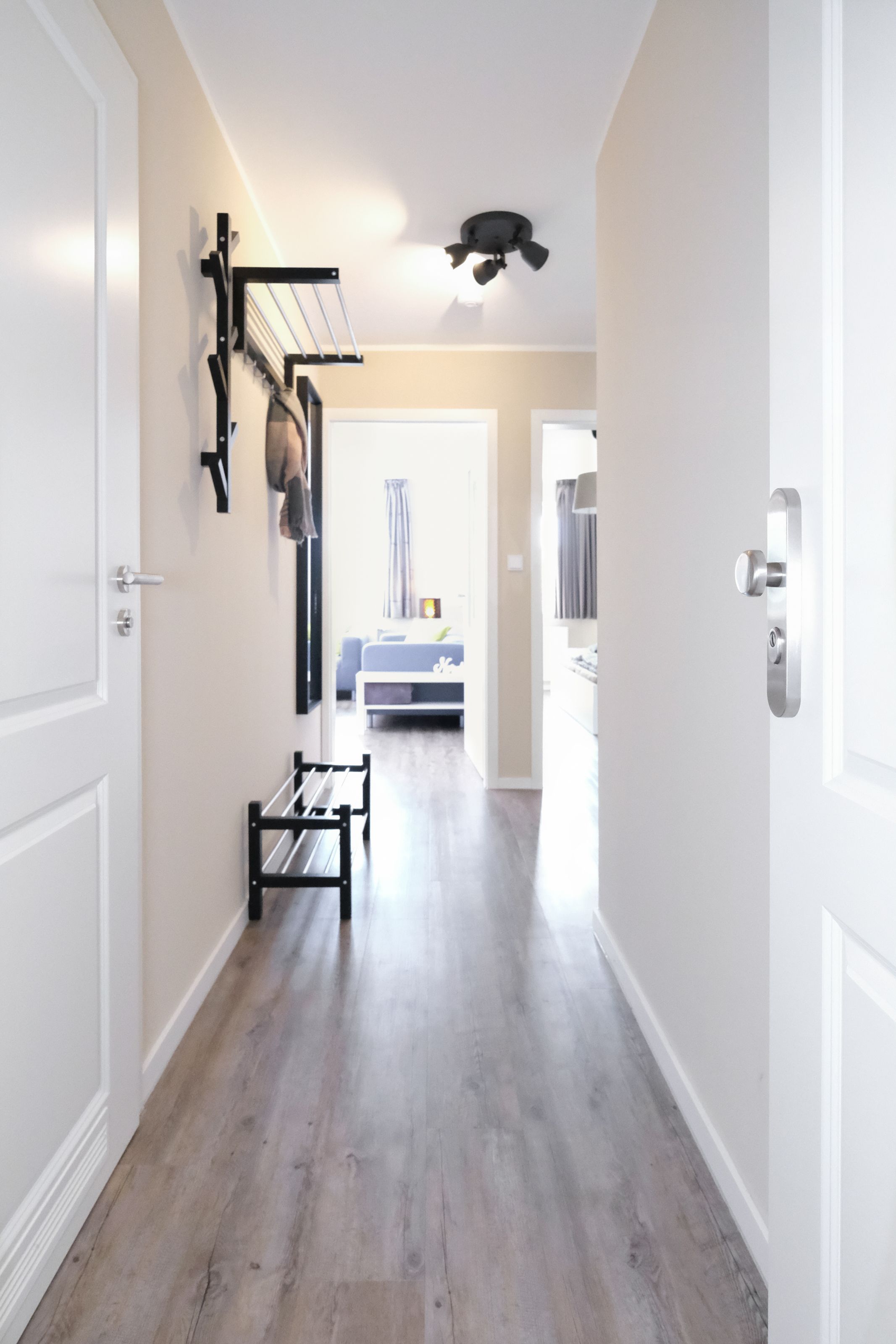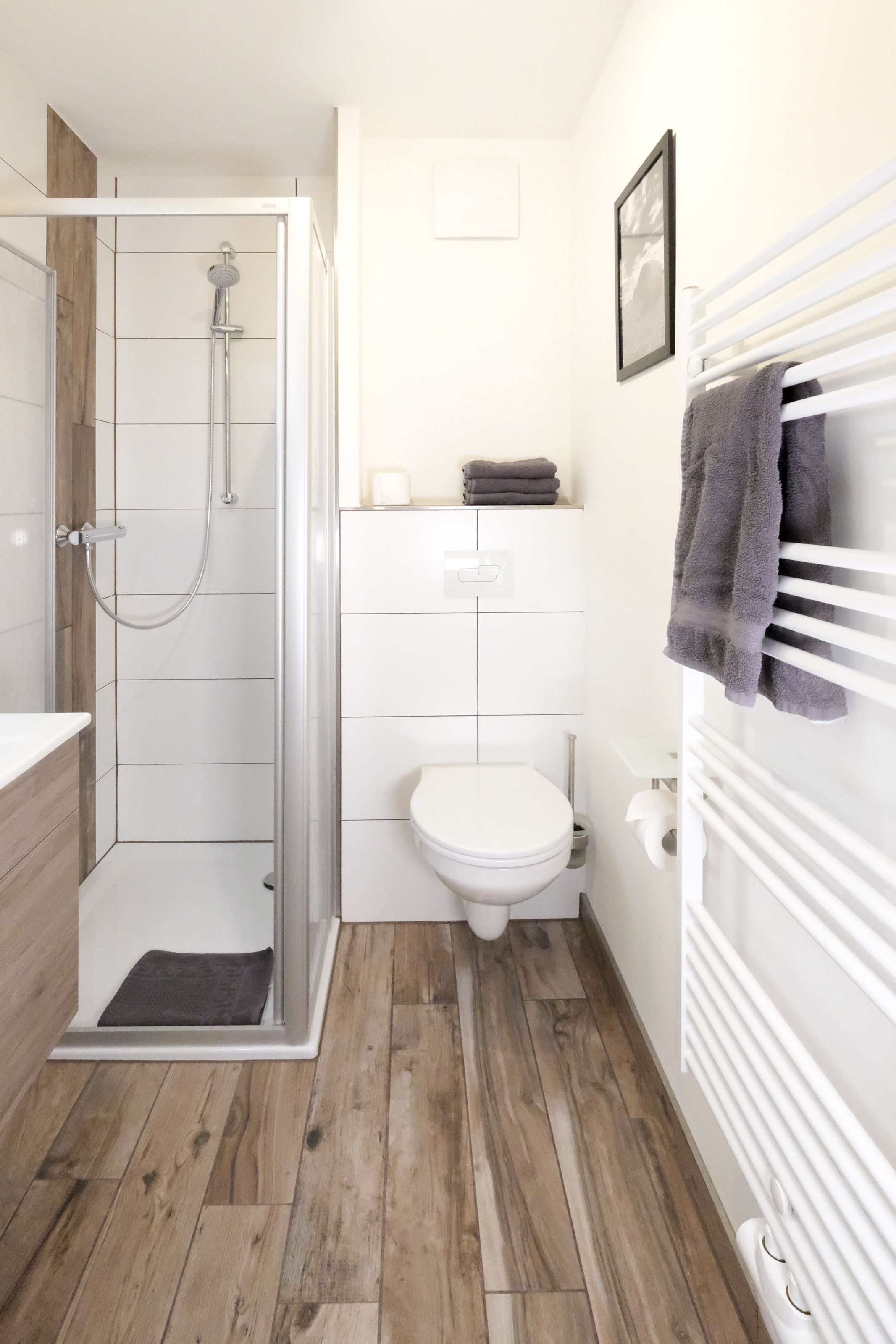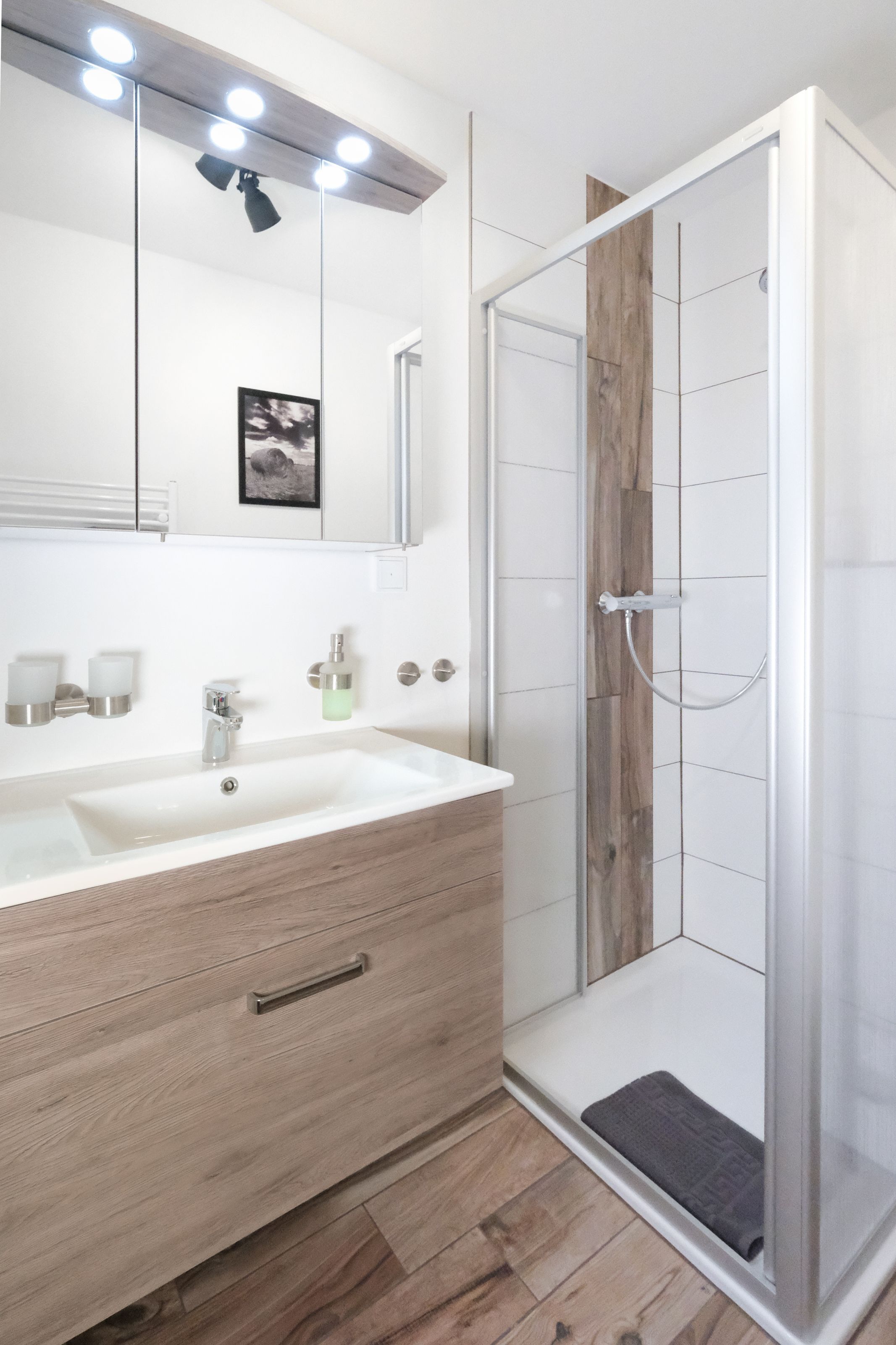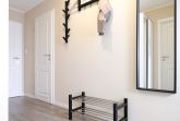 Im großzügig geschnittenen Flur steht für Sie ein geräumiger Spiegelschrank und eine Garderobe bereit. Von hier aus gelangen Sie in das moderne Badezimmer mit WC, Waschtisch, bodengleicher Dusche und Fön.