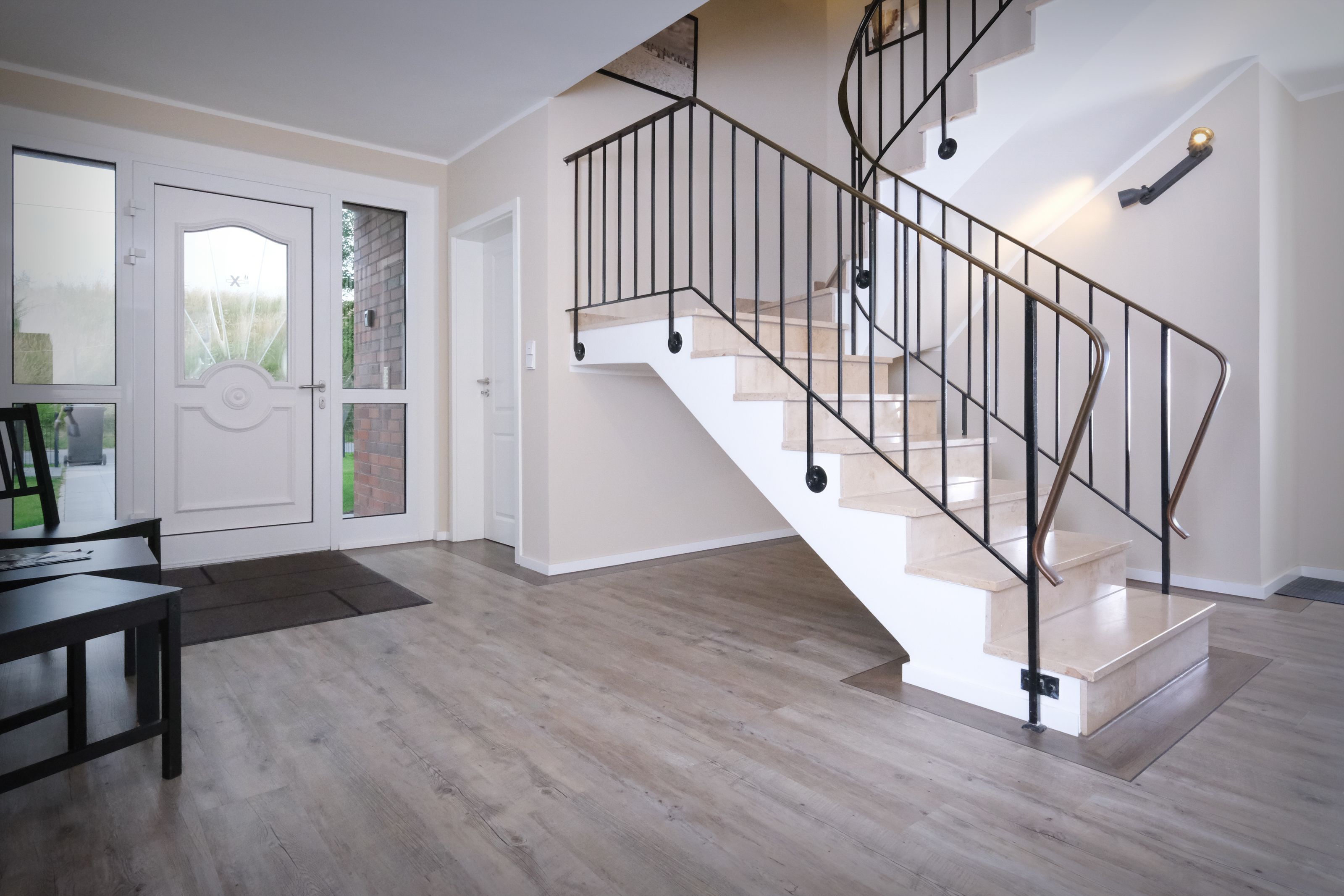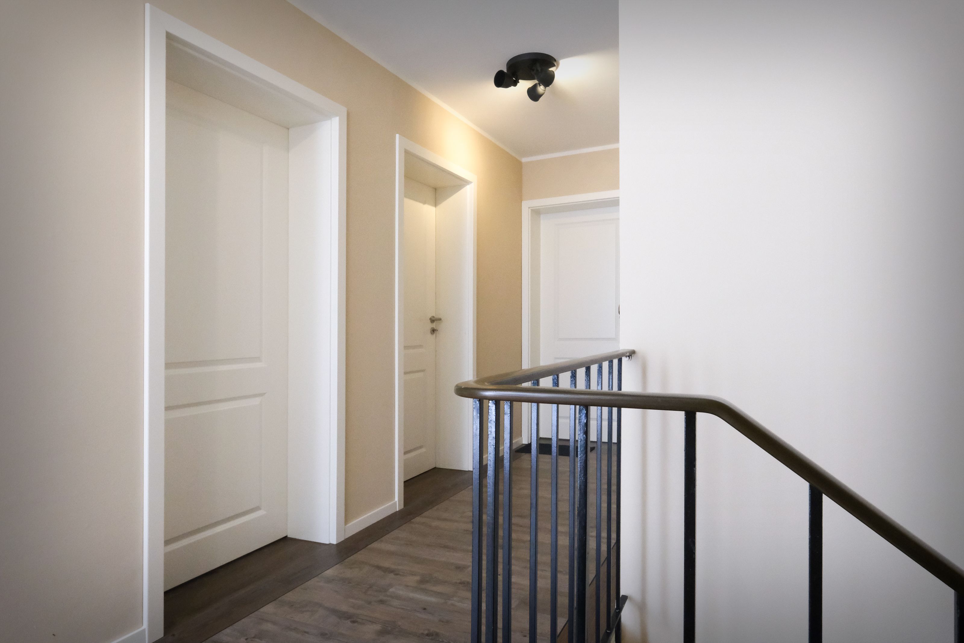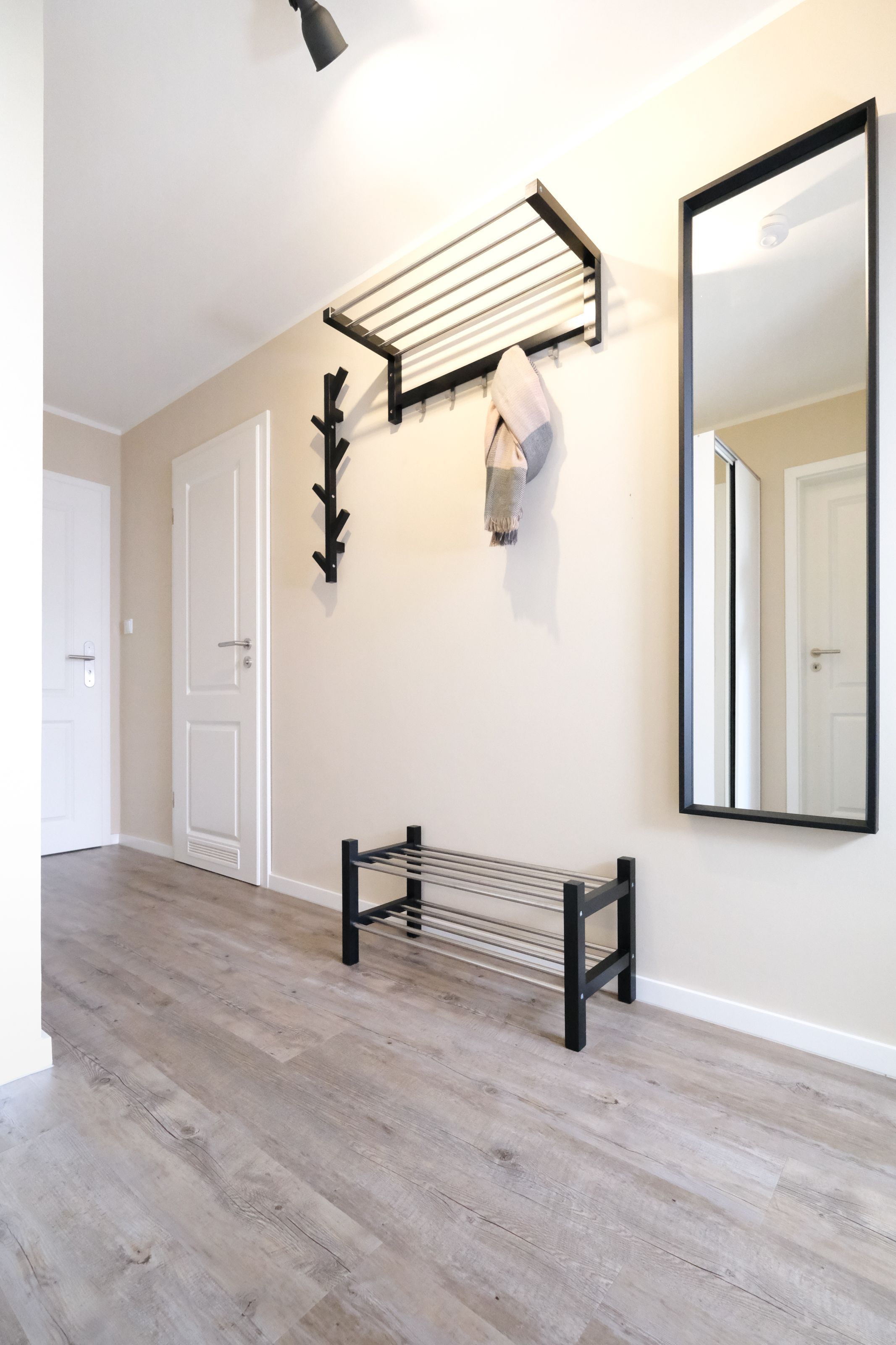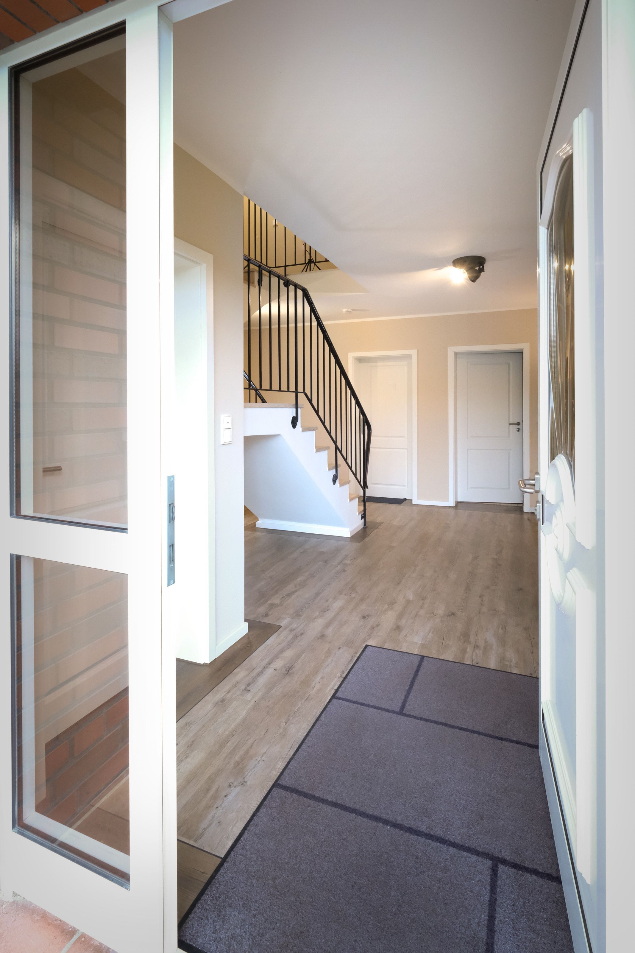 Im großzügig geschnittenen Flur steht für Sie ein geräumiger Spiegelschrank und eine Garderobe bereit. Von hier aus gelangen Sie in das moderne Badezimmer mit WC, Waschtisch, bodengleicher Dusche und Fön.