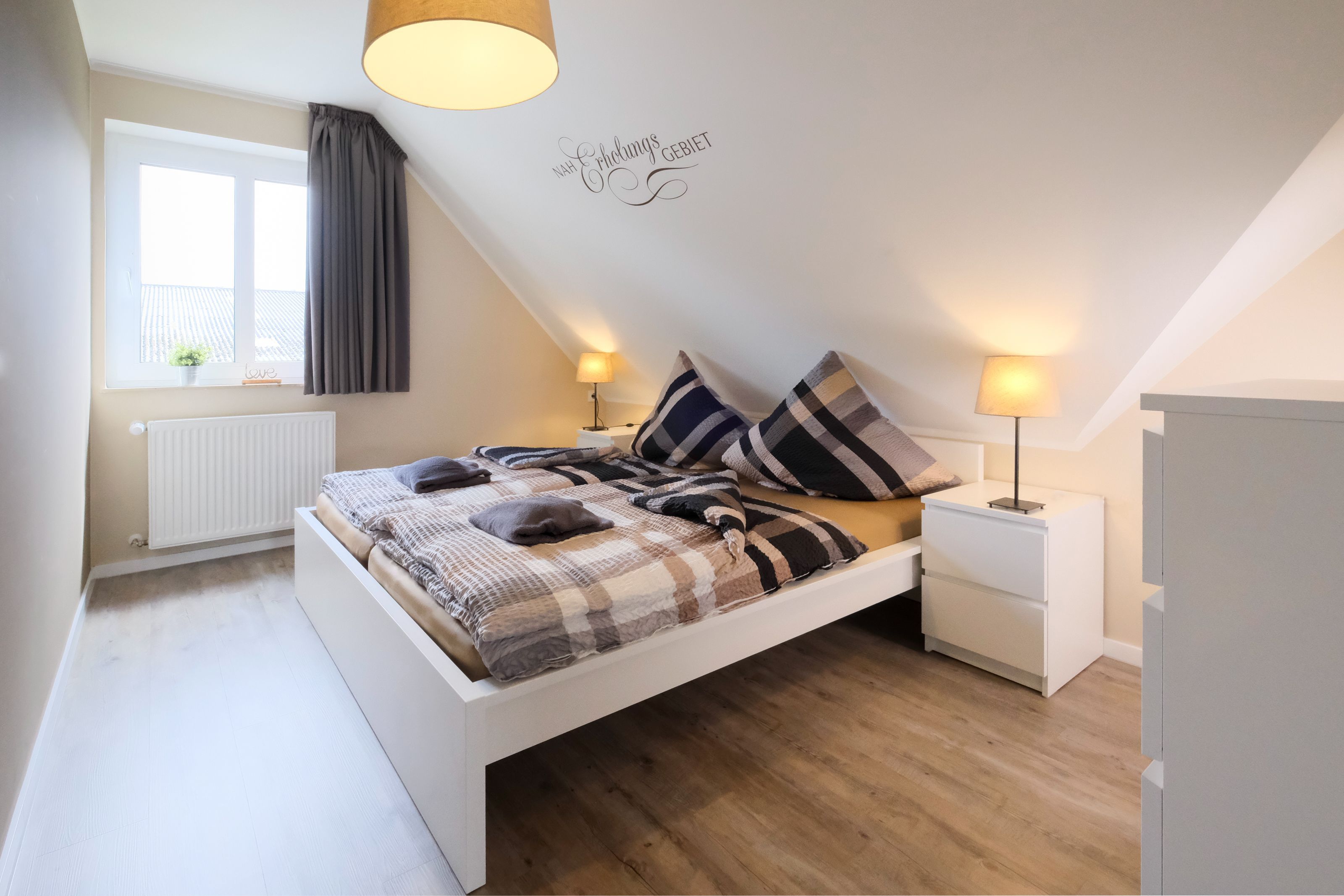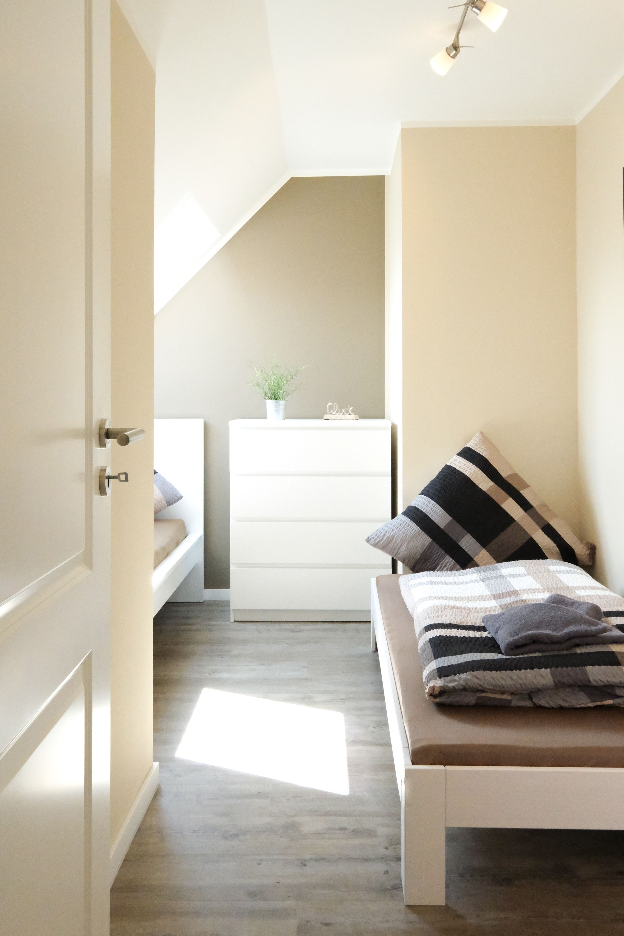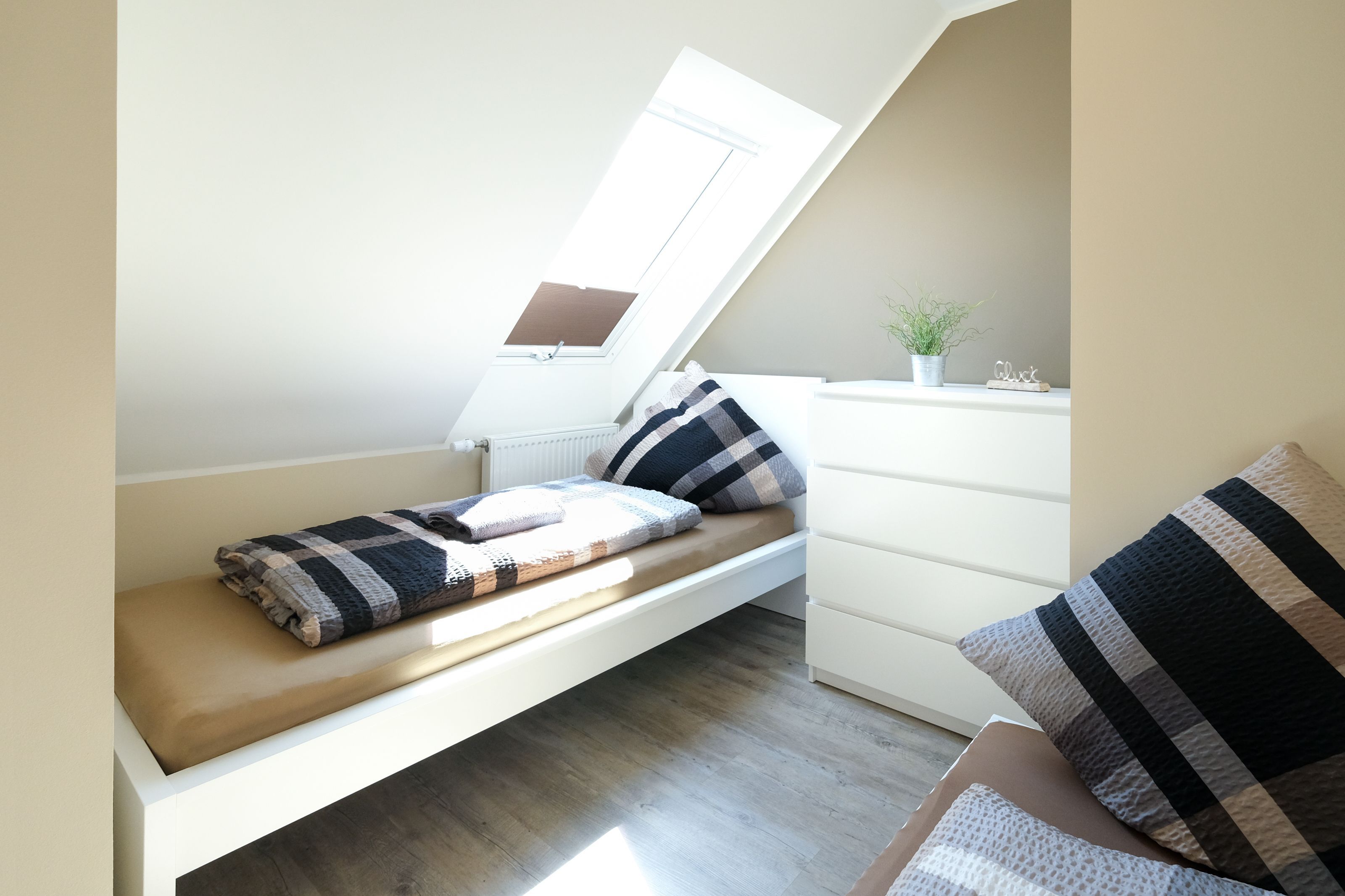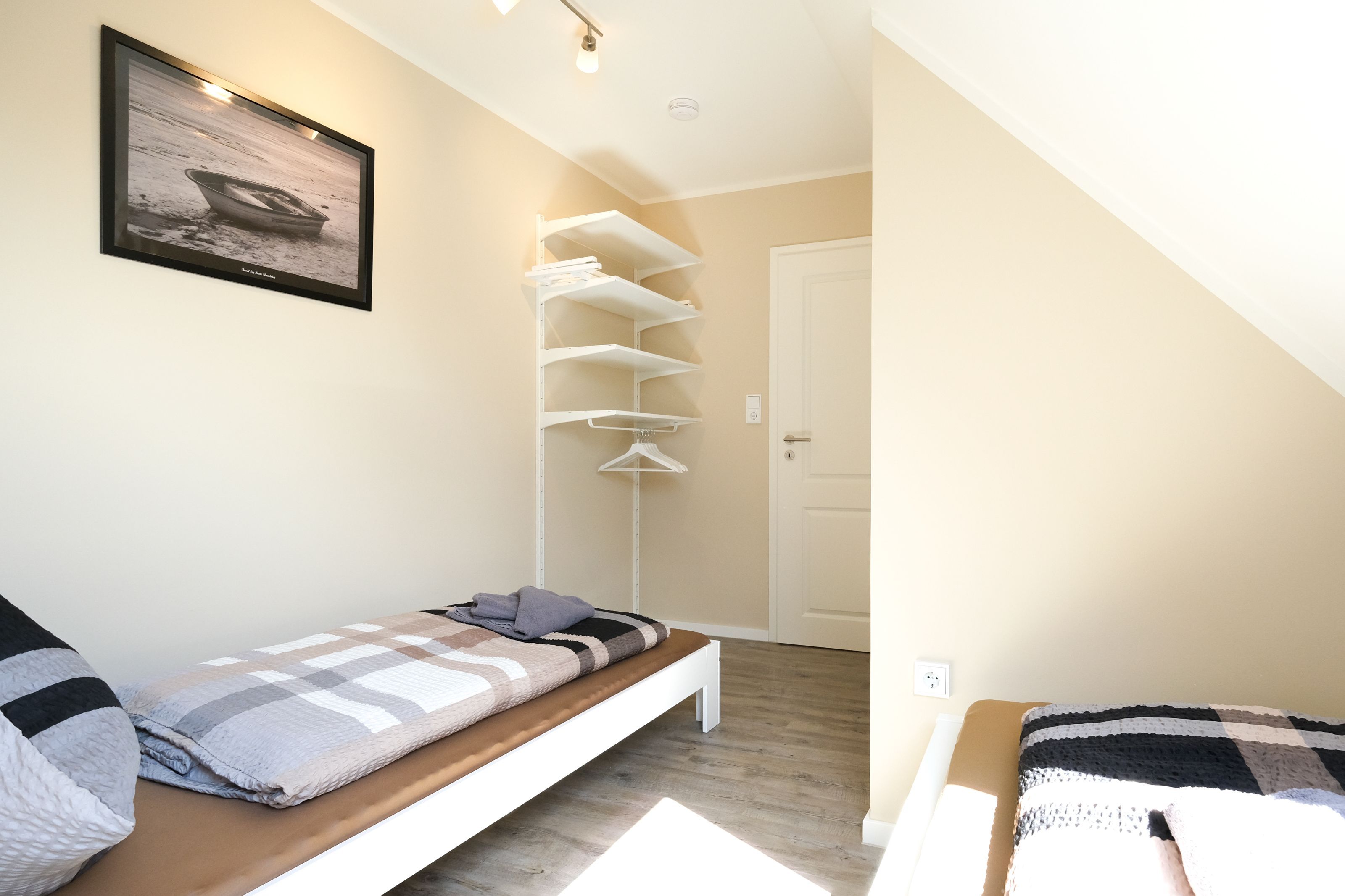Das Elternschlafzimmer ist in Richtung Süden ausgerichtet und bietet ausreichend Platz für ein Beistellbett für Babys. Es ist mit einem Doppelbett (180x200) mit offenem Fußende, Wandschrank und Verdunkelungsmöglichkeit ausgestattet. Im zweiten Schlafzimmer stehen Ihnen zwei getrennte Betten (90x200) und ein Wandschrank zur Verfügung. Ein großes Dachflächenfenster ermöglicht den Blick zu den Sternen und verfügt über ein Verdunklungsrollo.