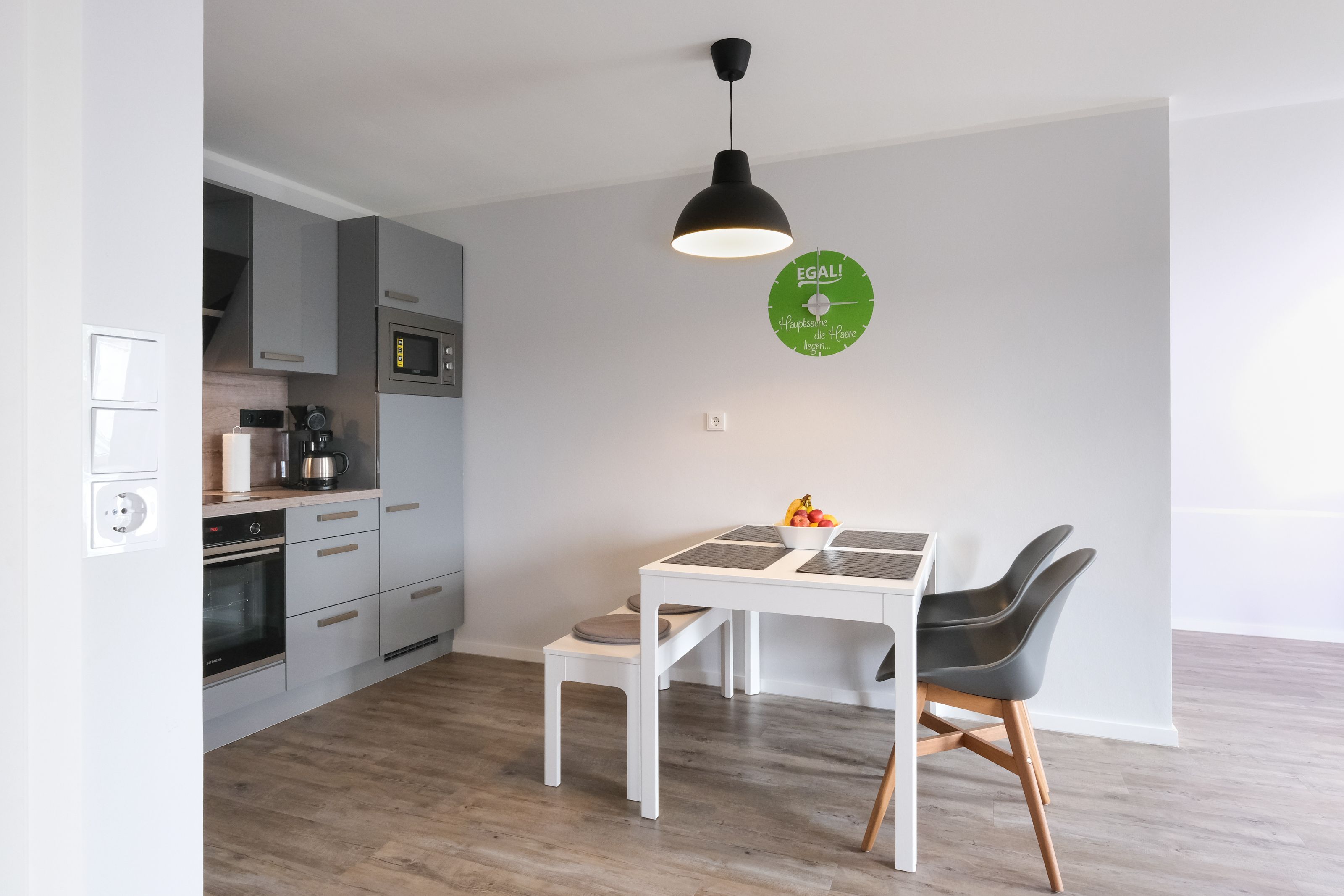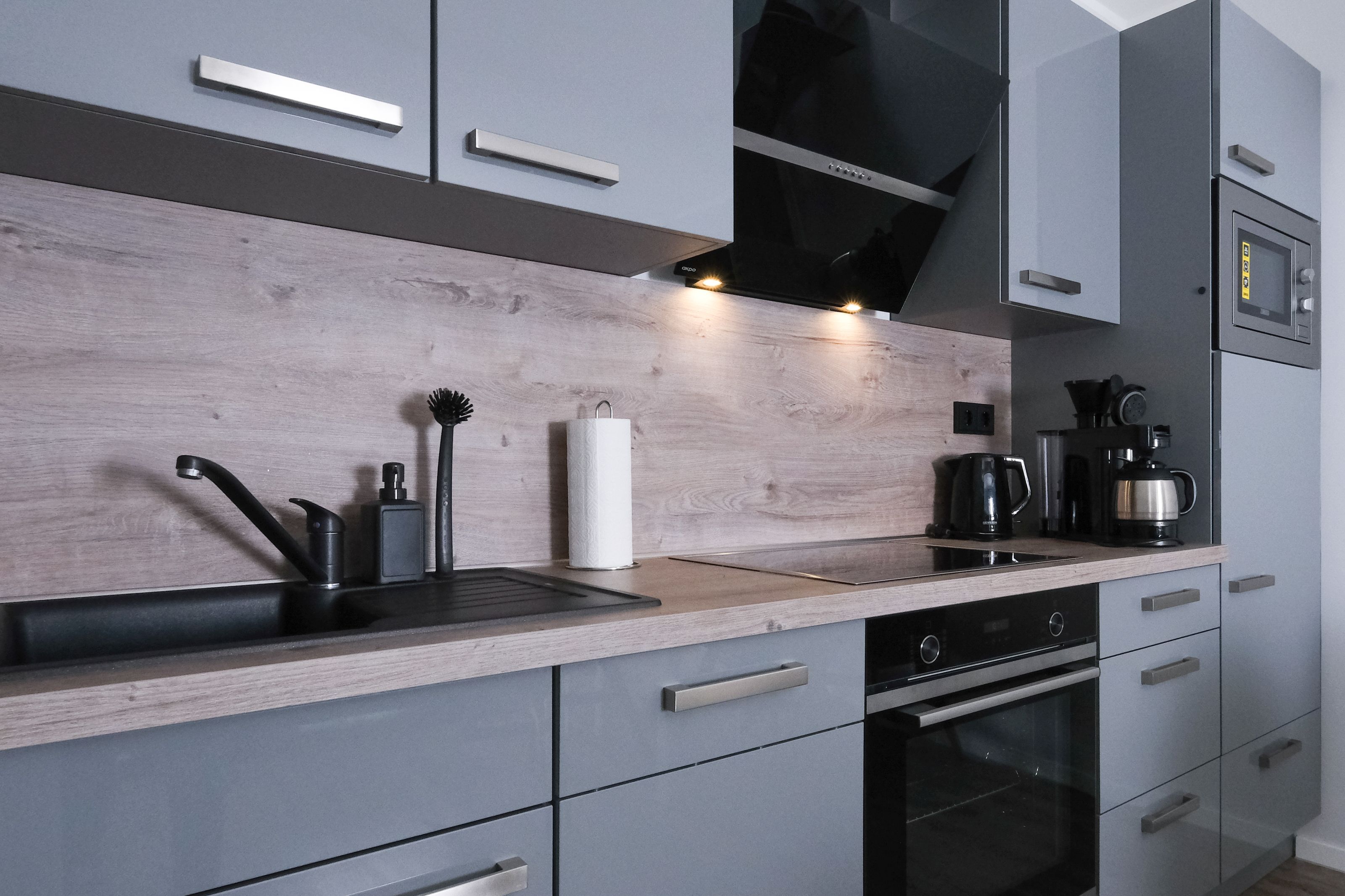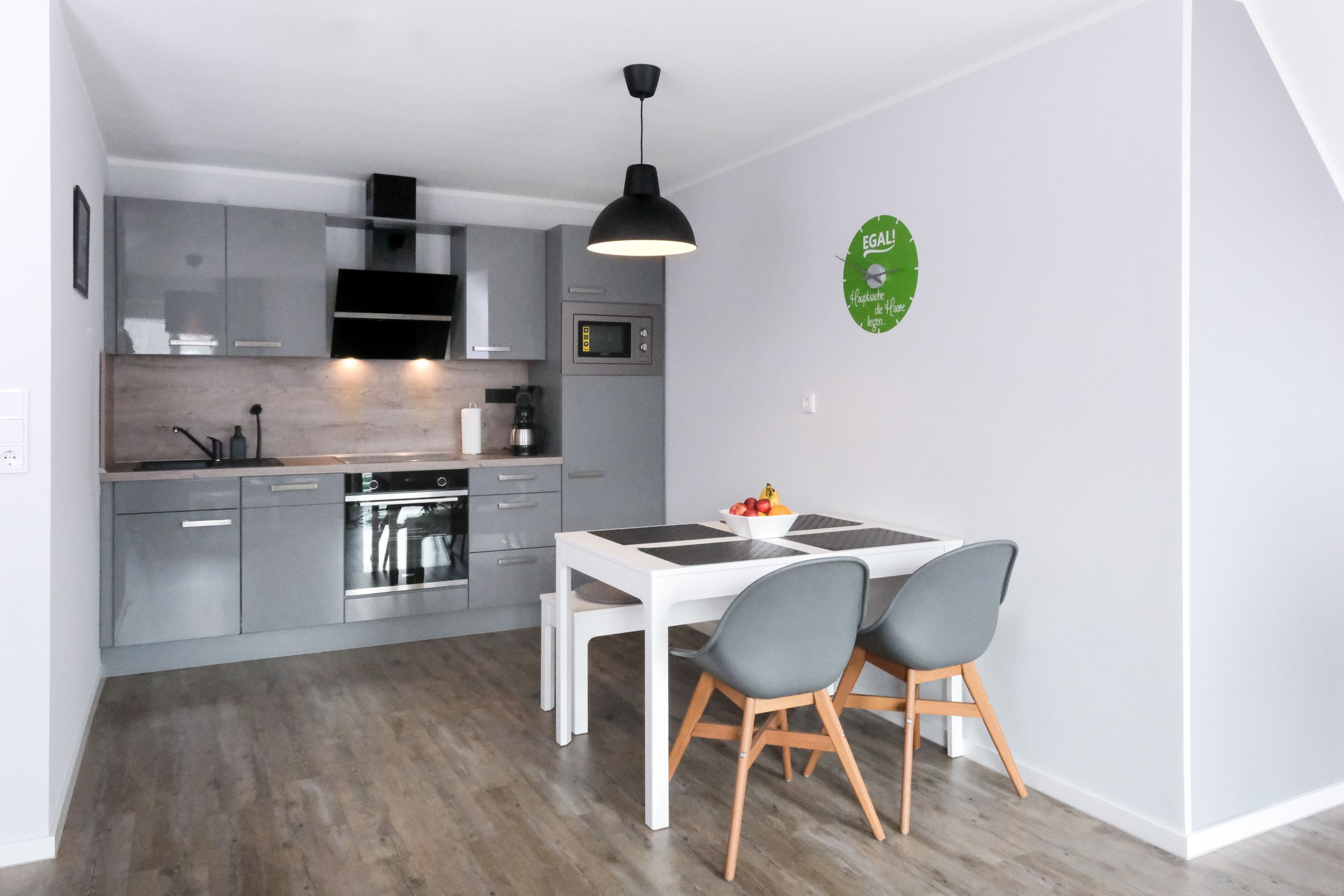 Die Küche verfügt über eine Spülmaschine, einen Backofen mit Cerankochfeld, eine Mikrowelle, einen großen Kühlschrank mit separatem Gefrierfach, eine Kaffeemaschine (wahlweise Pad oder Filter), einen Wasserkocher, Toaster u.v.m.