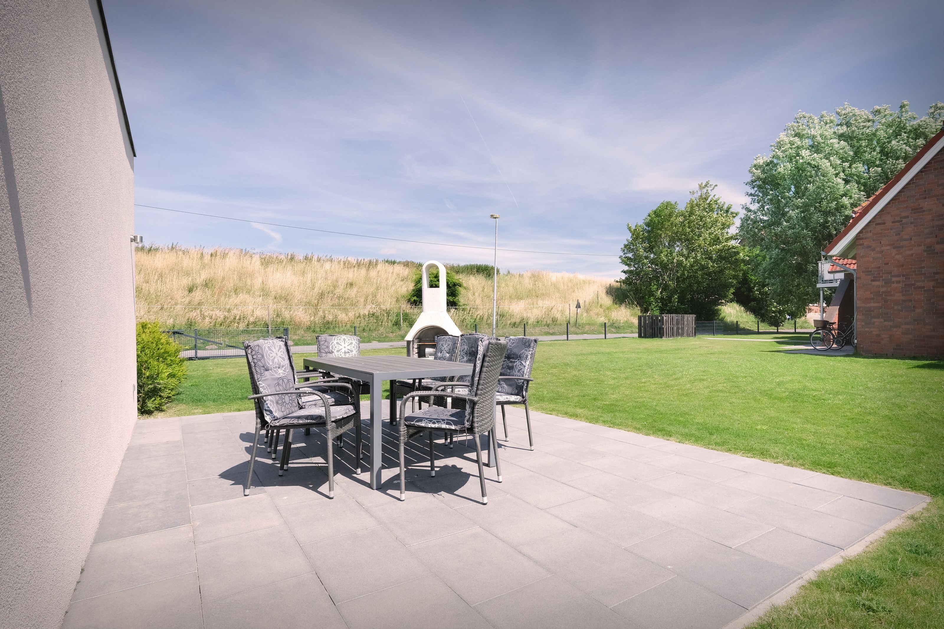 Zusätzlich zum großen möbilierten Süd-Balkon inklusive Sonnenschirm steht Ihnen die große Rasenfläche und die gemeinschaftlich genutzte Gartenterrasse mit Grillmöglichkeit und gemütlicher Möblierung zur freien Verfügung. Vom geräumigen Eingangsbereich des Hauses haben Sie Zugang zum Wasch- und Trockenraum. Auf den fest reservierten PKW-Stellplätzen können Sie Ihren PKW direkt neben dem Haus parken. Ab Frühjahr 2024 bieten wir unseren Gästen zudem eine abschließbare Fahrradgarage inkl. E-Bike-Lademöglichkeit an.