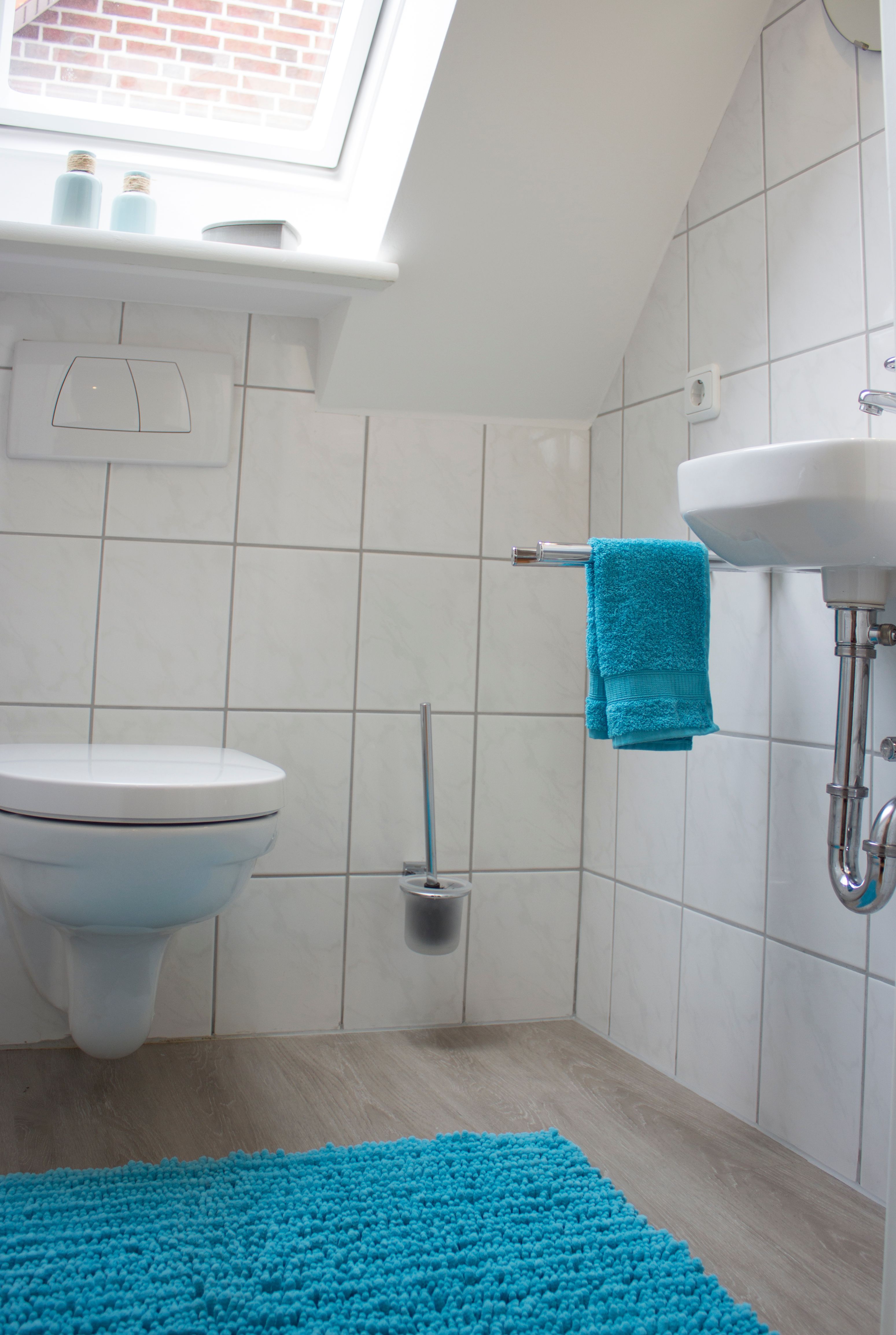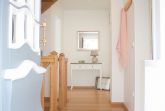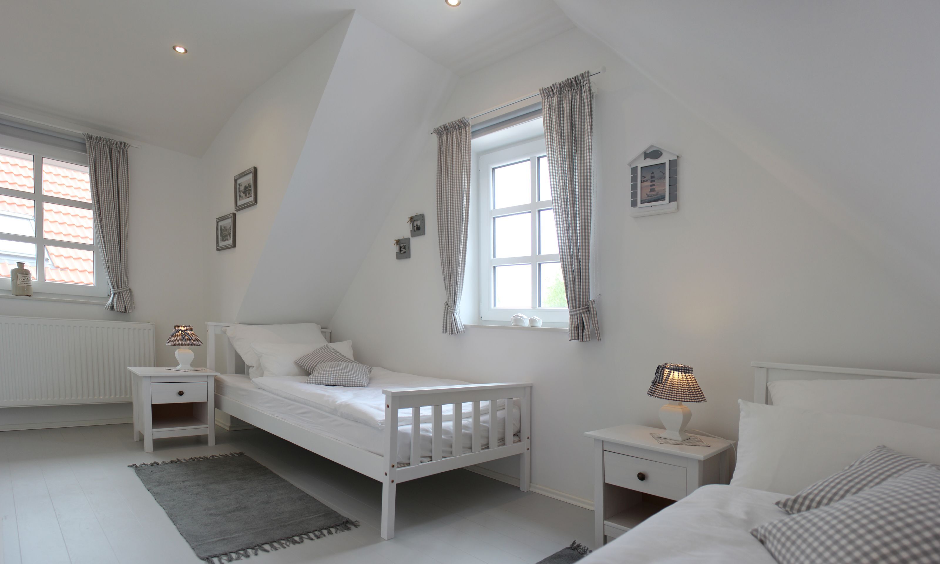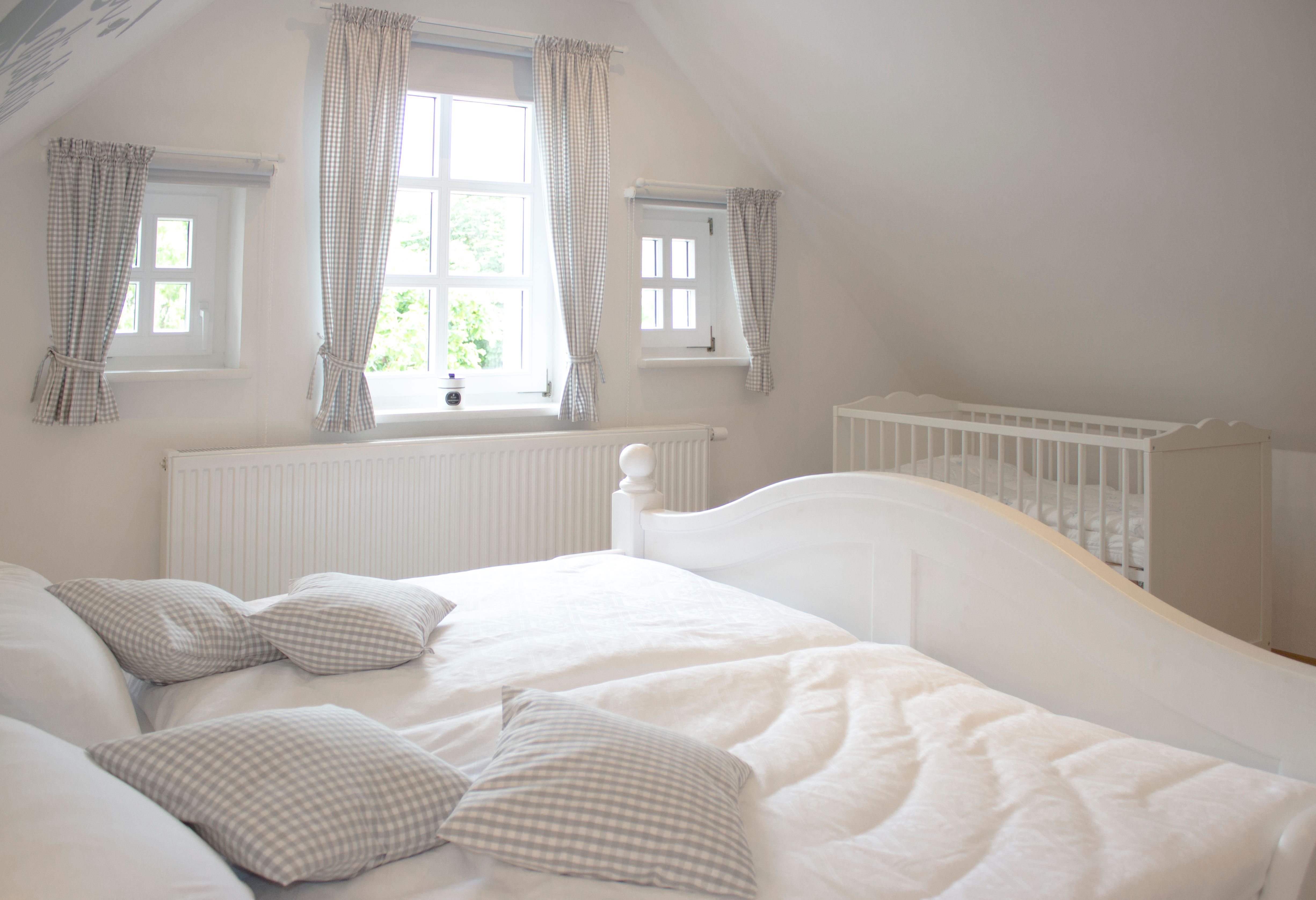 Im gut isolierten Obergeschoss befinden sich zwei großzügige Schlafzimmer und ein separates WC. Das Elternschlafzimmer mit Echtholzparkett und Blick auf die Harle verfügt über ein komfortables Doppelbett, ein Kinderbett und viel Stauraum. Im zweiten Schlafzimmer stehen Twin-Betten für Sie bereit.