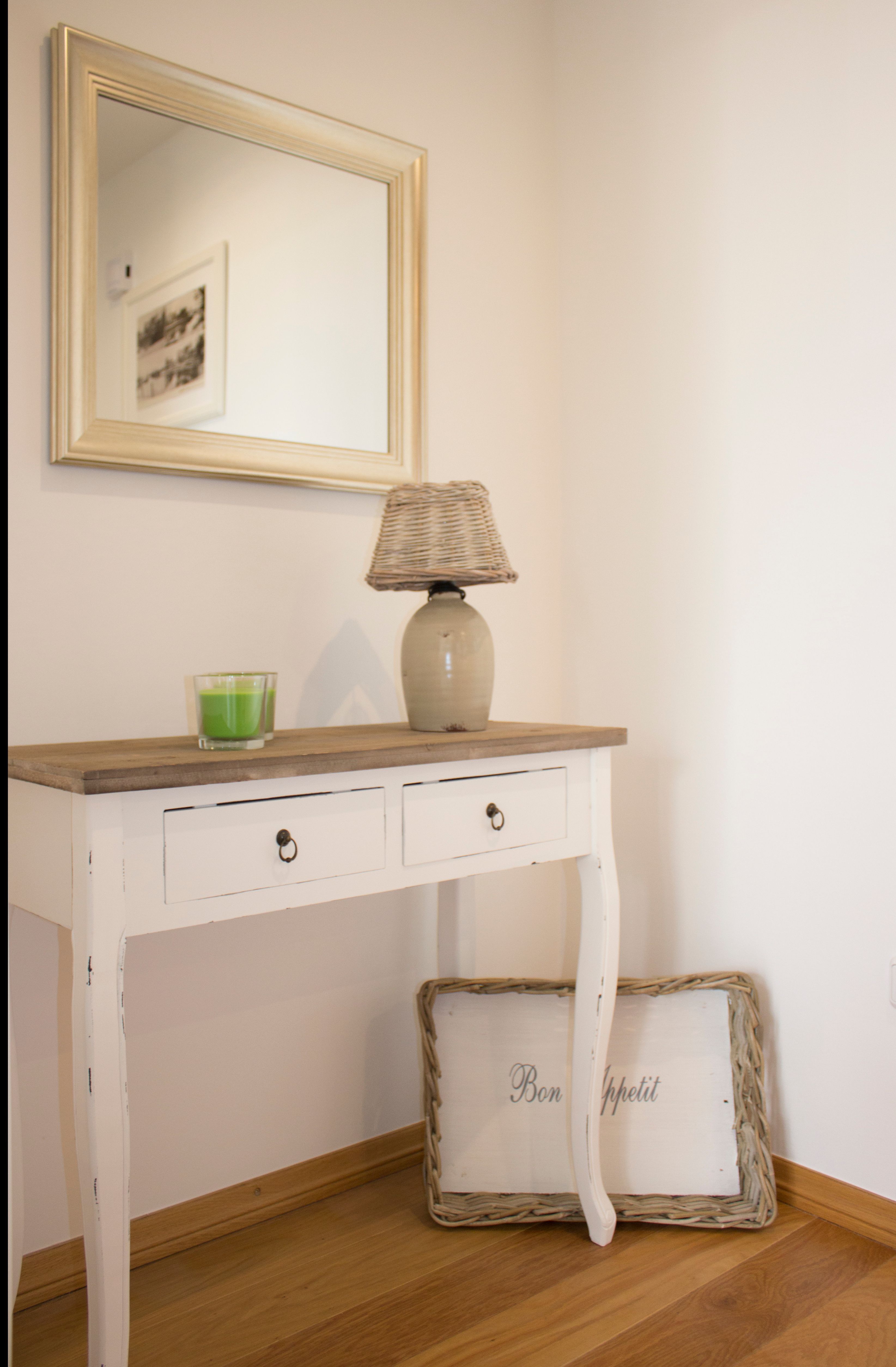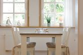 Vom einladend gestalteten Eingangsbereich gelangen Sie in das großzügige Wohn- und Esszimmer mit direktem Blick auf die Harle mit der historischen Zugbrücke. Der Wohnbereich ist mit Echtholzparkett ausgestattet und verfügt über eine gemütliche Couchecke mit Flachbild TV, weiße Landhausmöbel, einen Essbereich für 4 Personen und einen freistehenden Kamin.