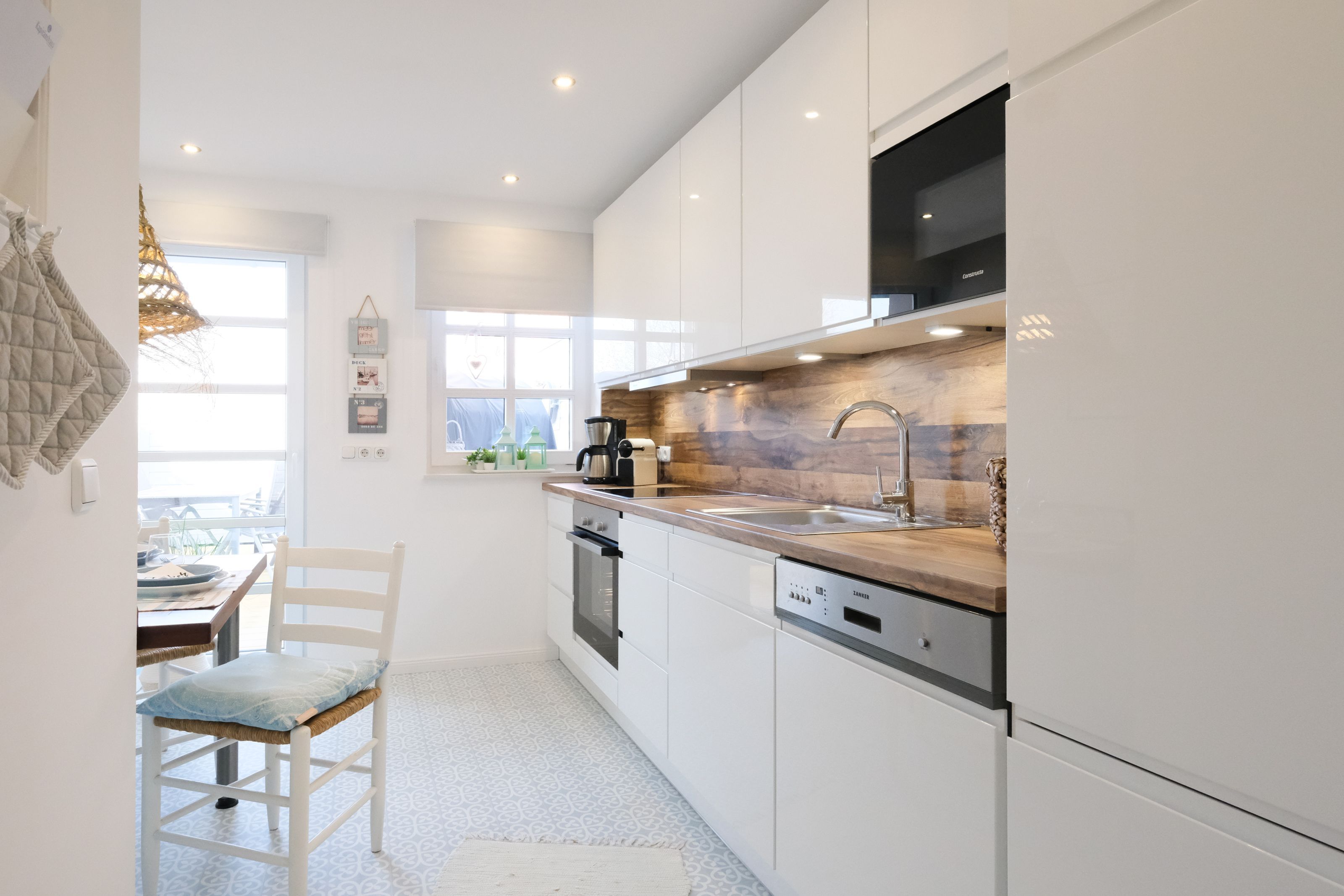 Im Erdgeschoss befindet sich die moderne, voll ausgestatte Küche mit direktem Zugang zur 25m² großen Terrasse. Ob Sonnenliegen, Sitzecke mit Sonnenschirm oder Strandkorb hier bleiben keine Wünsche offen!
