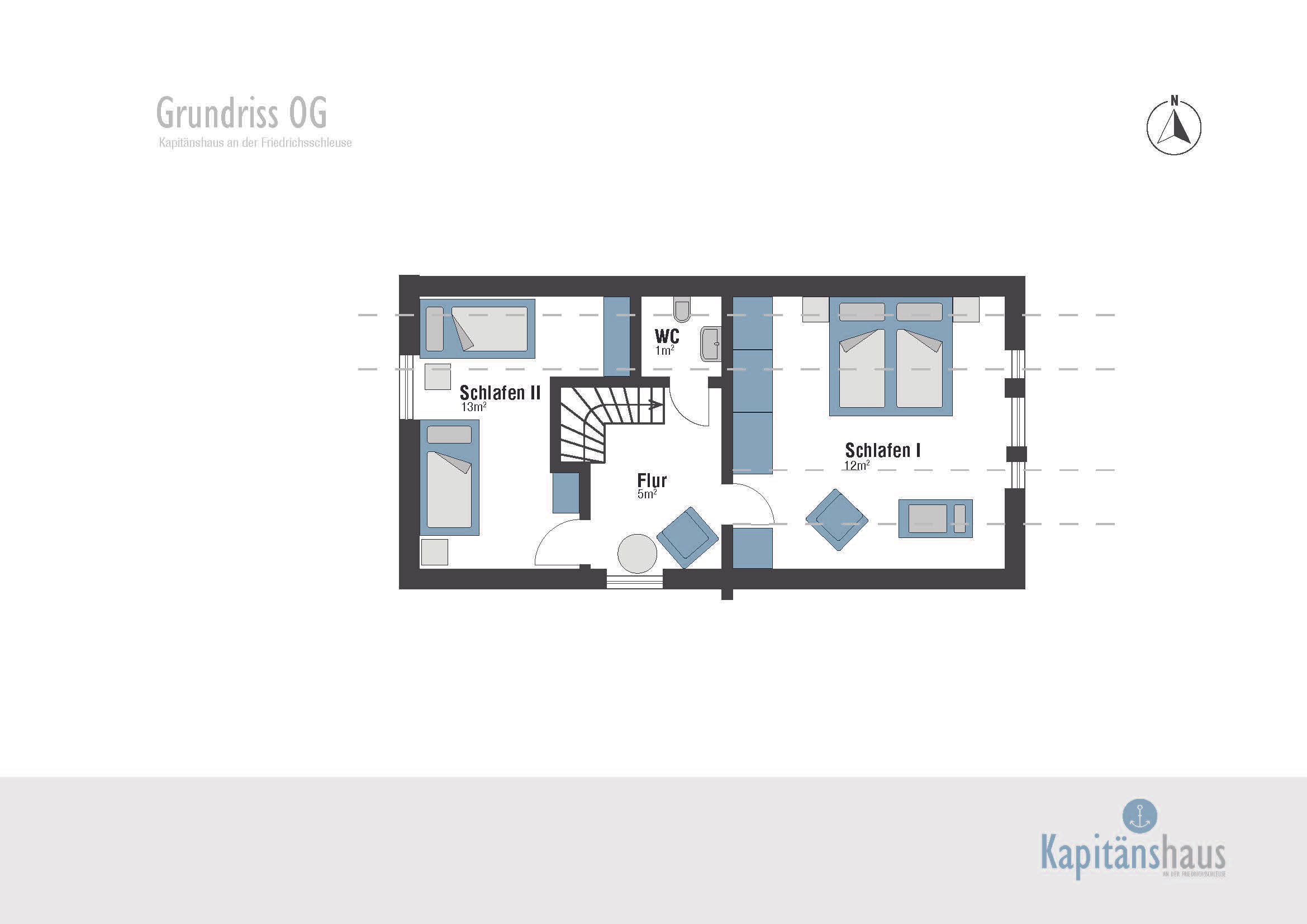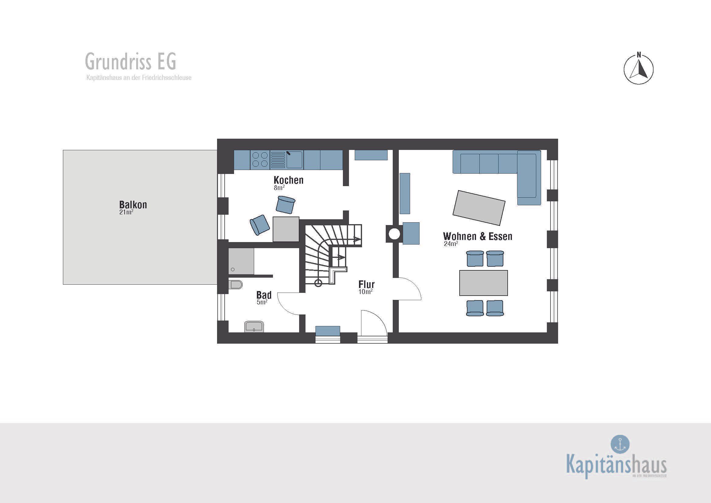 Das lichtdurchflutete Haus verfügt über drei Etagen und bietet mit über 90m² ausreichend Platz für 4 Personen. Das Kapitänshaus an der Friedrichsschleuse ist das perfekte Urlaubsdomizil für Gäste, die nach dem besonderen Etwas suchen.