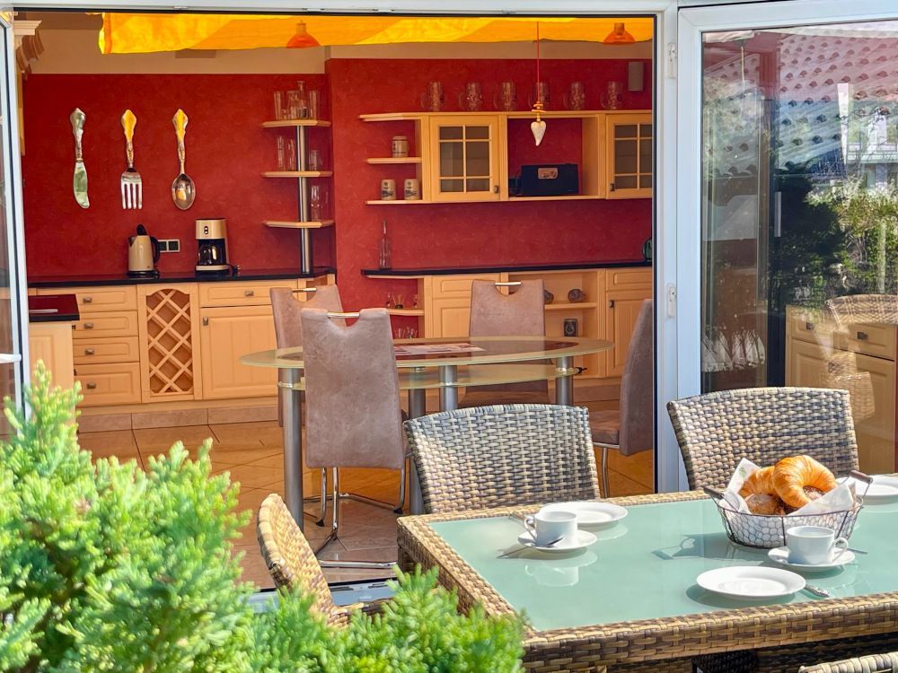 Ausstattung Wohnzimmer mit Veranda, Vollküche mit Ceranherd, Backofen, Kühlschrank, Geschirrspüler) Kaffeemaschine, Wasserkocher, Toaster. Vollbad mit Badwanne und Dusche, 2 getrennte Schlafzimmer mit Doppelbetten, großzügiger südlich ausgerichteter Balkon, W-LAN frei, Parkplatz direkt am Haus, Strom, Wasser, Heizung im Preis enthalten.