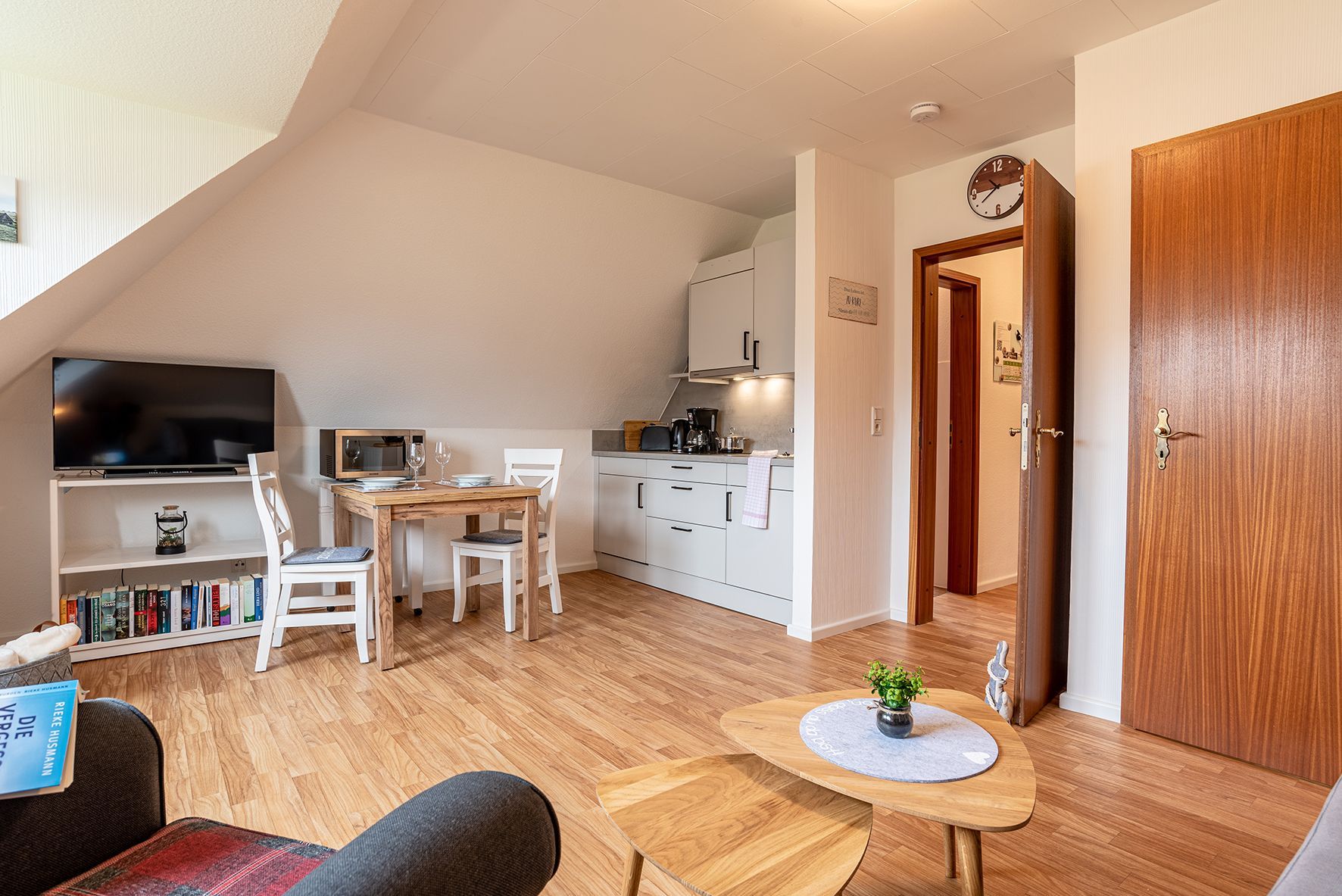 Diese Obergeschossferienwohnung liegt am Rande der Löwenhöhle von Wyk. Von hier aus hat man kurze Wege in die Innenstadt oder in die Dörfer. Die Wohnung verfügt über eine kleine, offene Küchenzeile. Eine kleiner Esstisch, eine Kaffeemaschine, Mikrowellenbackofen, Toaster und ausreichend Geschirr, Gläser, Teller, Becher etc. für bis zu 2 Personen gehören zur Ausstattung.