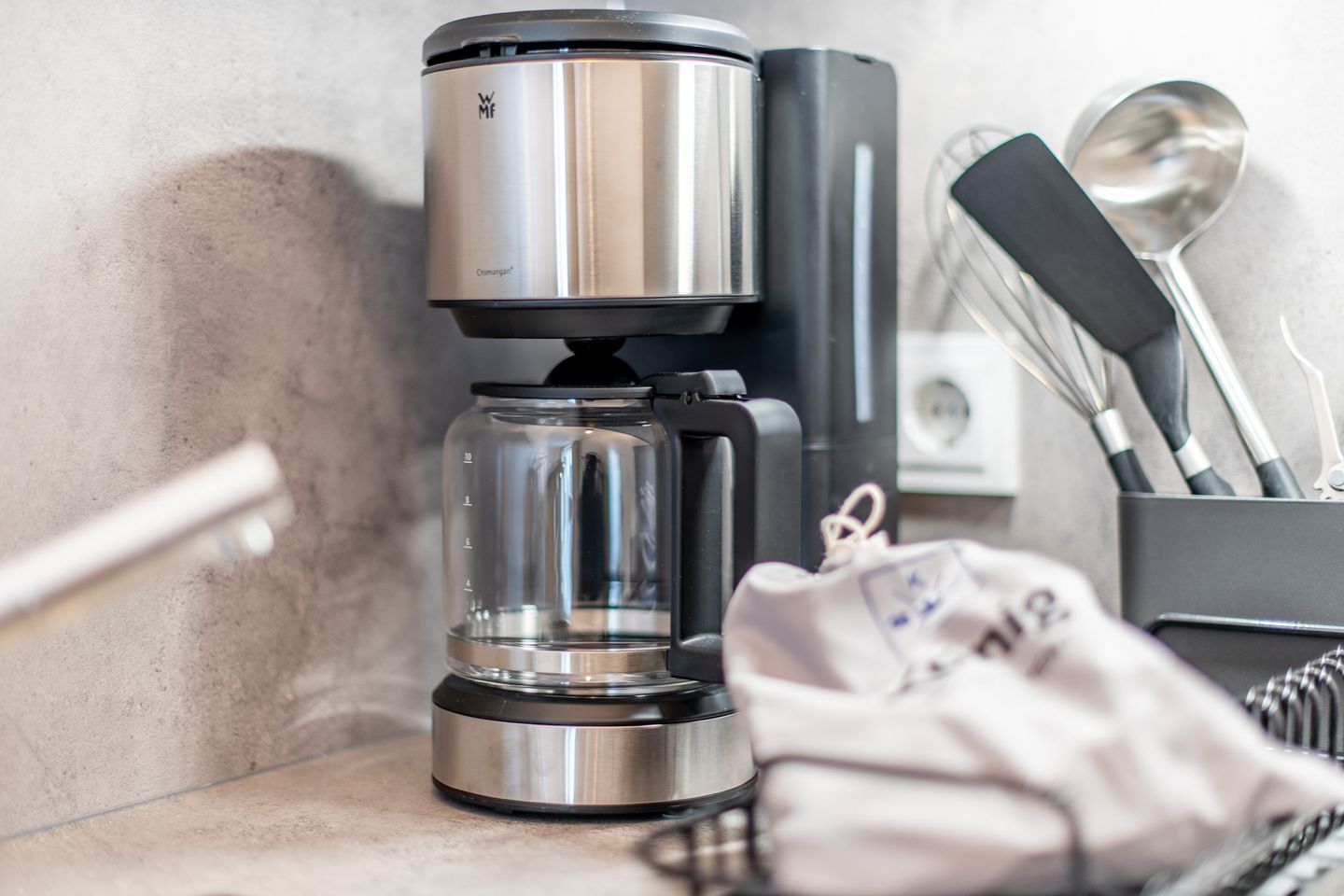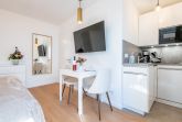 Die moderne, offene Küchennische ist mit allen notwendigen Annehmlichkeiten ausgestattet, sodass Sie mühelos kleine Mahlzeiten zubereiten können. Der angrenzende Essbereich eignet sich ideal für gemütliche Frühstücke oder einen Kaffee am Morgen.