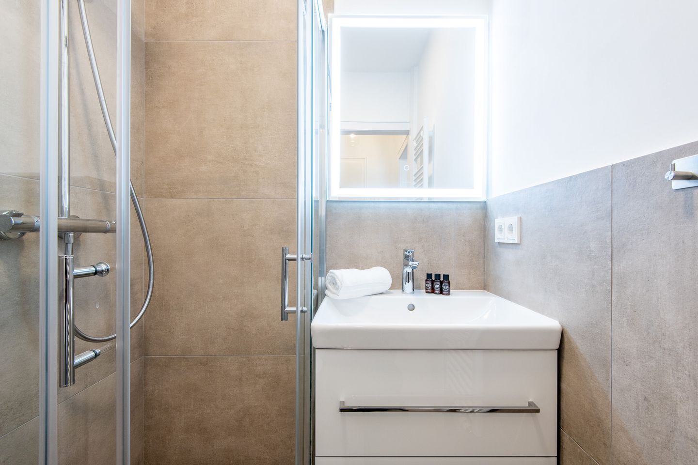 Das Badezimmer wurde stilvoll modernisiert und bietet eine bodengleiche Dusche, einen Handtuchwärmer und einen Föhn. Hier können Sie sich nach einem erlebnisreichen Tag auf der Insel erfrischen und zur Ruhe kommen.