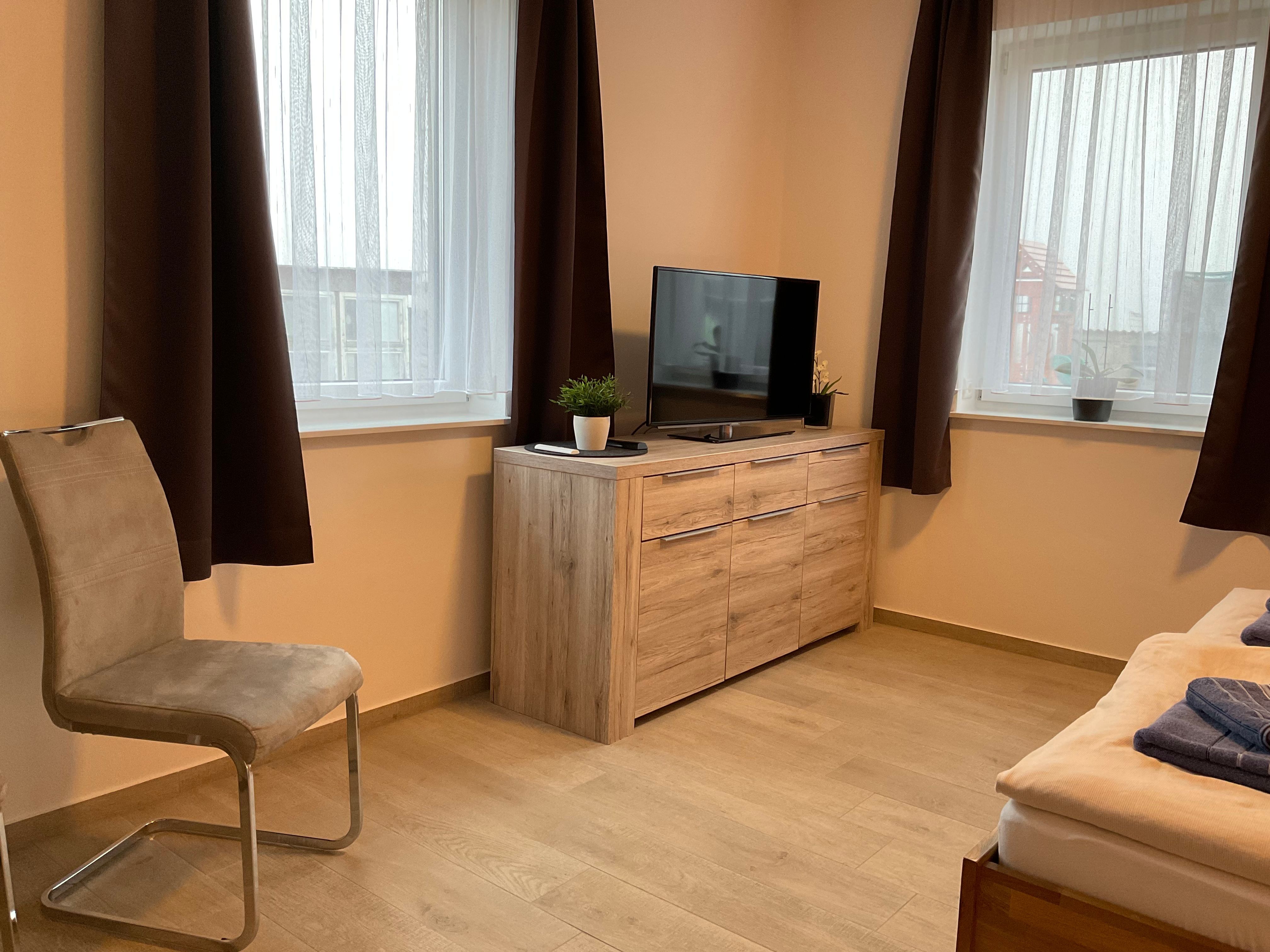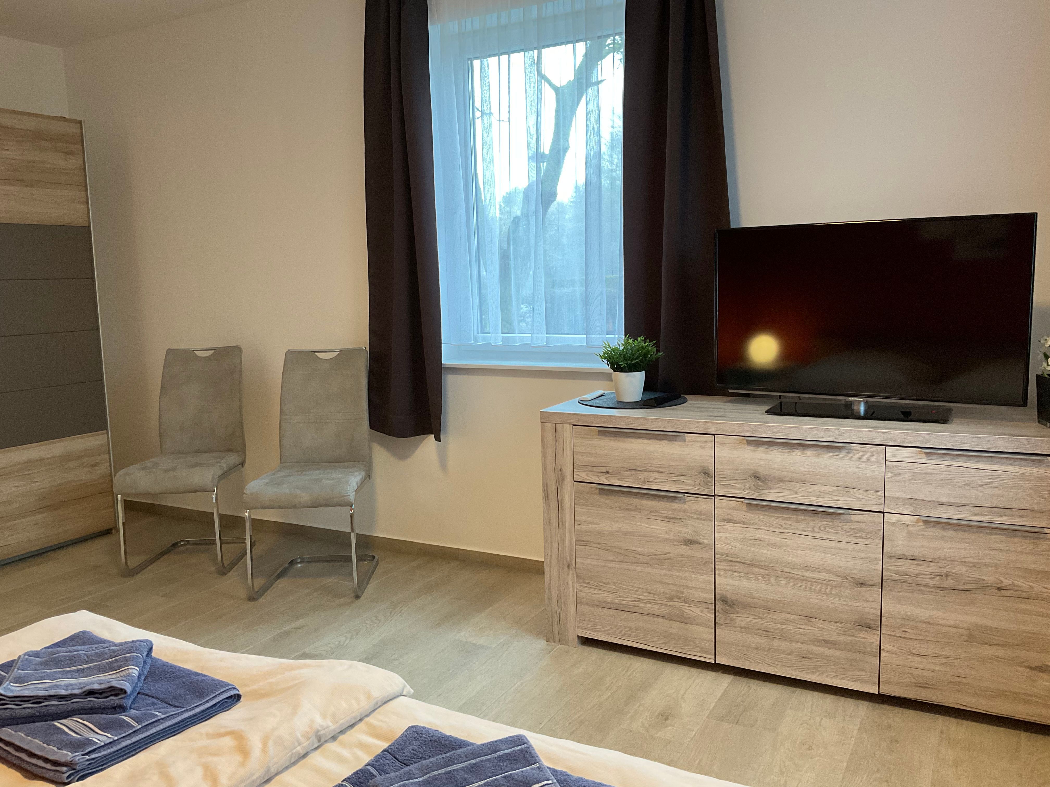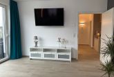 Ihnen steht neben der großen Küche mit Esstisch ein Schlafzimmer mit Doppelbett, TV und Kleiderschrank sowie ein Wohn/Schlafzimmer mit Schlafsofa und TV zur Verfügung. Im großen Duschbad befindet sich ein Waschtisch, eine offene Dusche und das WC. Eine große, möblierte Terrasse lädt zu gemütlichen Abenden ein.