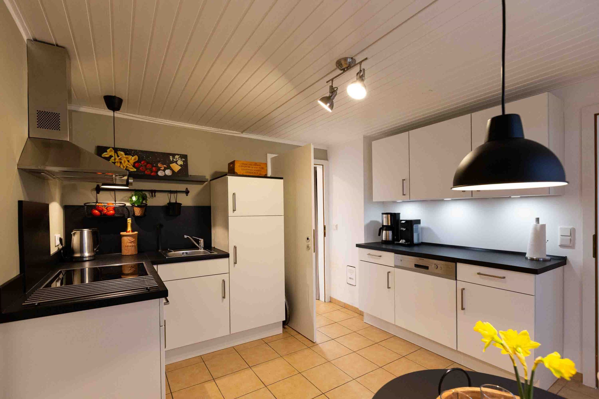 Das Wohnzimmer verfügt über ein Ecksofa, Sessel, Kabel-TV, Bluetooth-Soundanlage, Esstisch und Kaminofen. Zugang zur Süd-Terrasse mit Strandkorb, Kohlegrill und weiterem Freisitz im großen Garten. Die separate Küche ist hochwertig ausgestattet.
