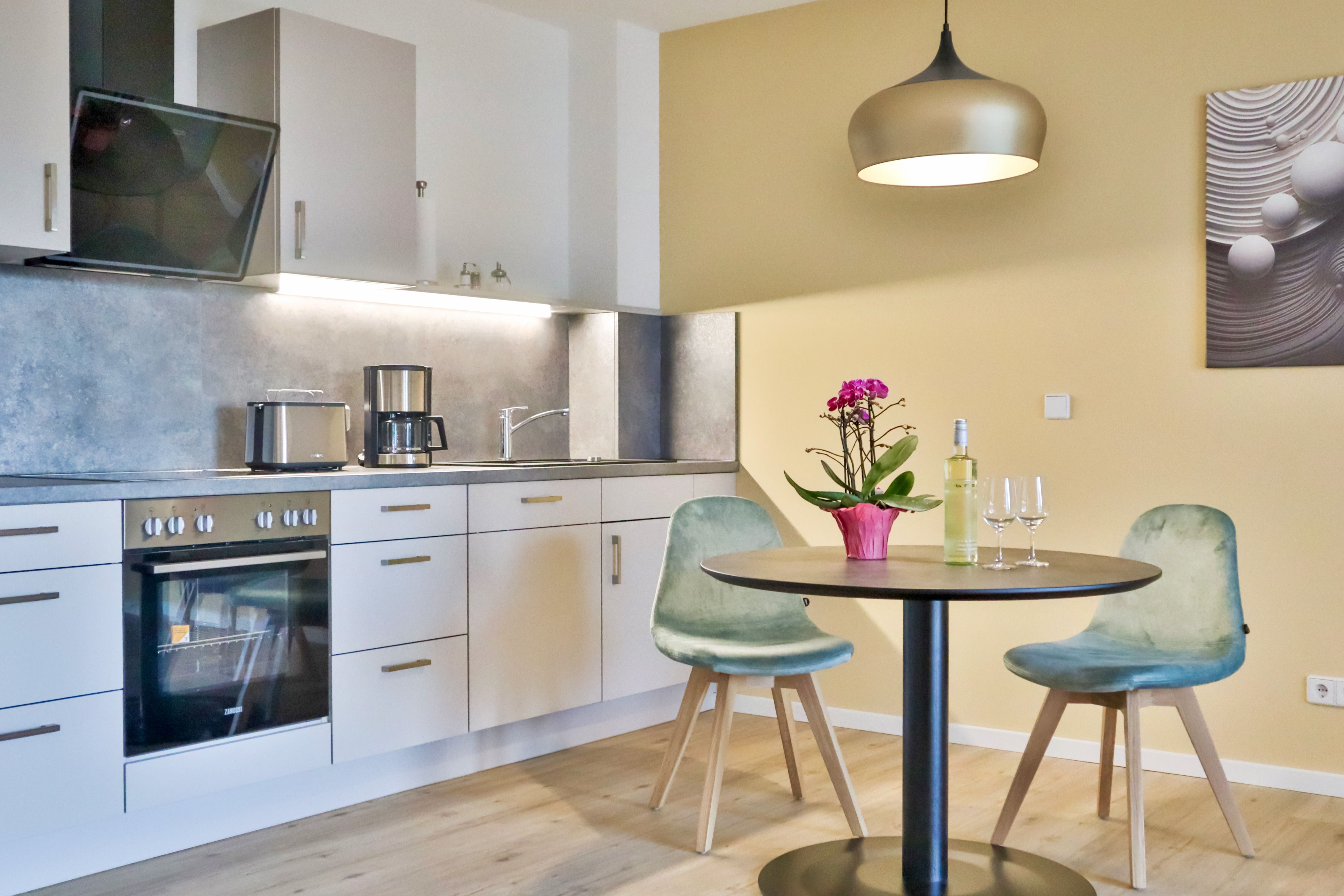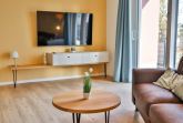 Ausgezeichneten Schlafkomfort bieten in allen Appartements Hotelbetten mit hochwertigen orthopädischen Matratzen. In allen Räumen beeindruckt das offene Wohnkonzept, dass harmonisch auf die Einrichtung abgestimmt und durch ausgewählte Bilder und Kunstobjekte unterstrichen wird.